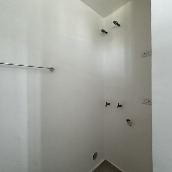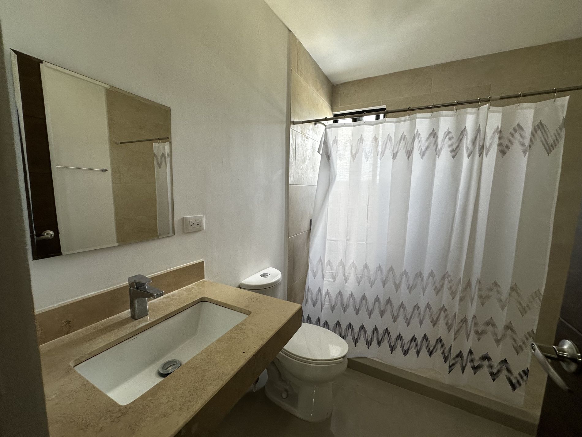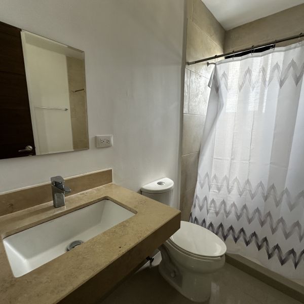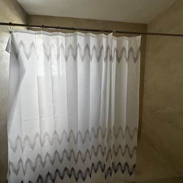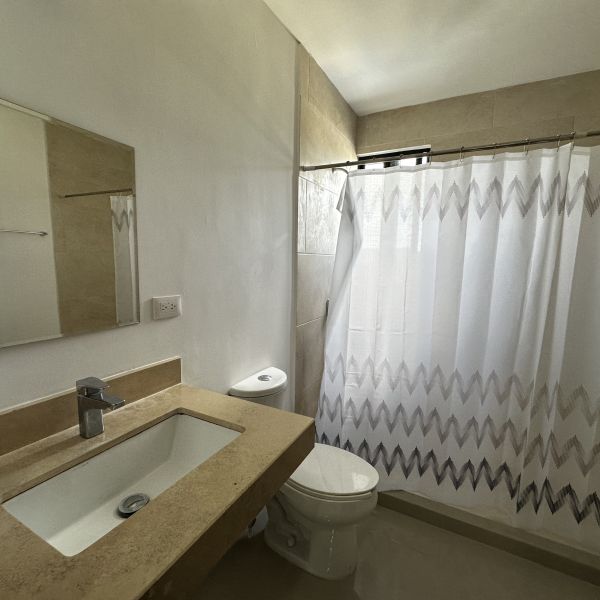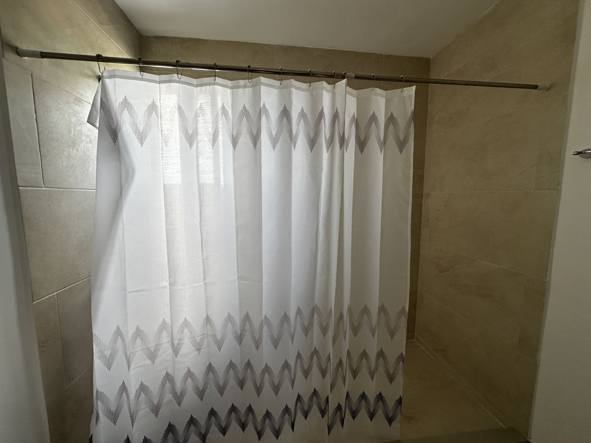 Amplio baño completo con cortina de ducha, e instalaciones de área de lavado.