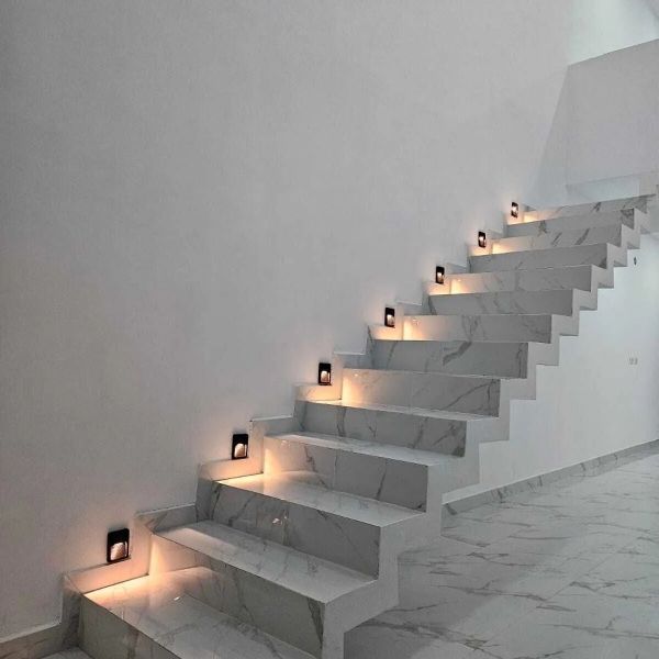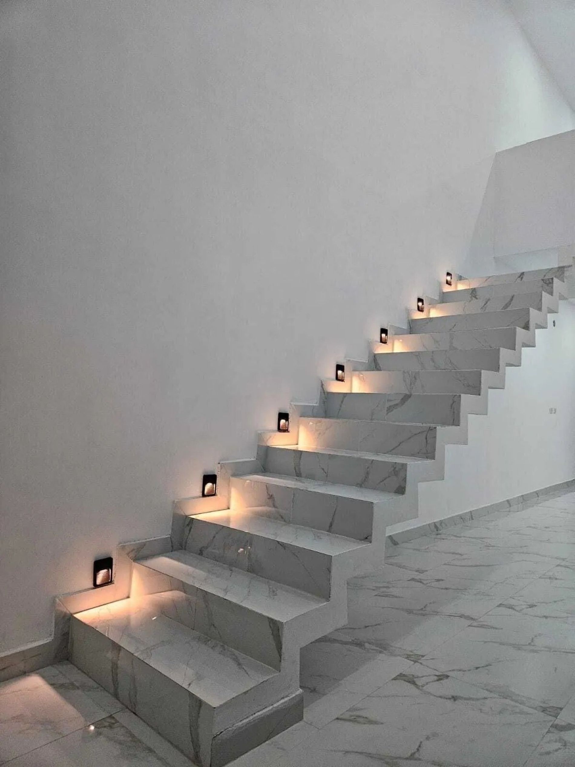 Escalera con barandal de cristal y aluminio, huellas de luz incluidas.
