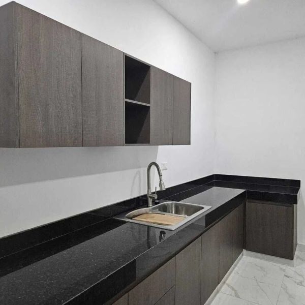 Carpintería en cocina: gavetas inferiores y superiores, espacio de alacena e isla