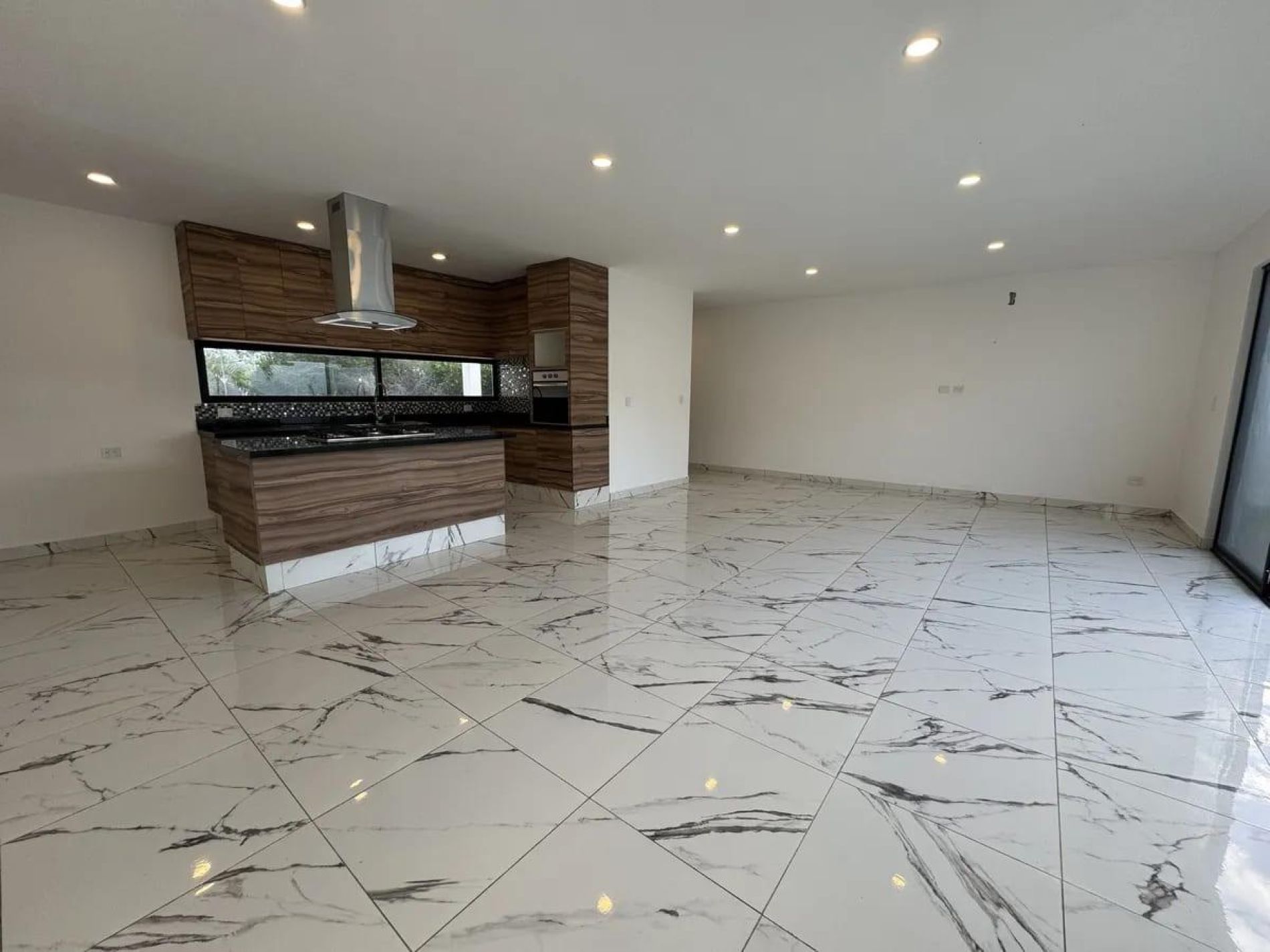 Cocina equipada con alacenas, campana, horno y barra de granito