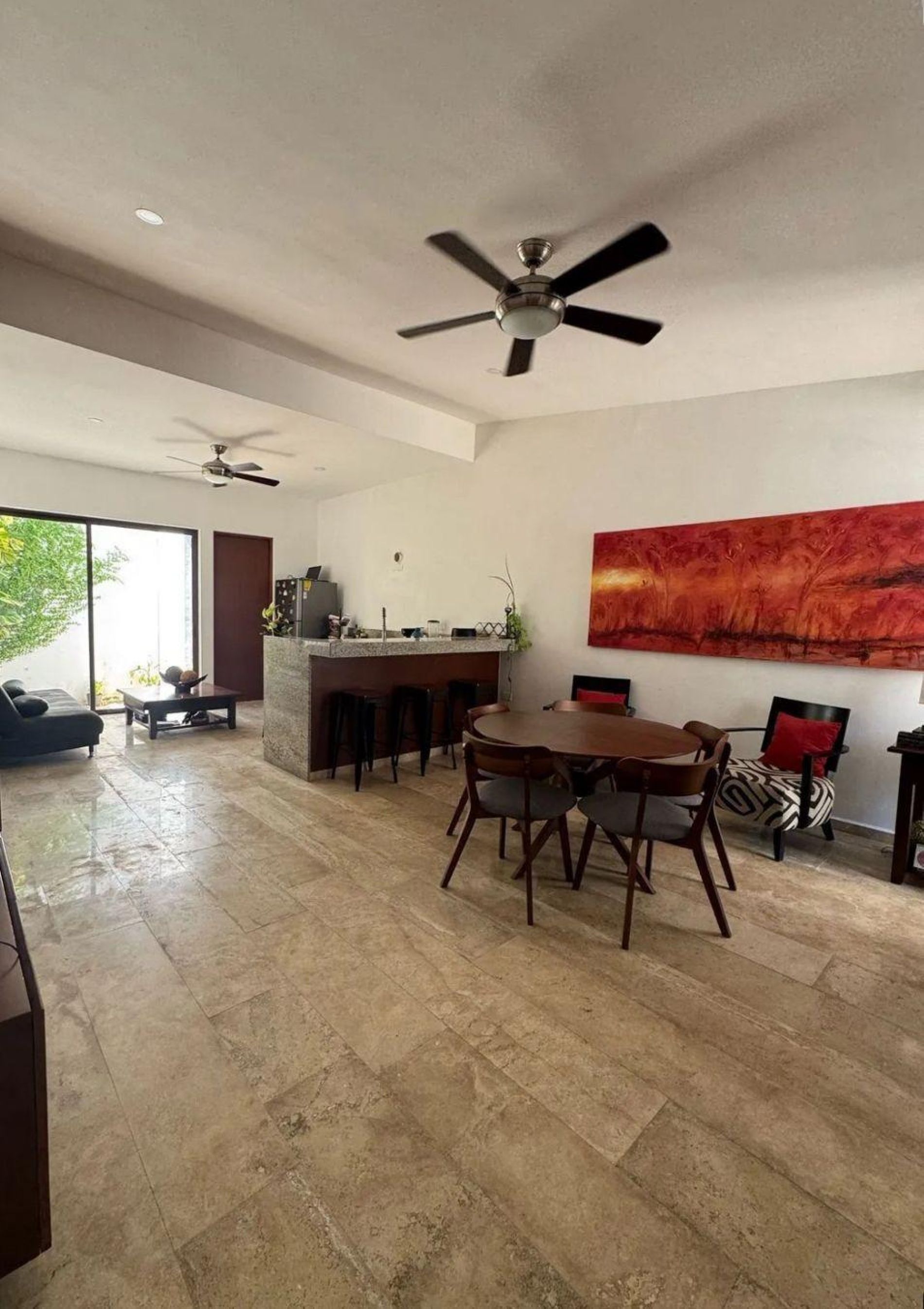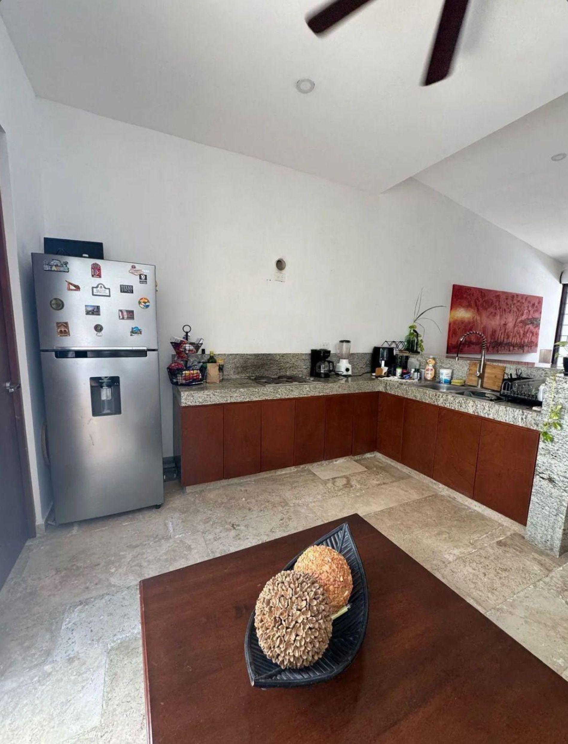 Cocina equipada con parrilla eléctrica y barra desayunadora