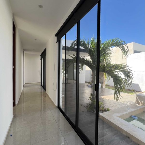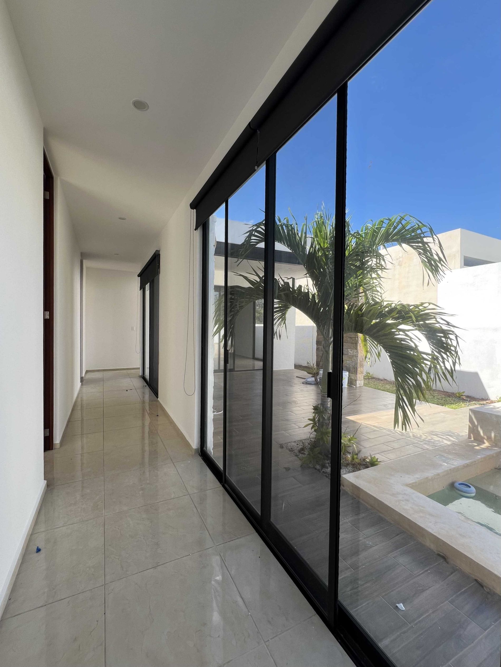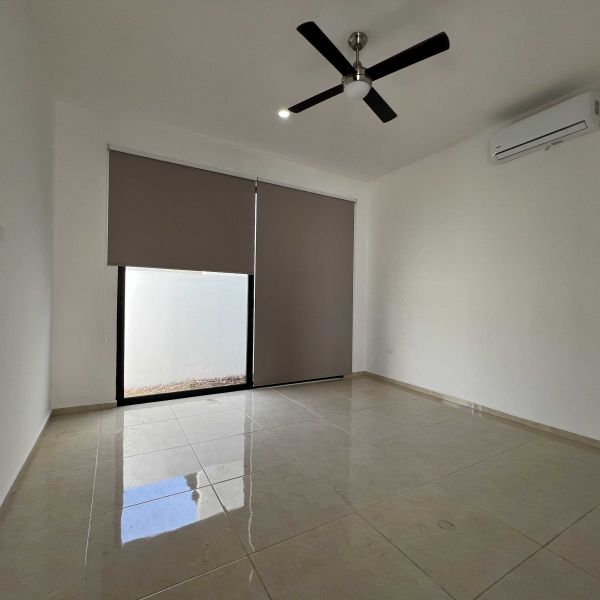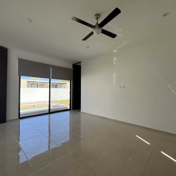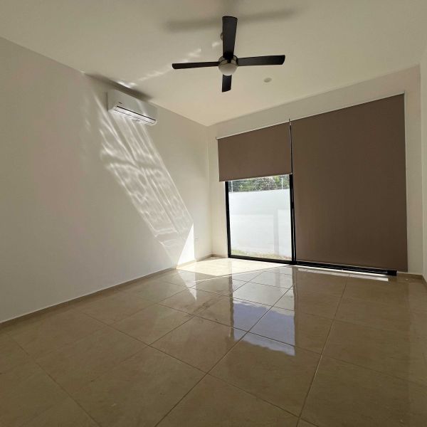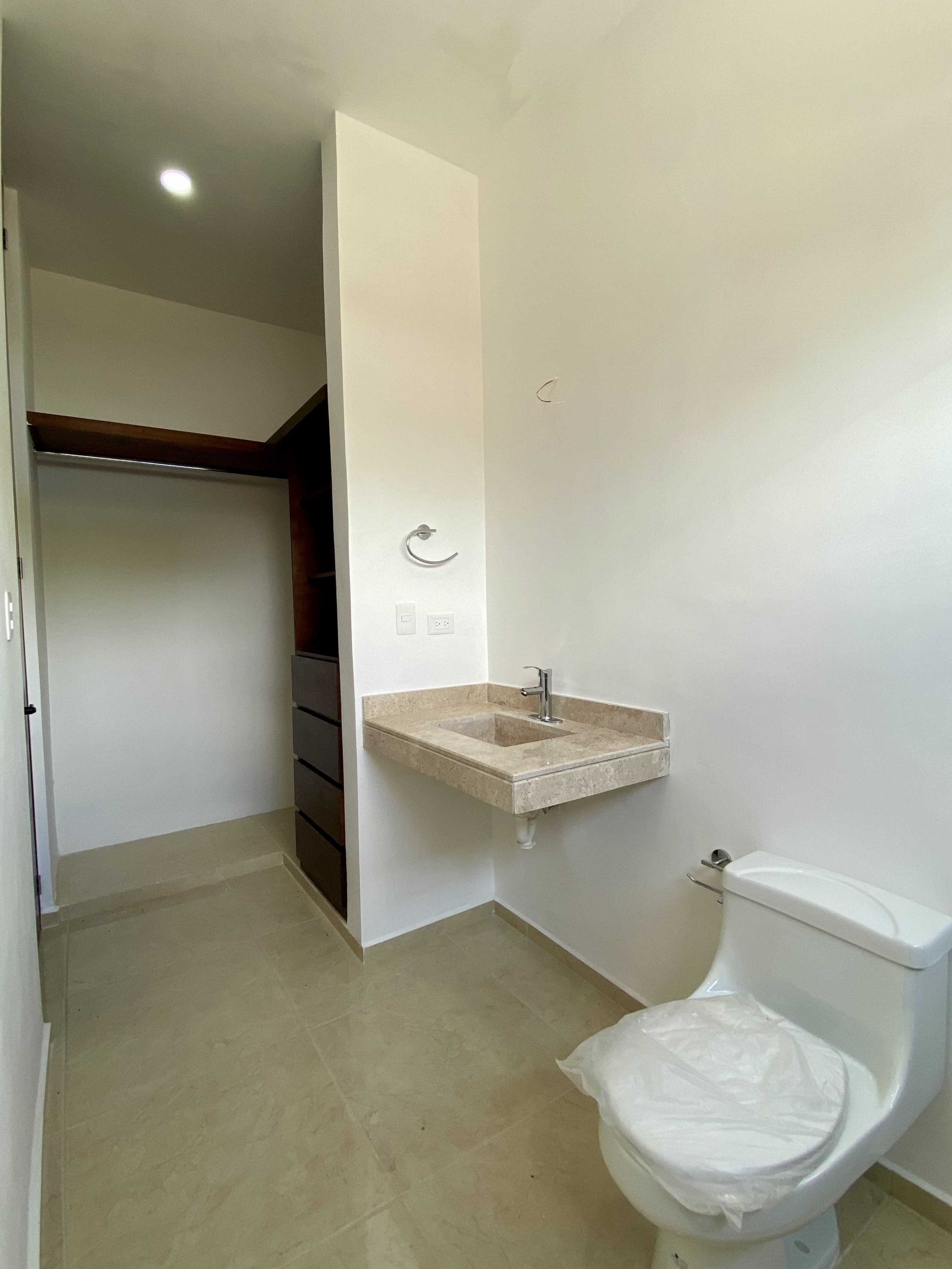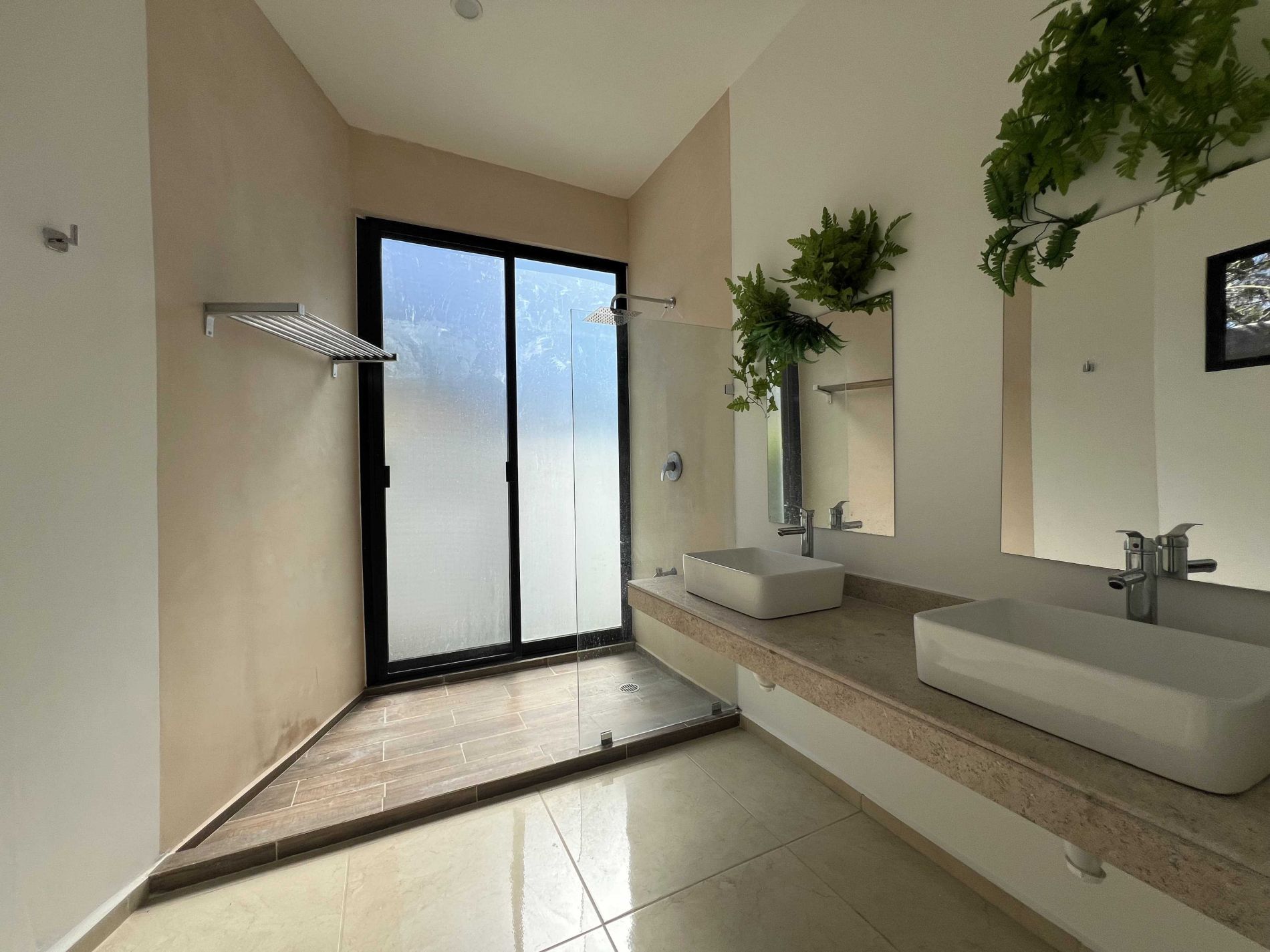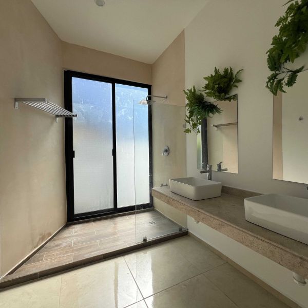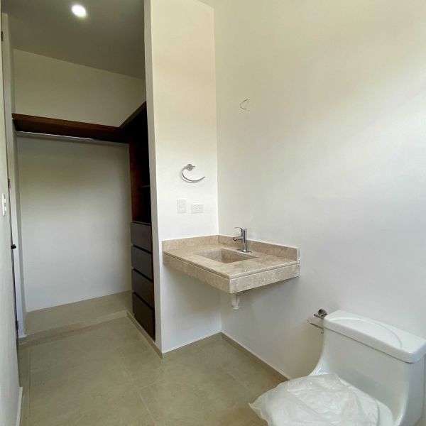 Recámara principal con closet vestidor y baño completo con doble lavabo.