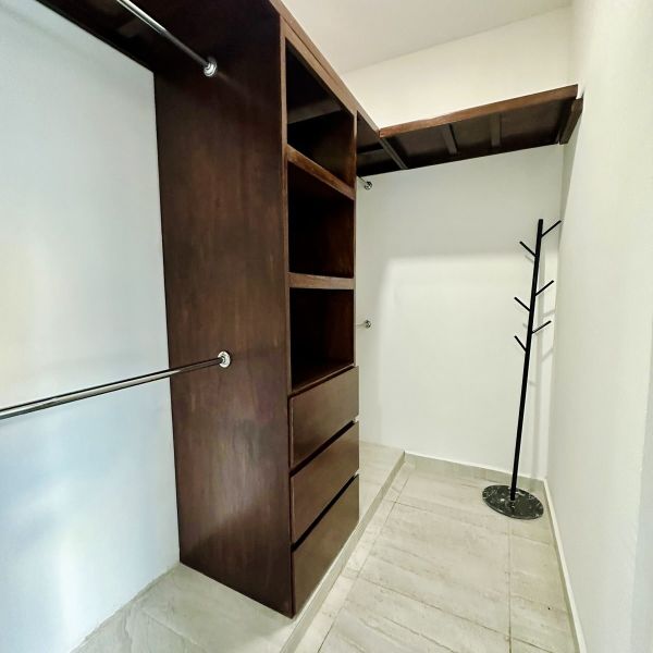 Recámara secundaria con cama king size, smart TV, closet vestidor y baño completo