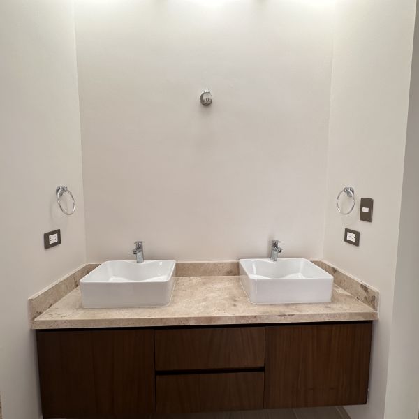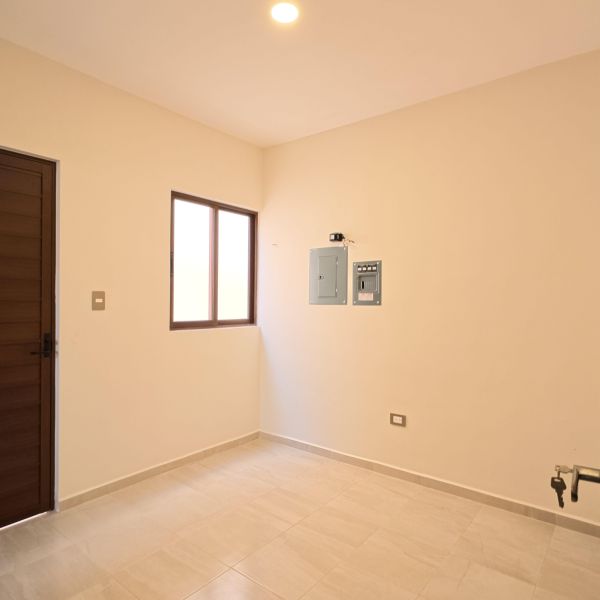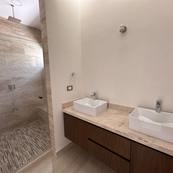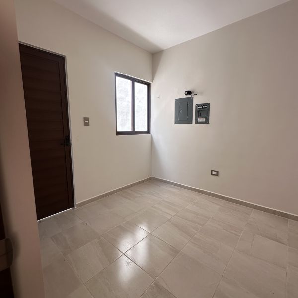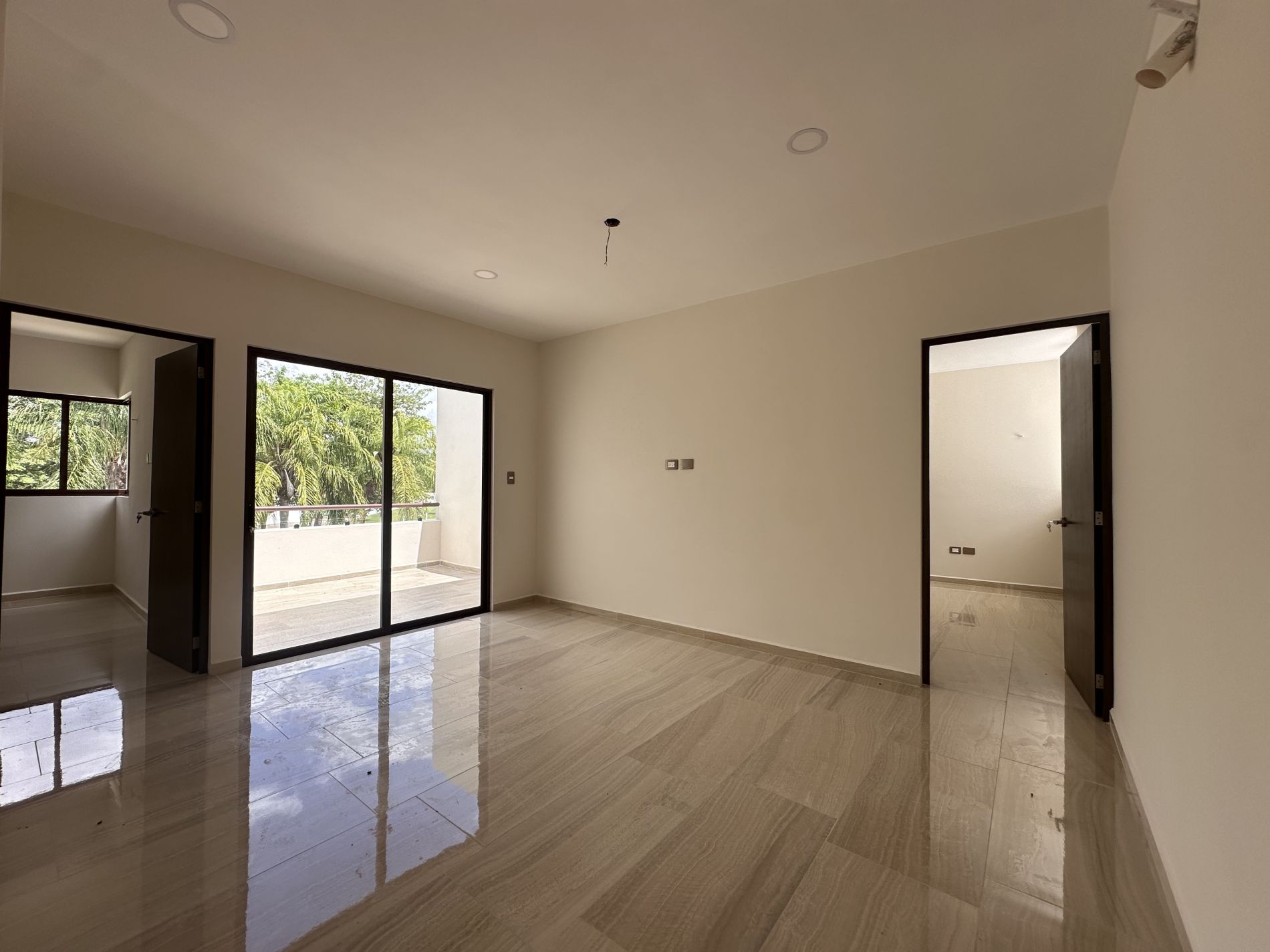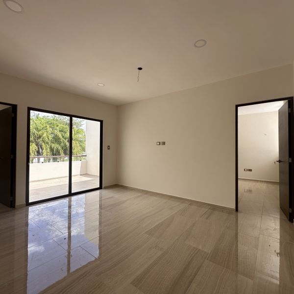 Recámara principal amplia con closet vestidor, baño y terraza trasera con vista a la piscina