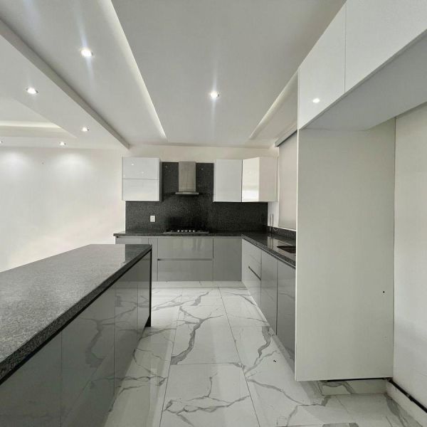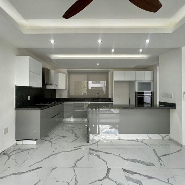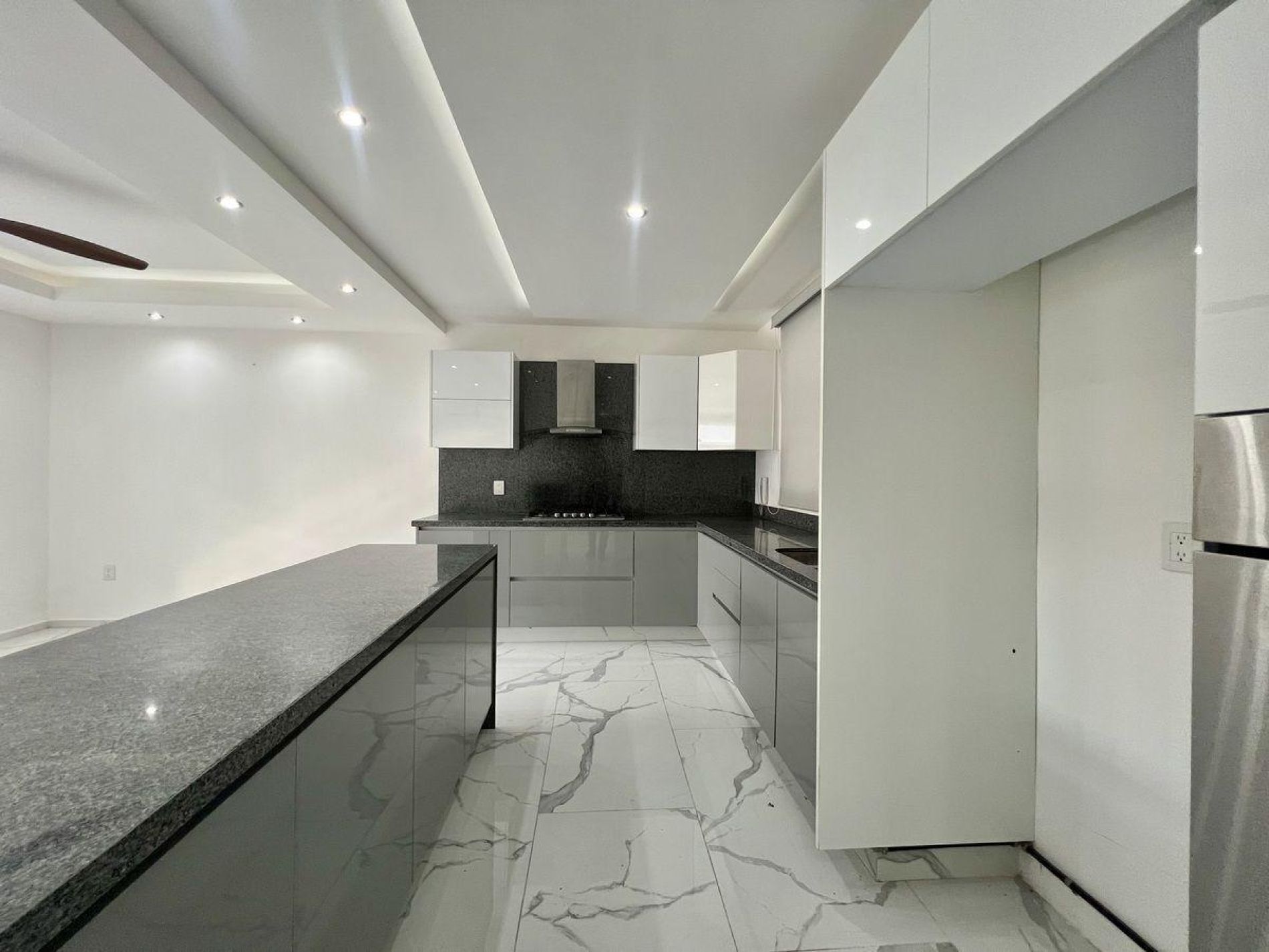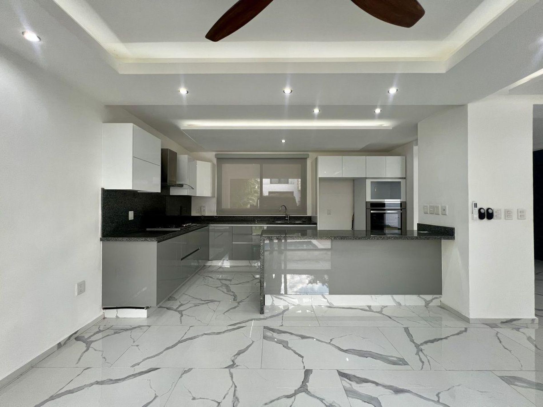 Cocina integral equipada con amplia meseta desayunadora de granito