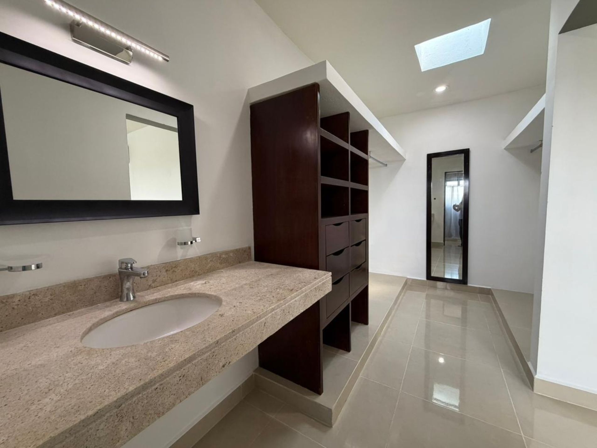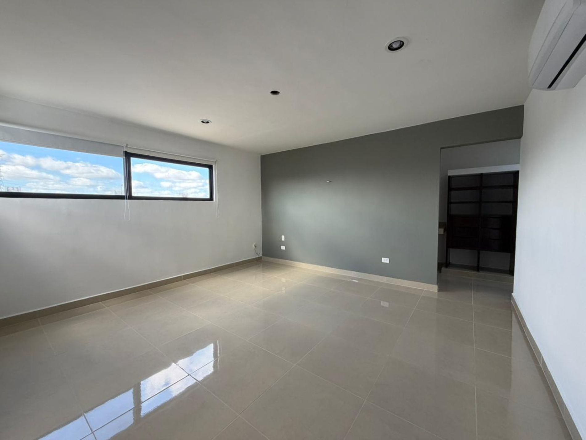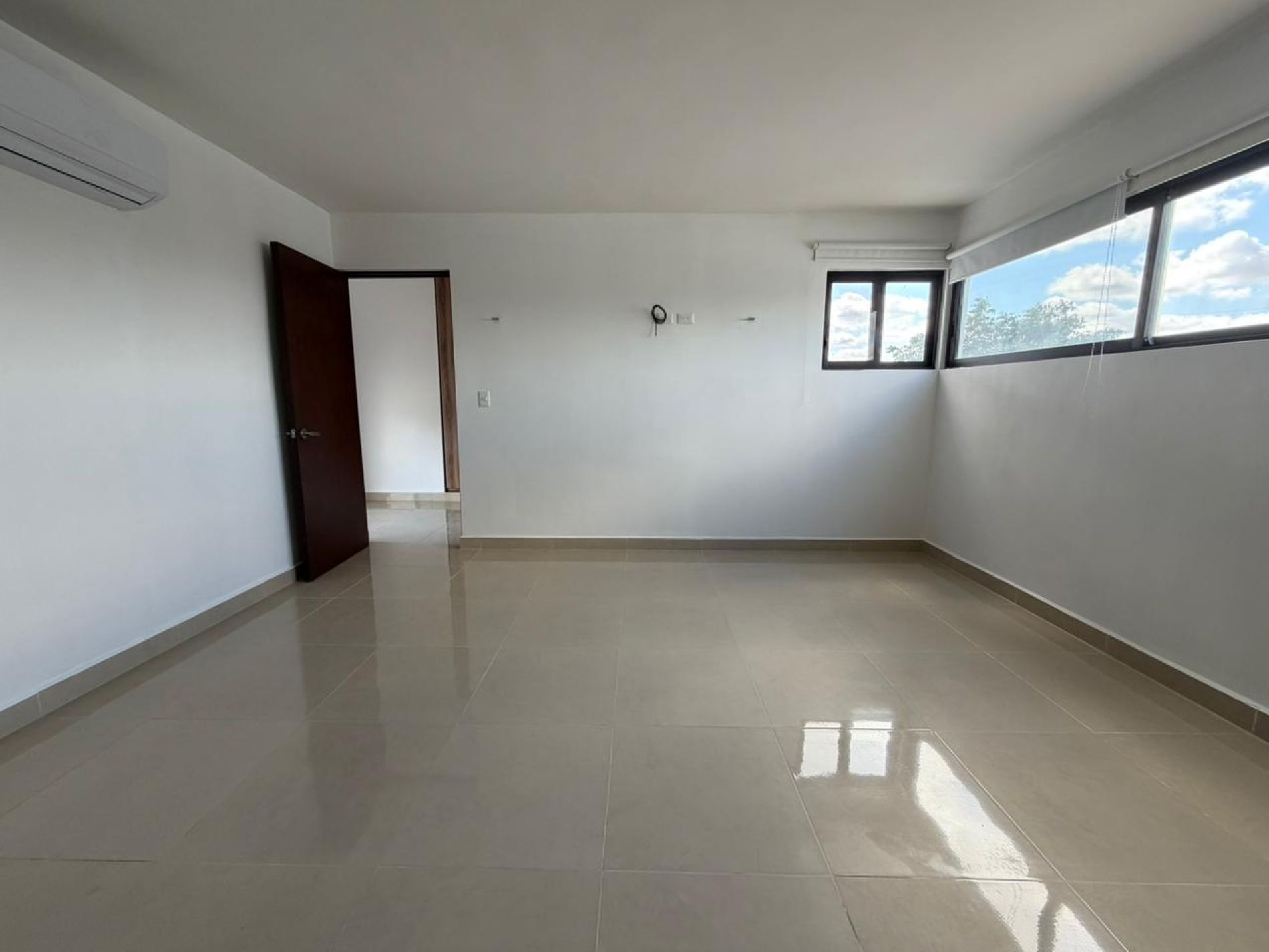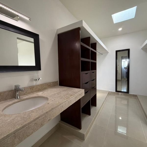 Recámara principal con clóset vestidor, baño independiente, persianas y aire acondicionado.