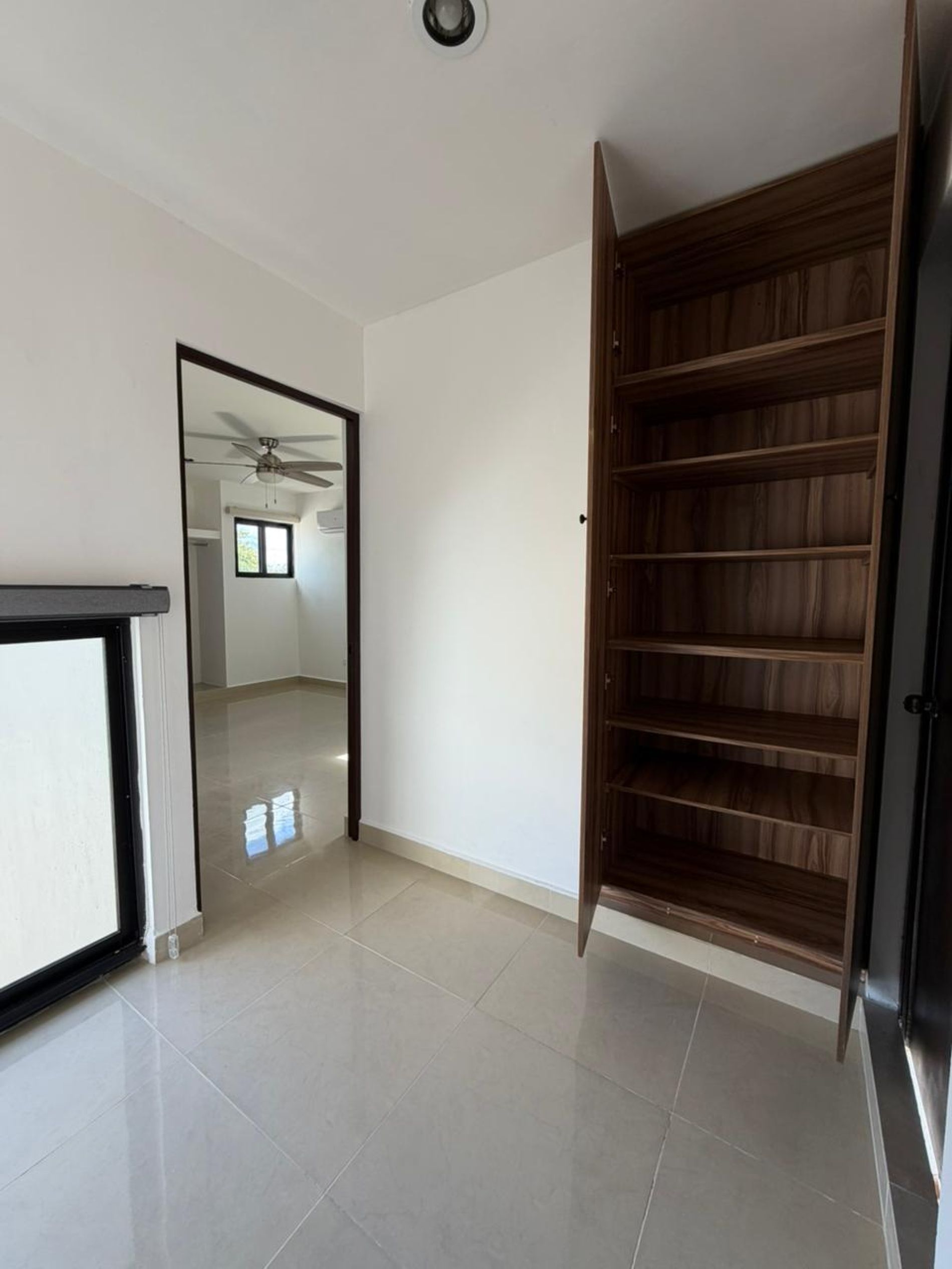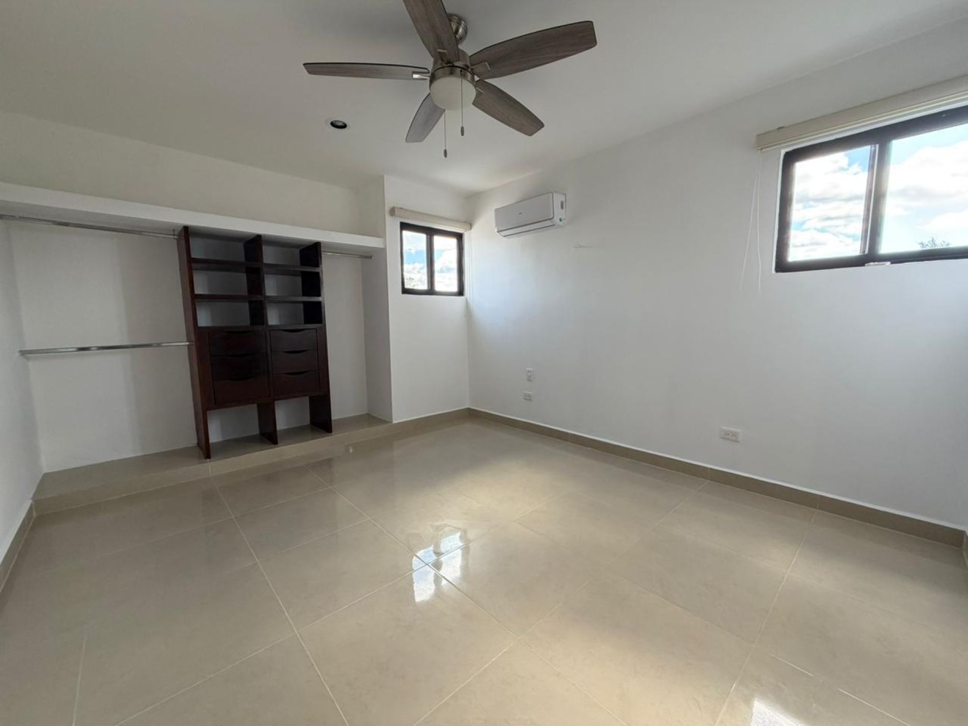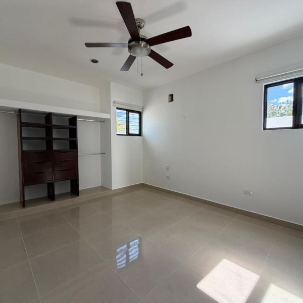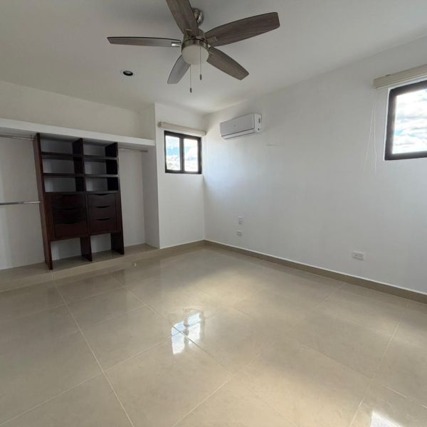 Recámara secundaria con clóset, baño completo, persianas, ventilador y aire acondicionado.