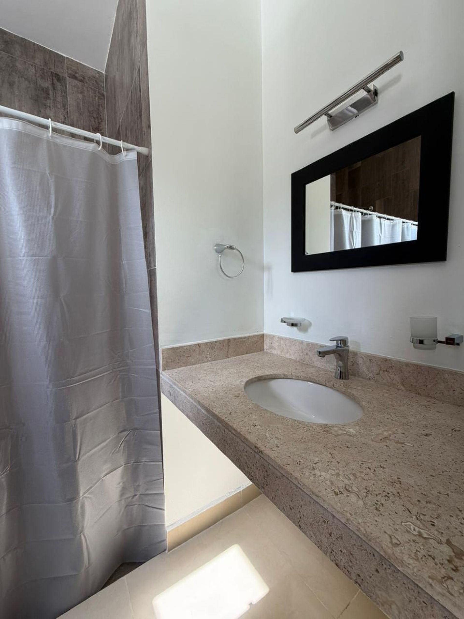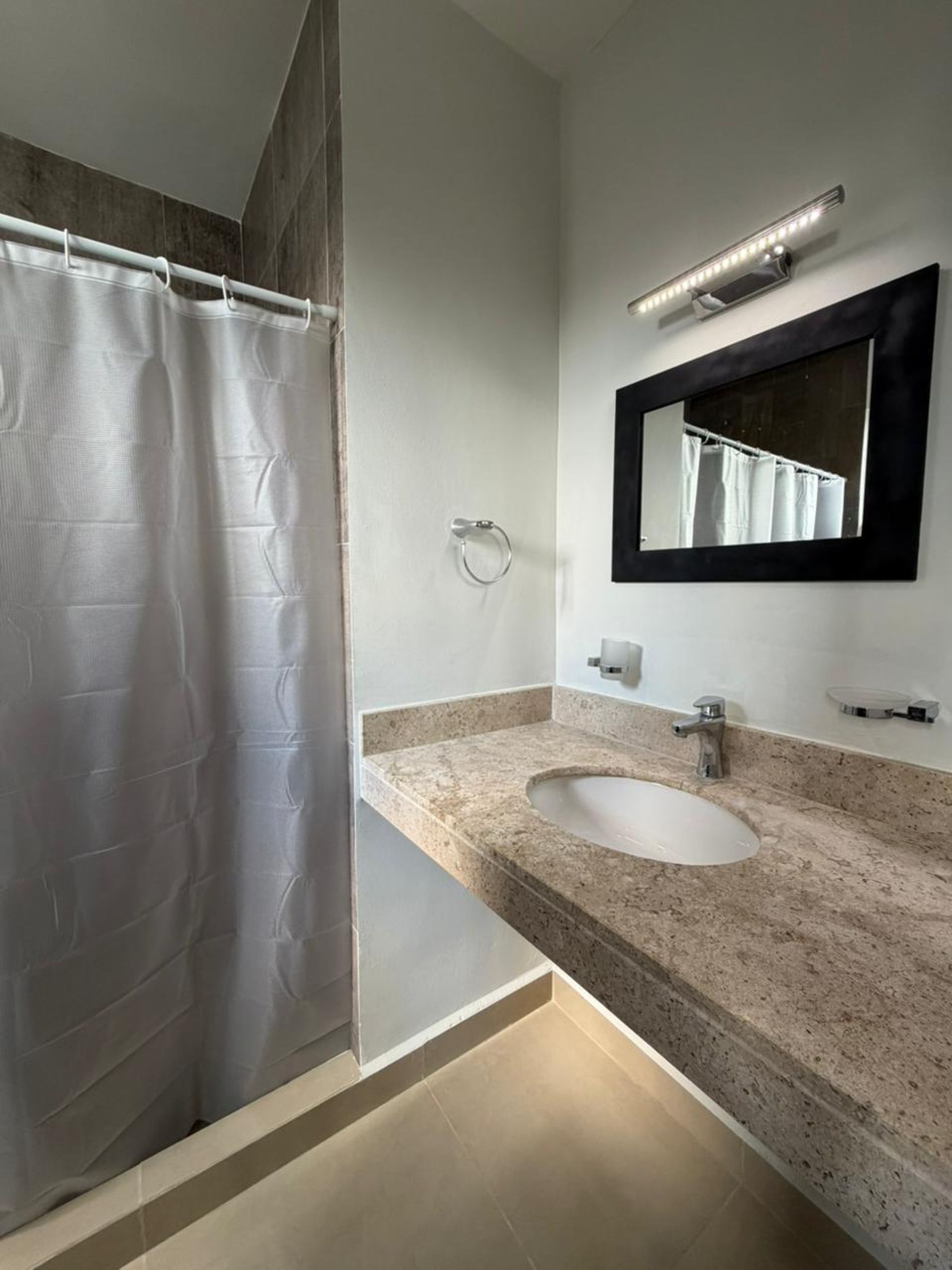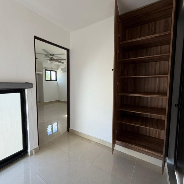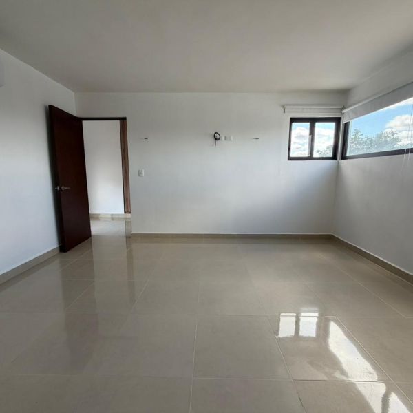 Recámara secundaria con clóset, baño completo, persianas, ventilador y aire acondicionado.