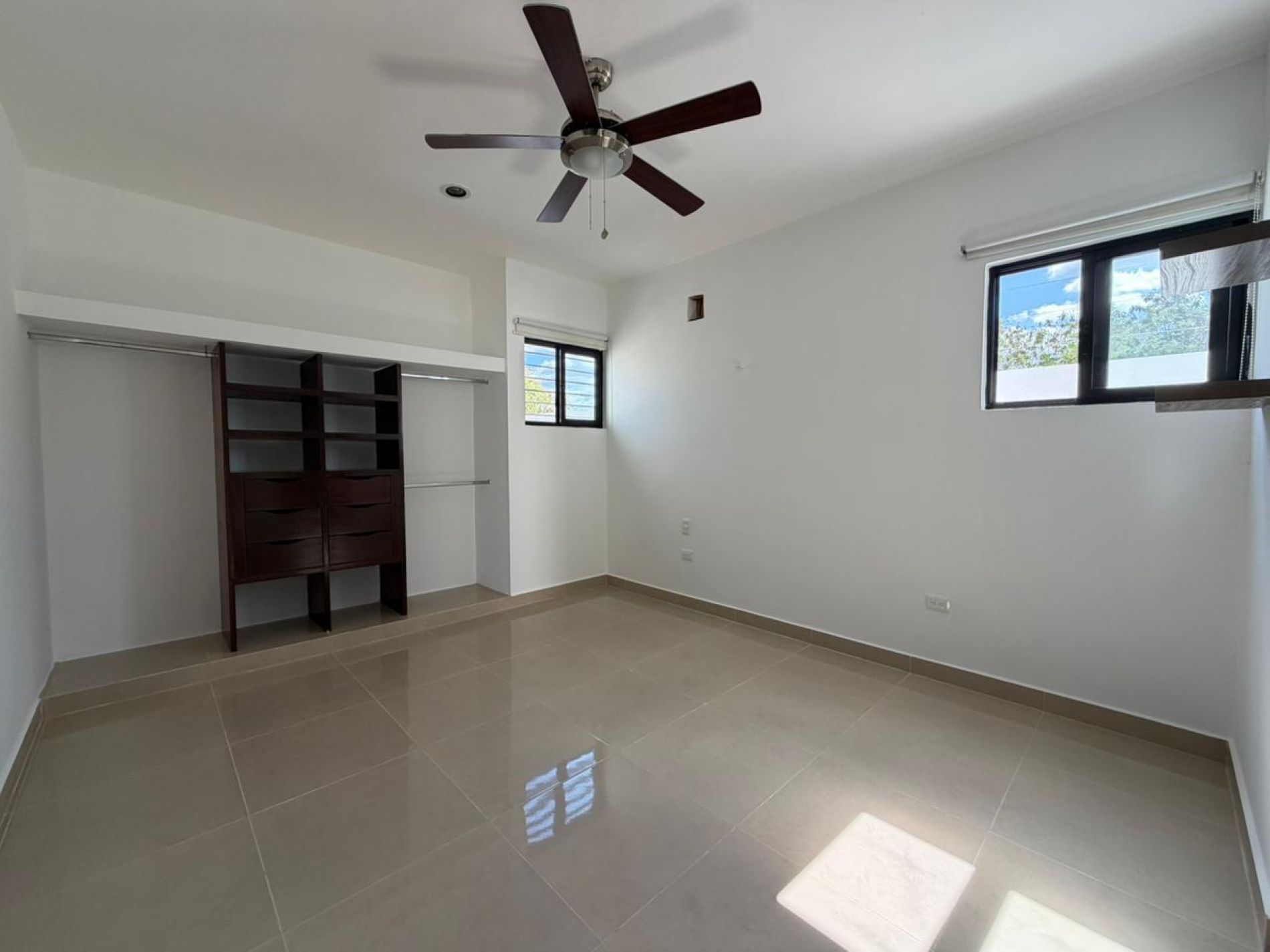 Recámara con clóset, persianas, ventilador y baño completo.