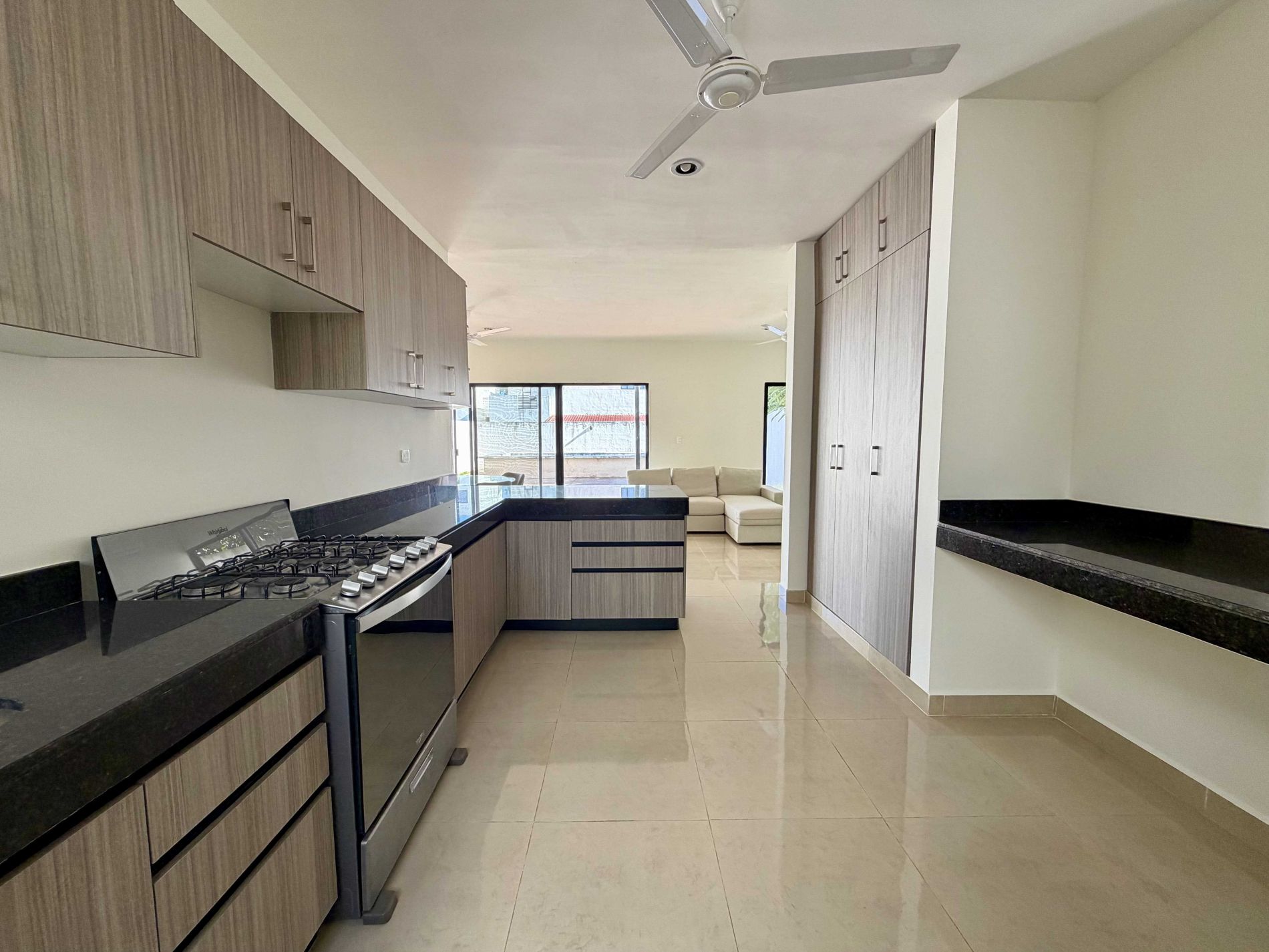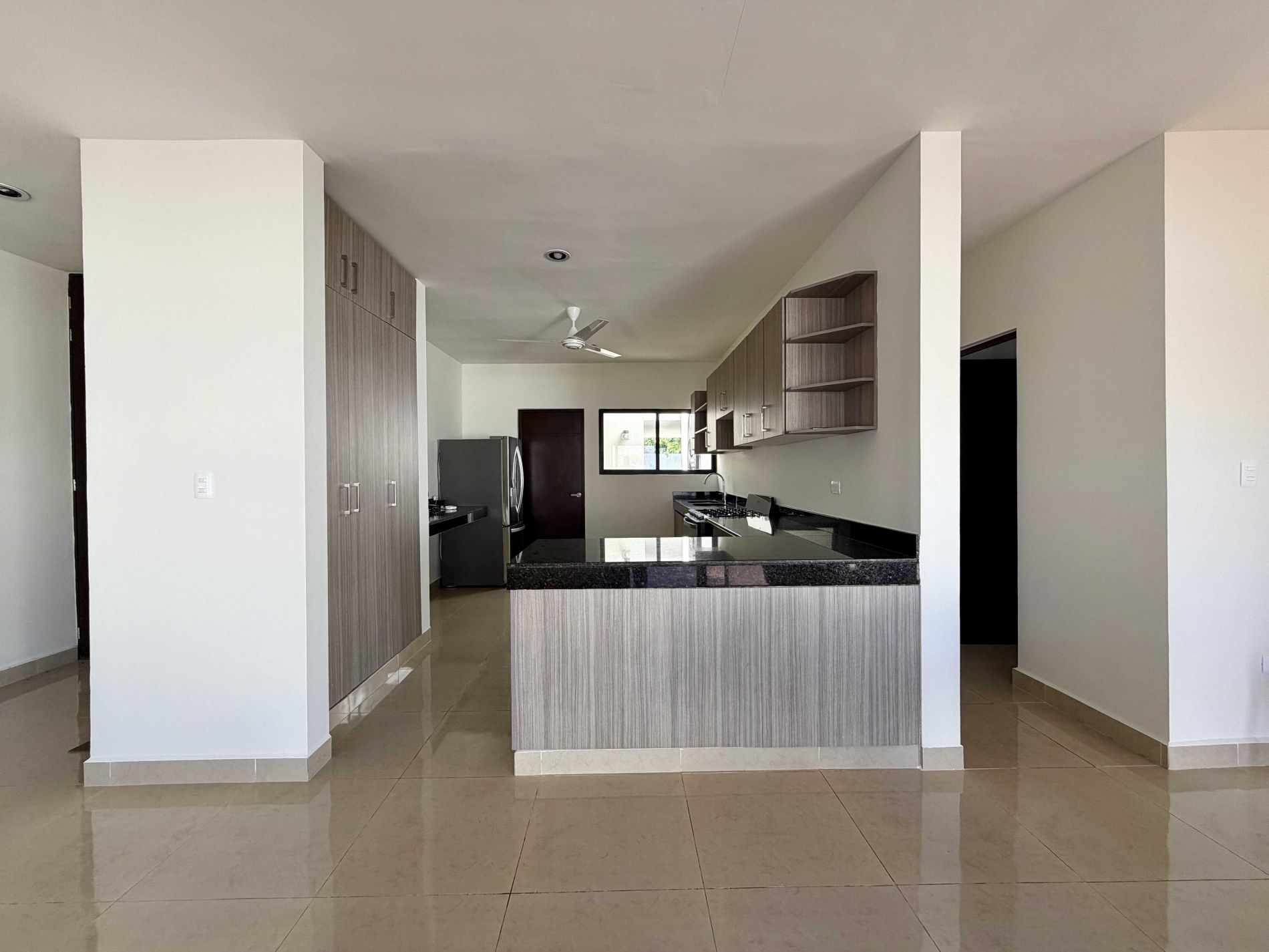 Cocina integral equipada con barra desayunadora y alacena