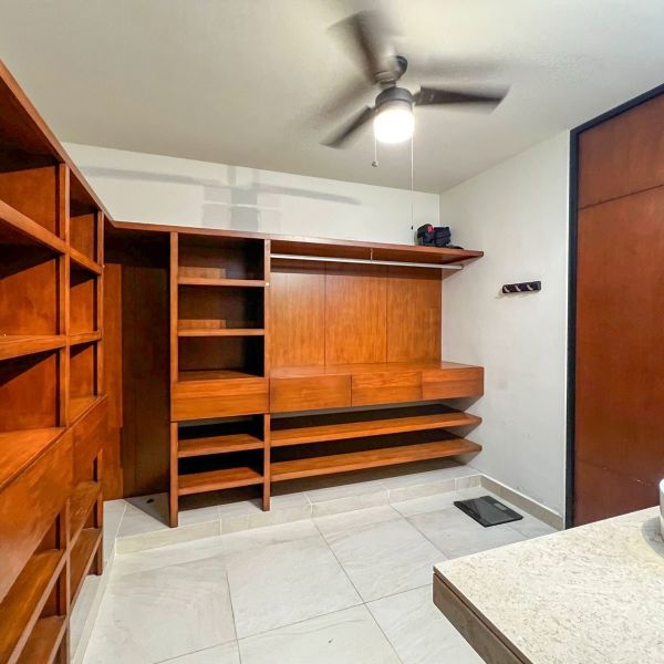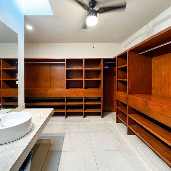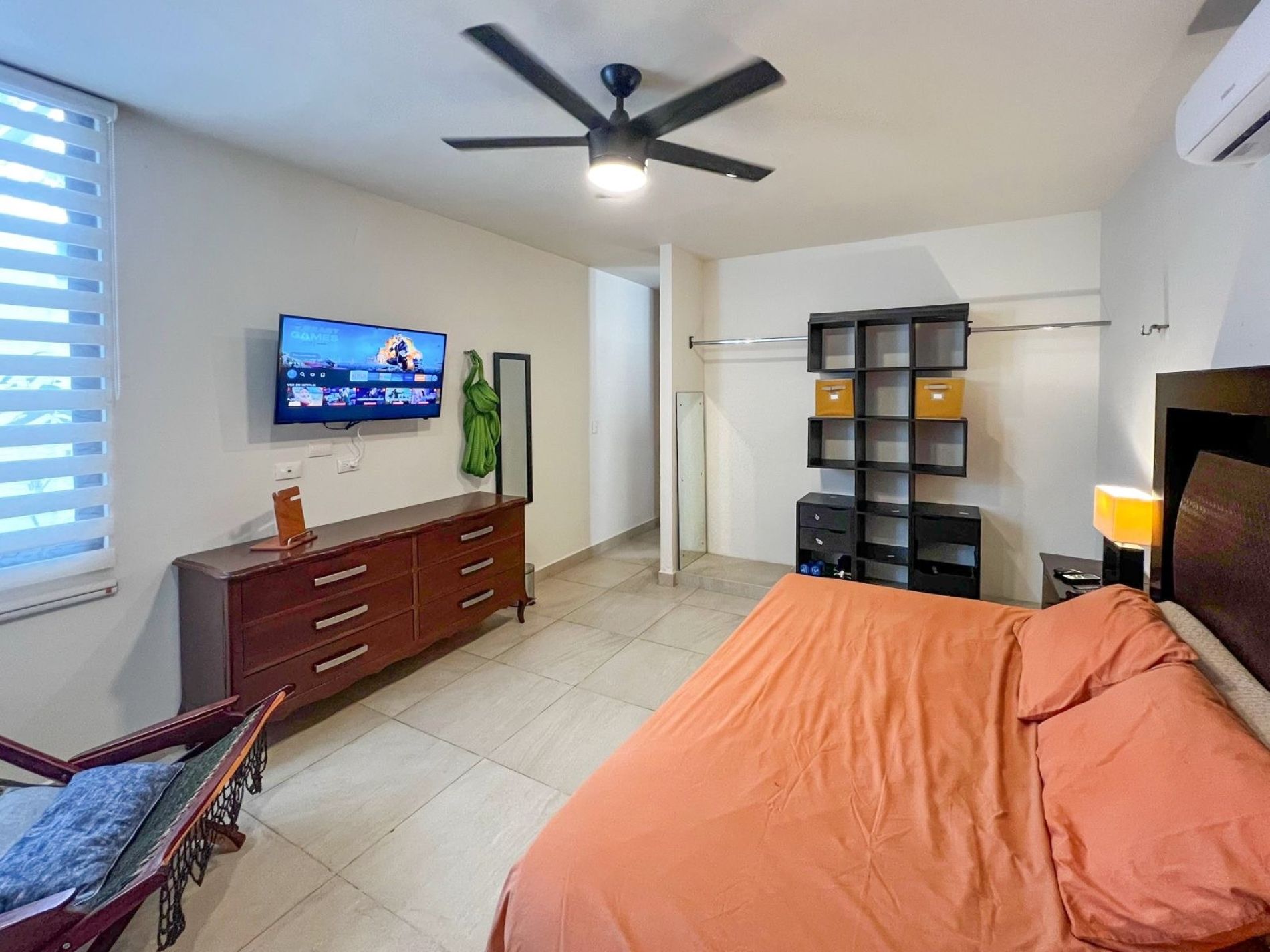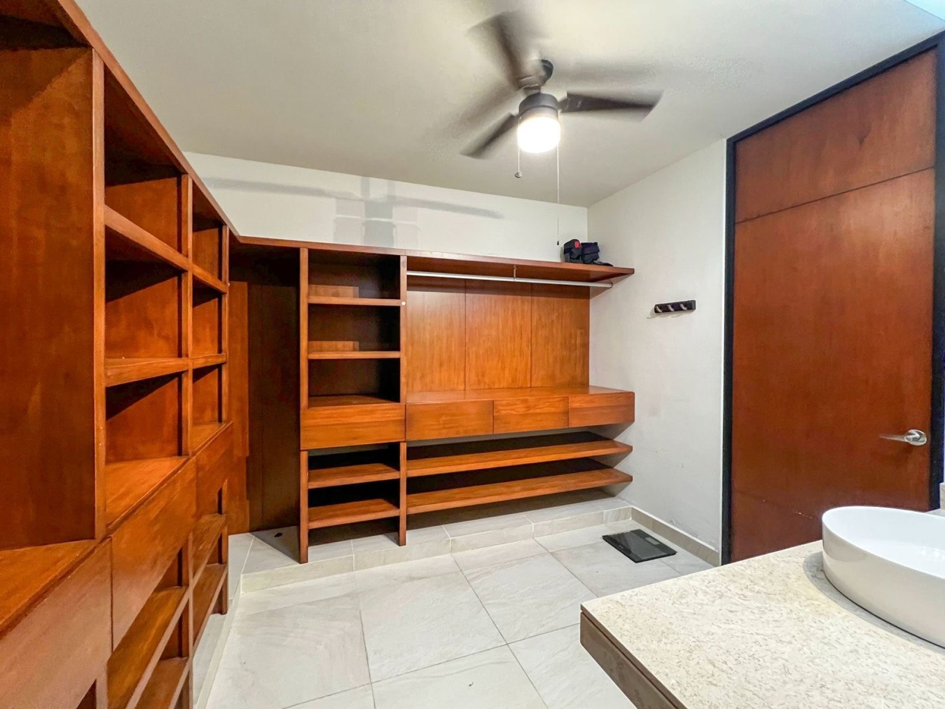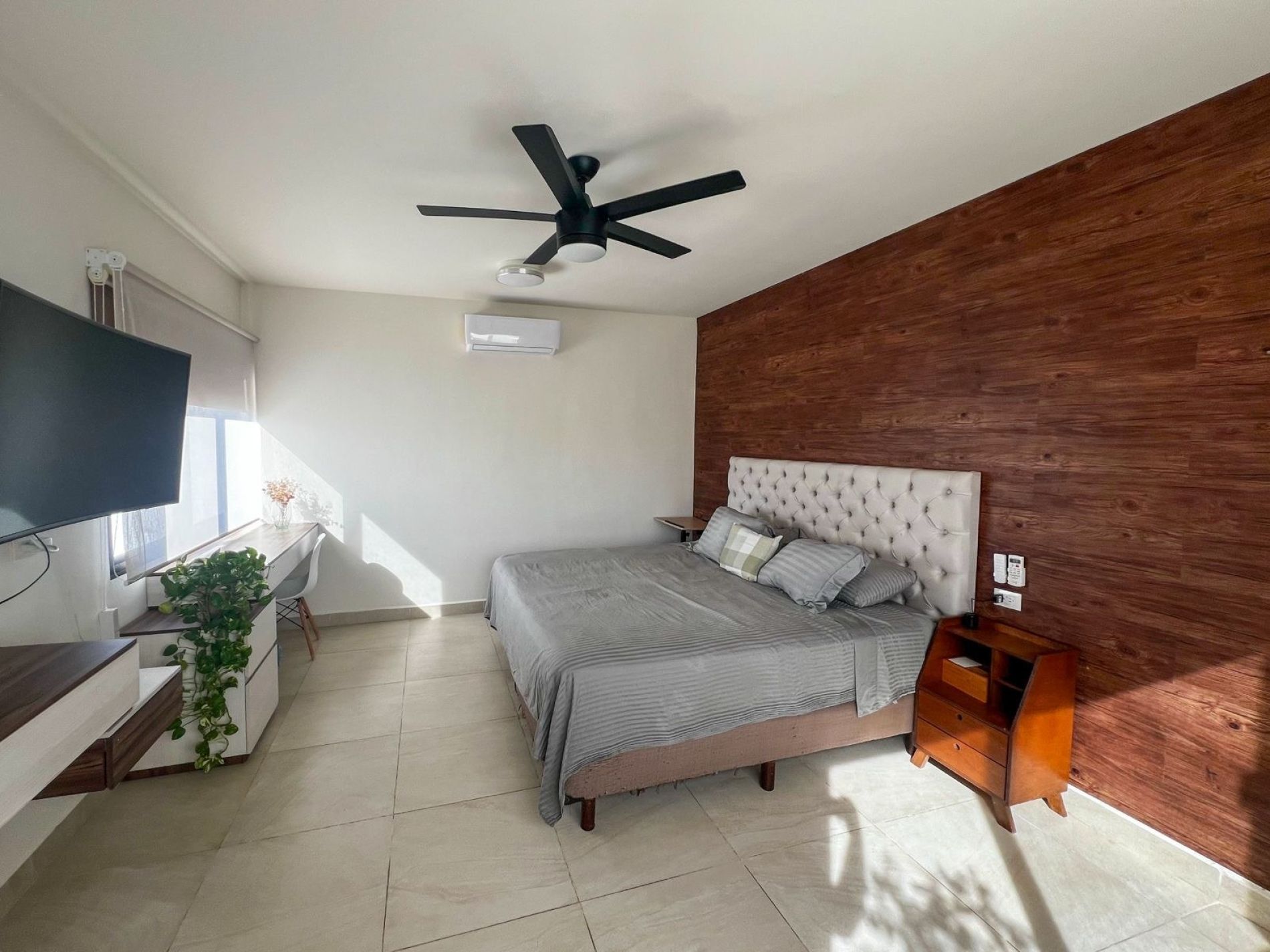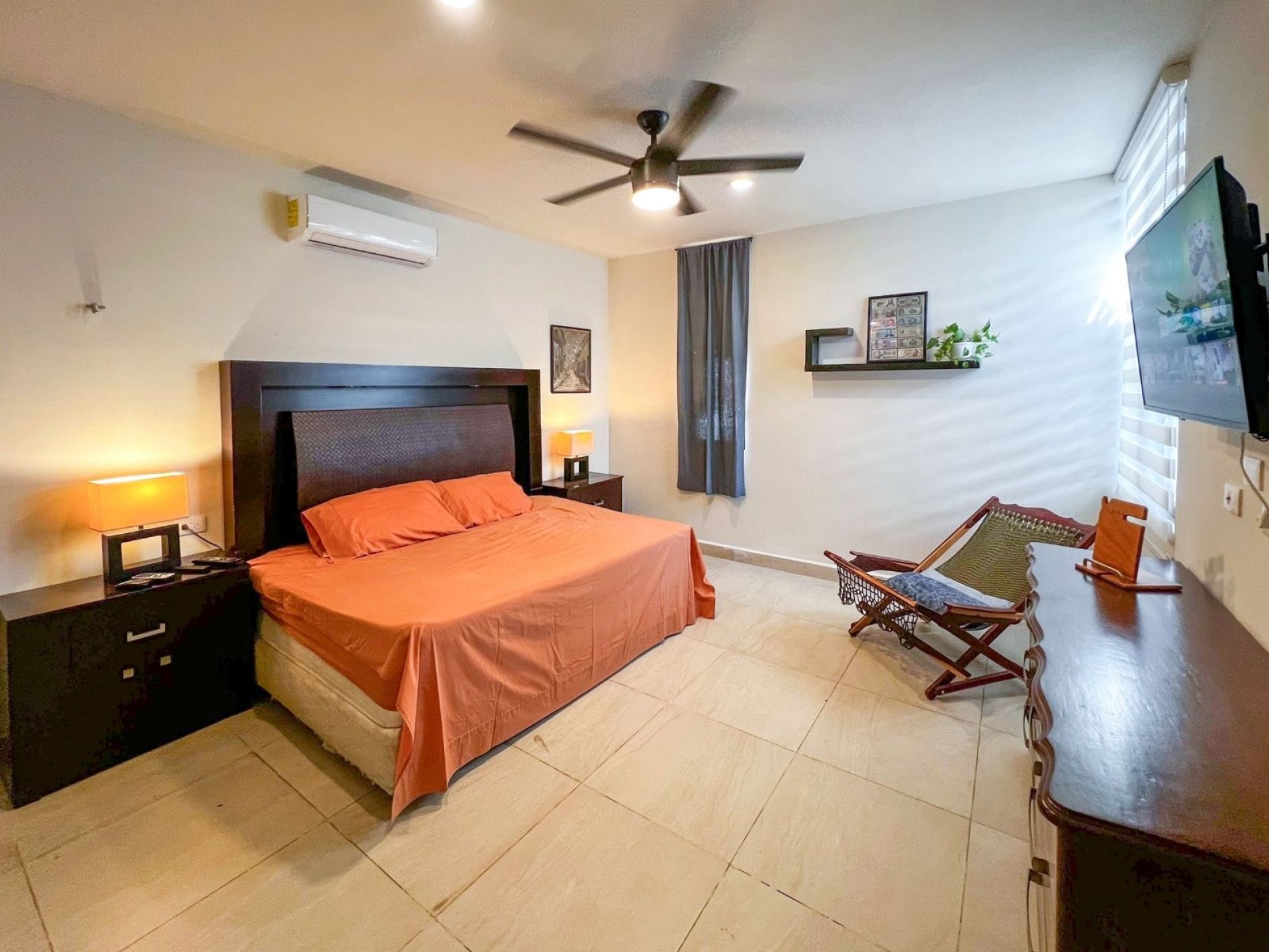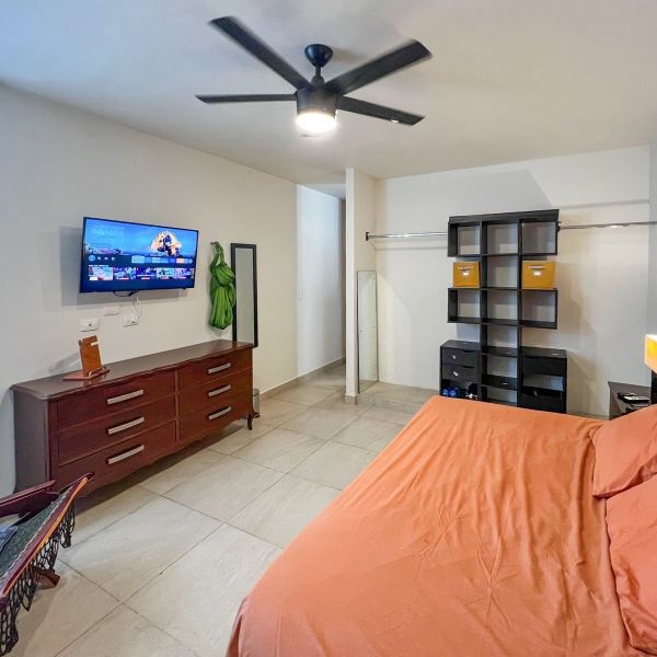 Amplia recámara principal con clóset vestidor y baño completo. Equipada con aire acondicionado de 18,000 btus, cama king size y ventilador en techo.