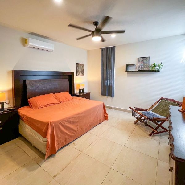 Recámara secundaria con baño completo y clóset dentro de la habitación (abierto). Equipada con cama Queen Size, consola de madera de cedro, silleta tejida, aire acondicionado de 12,000 btus y ventilador de techo.
