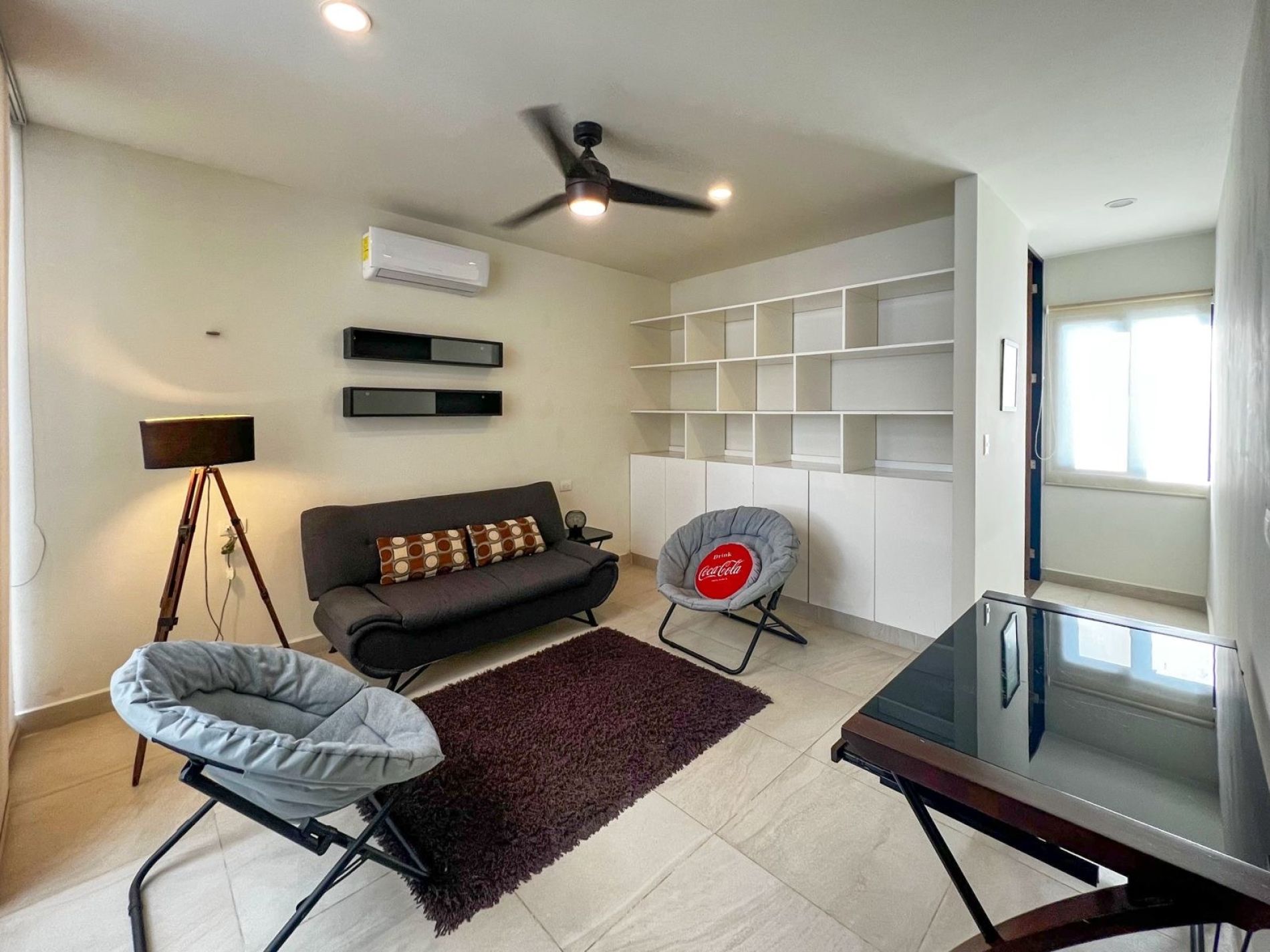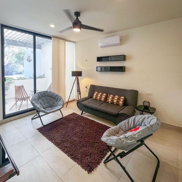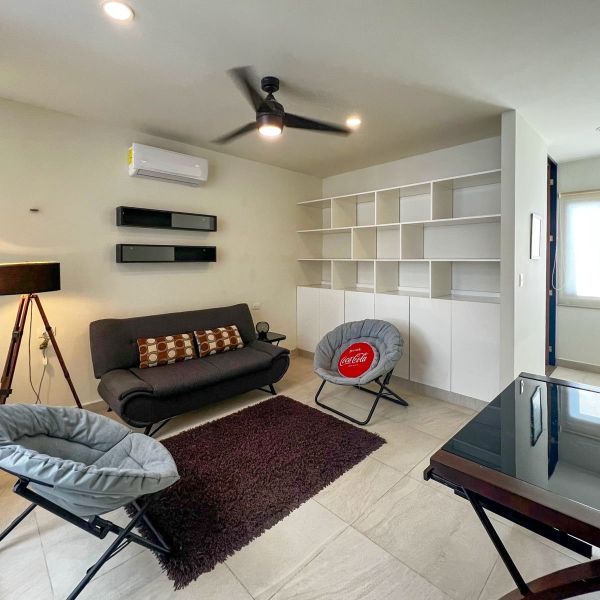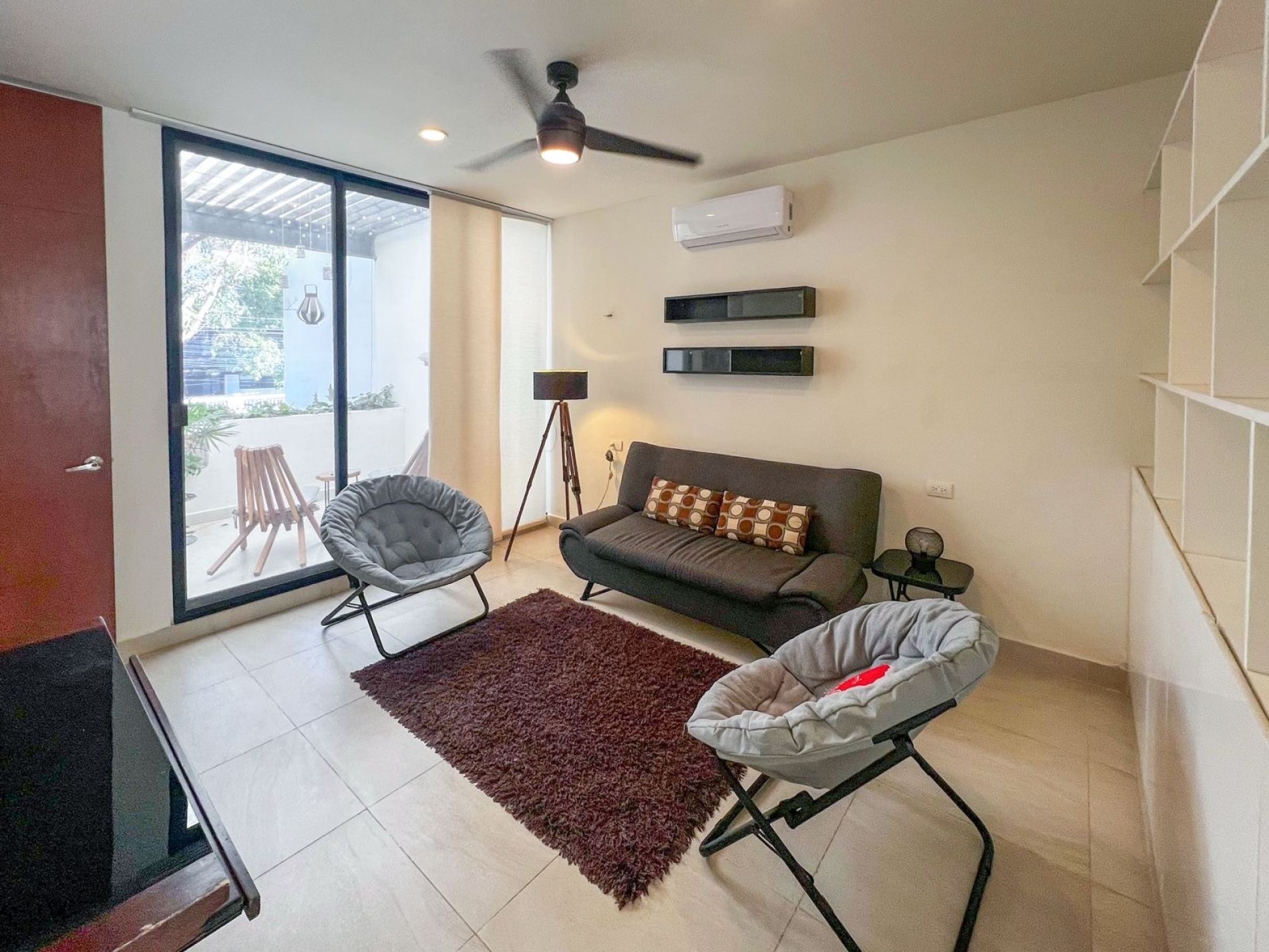 Recámara tipo estudio con baño completo y terraza techada con jardinera y vista a la calle (hacia el norte). Equipada con escritorio y silla de oficina, lámpara de piso, sofá cama y mesa central, clóset armado tipo librero. Ideal para Home Office con aire acondicionado de 12,000 btus y ventilador de techo.