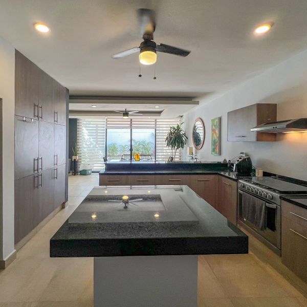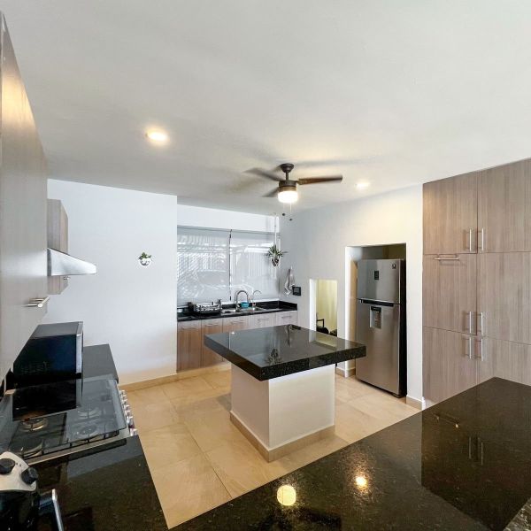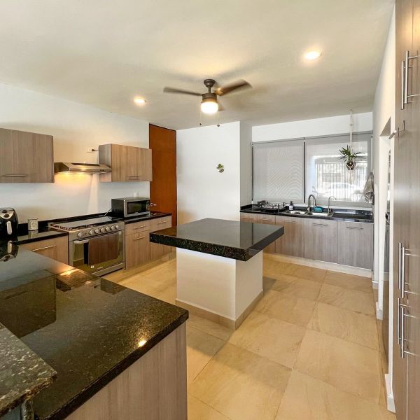Amplia cocina con meseta de granito, isla central y gavetas, vestida con estufa de gas, refrigerador, horno de microondas y sistema de purificación de agua.