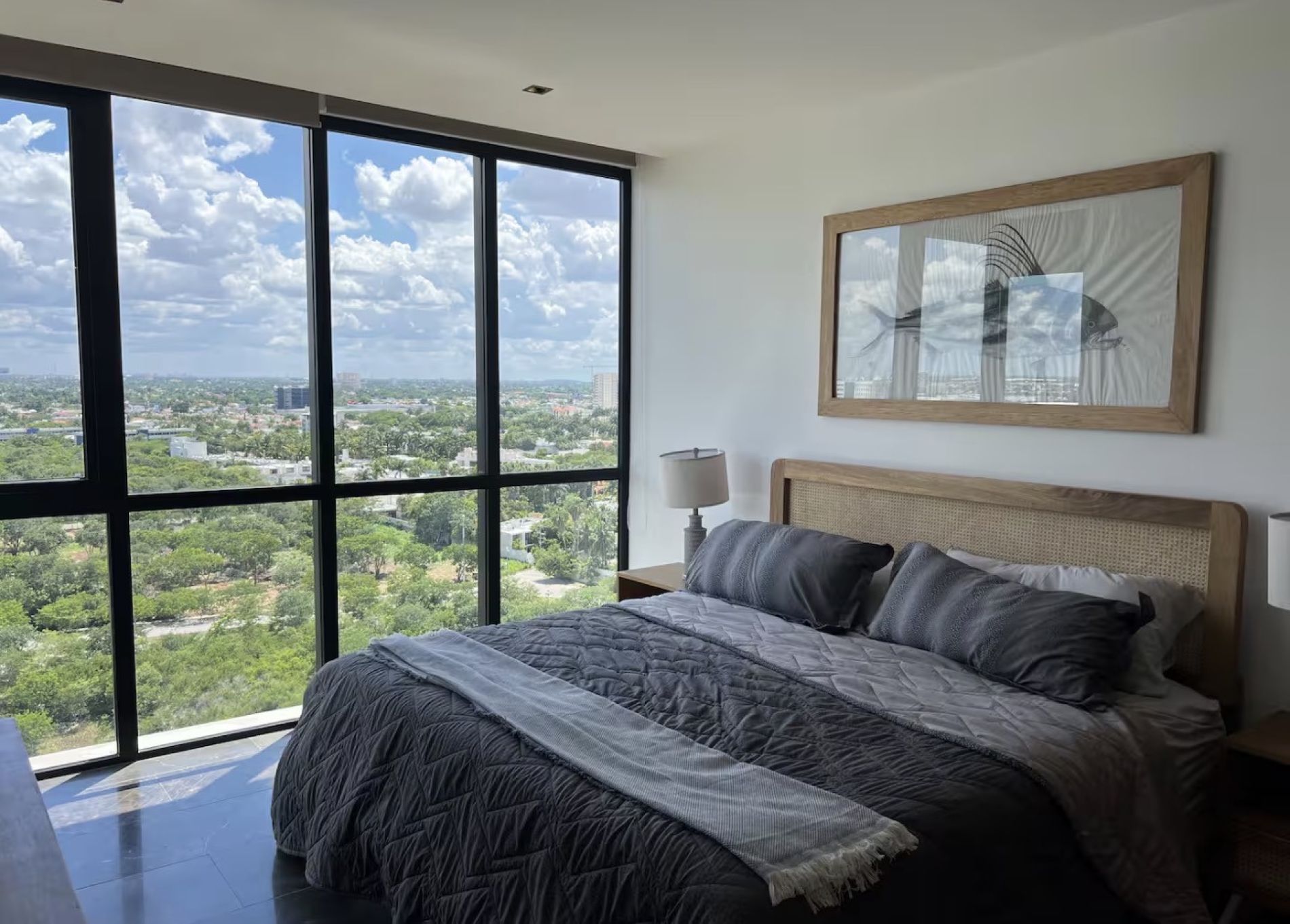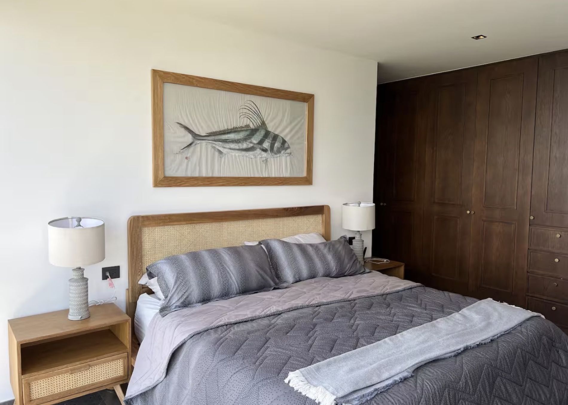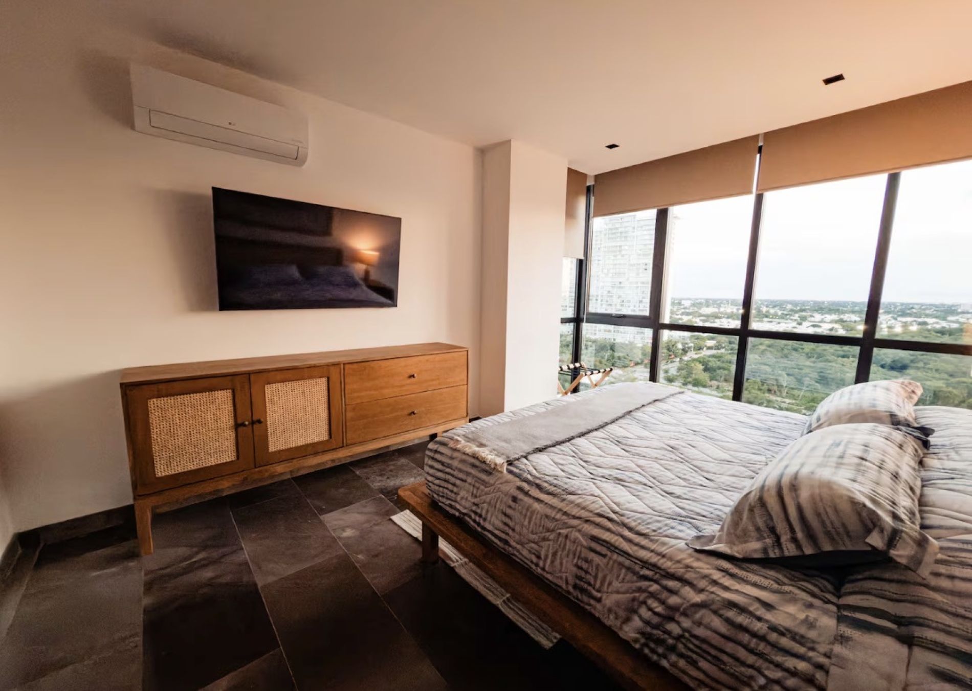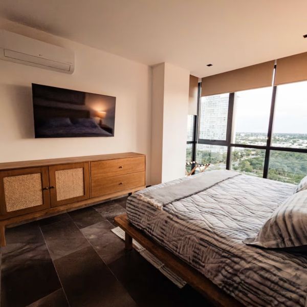Recámara principal con cama king size, TV, closet y baño completo