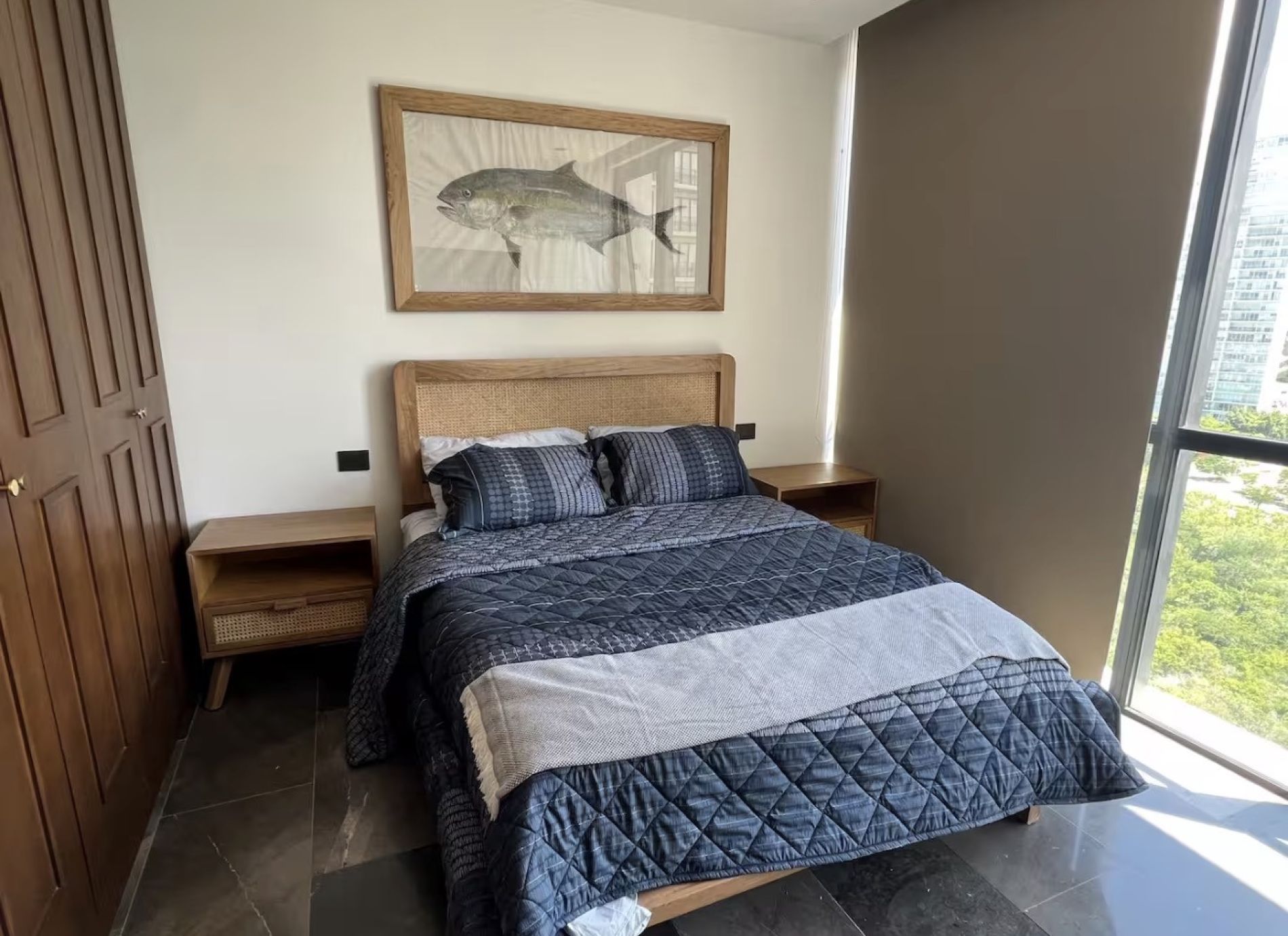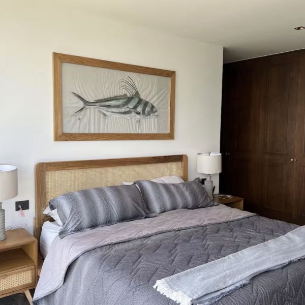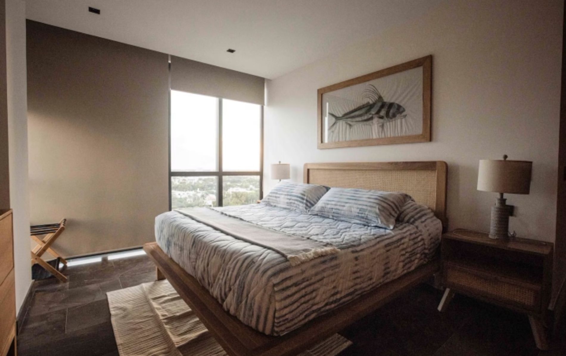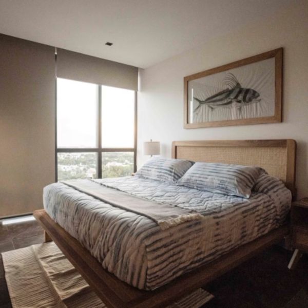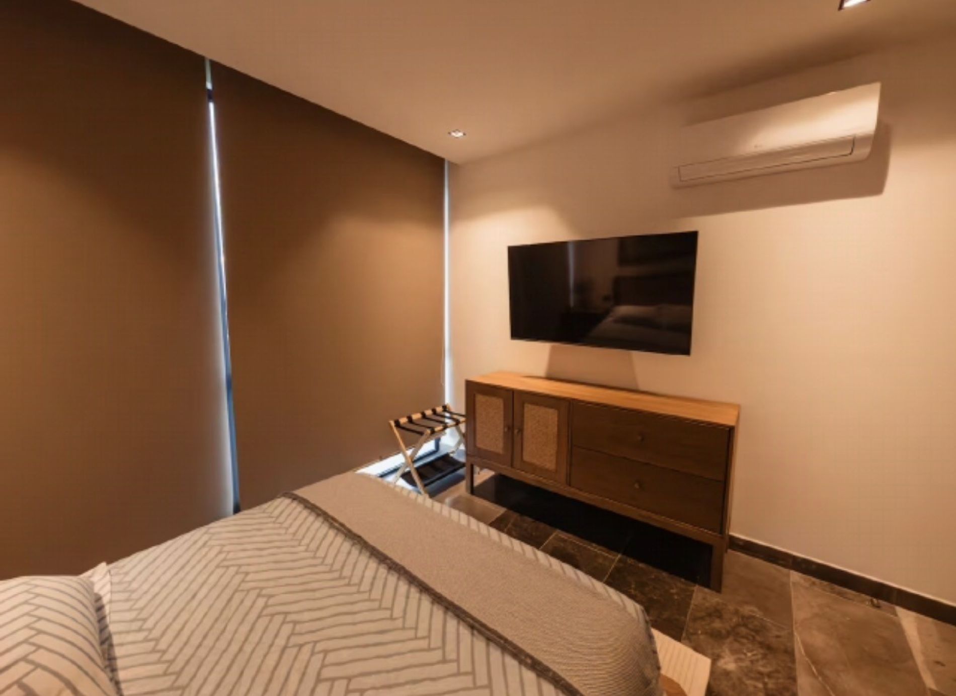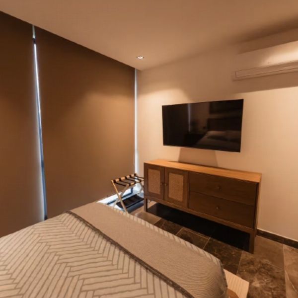Recámara secundaria con cama queen size, TV y closet