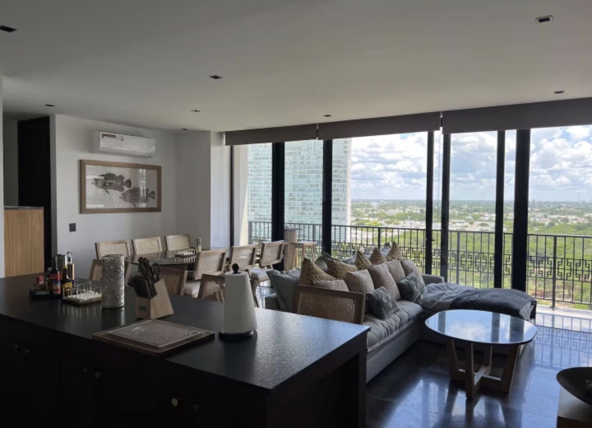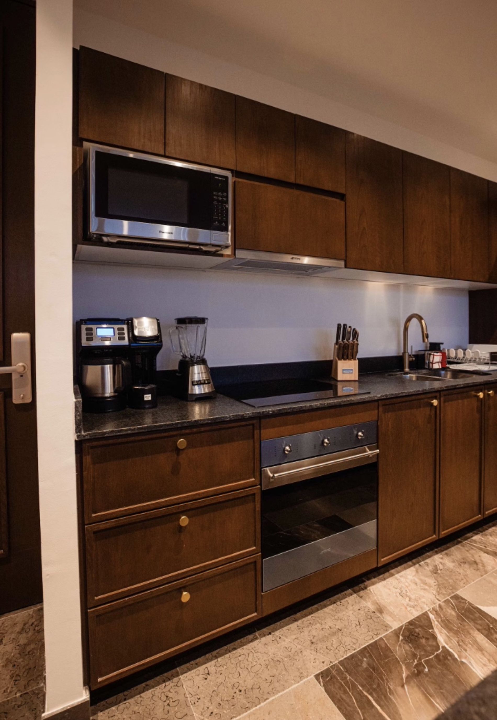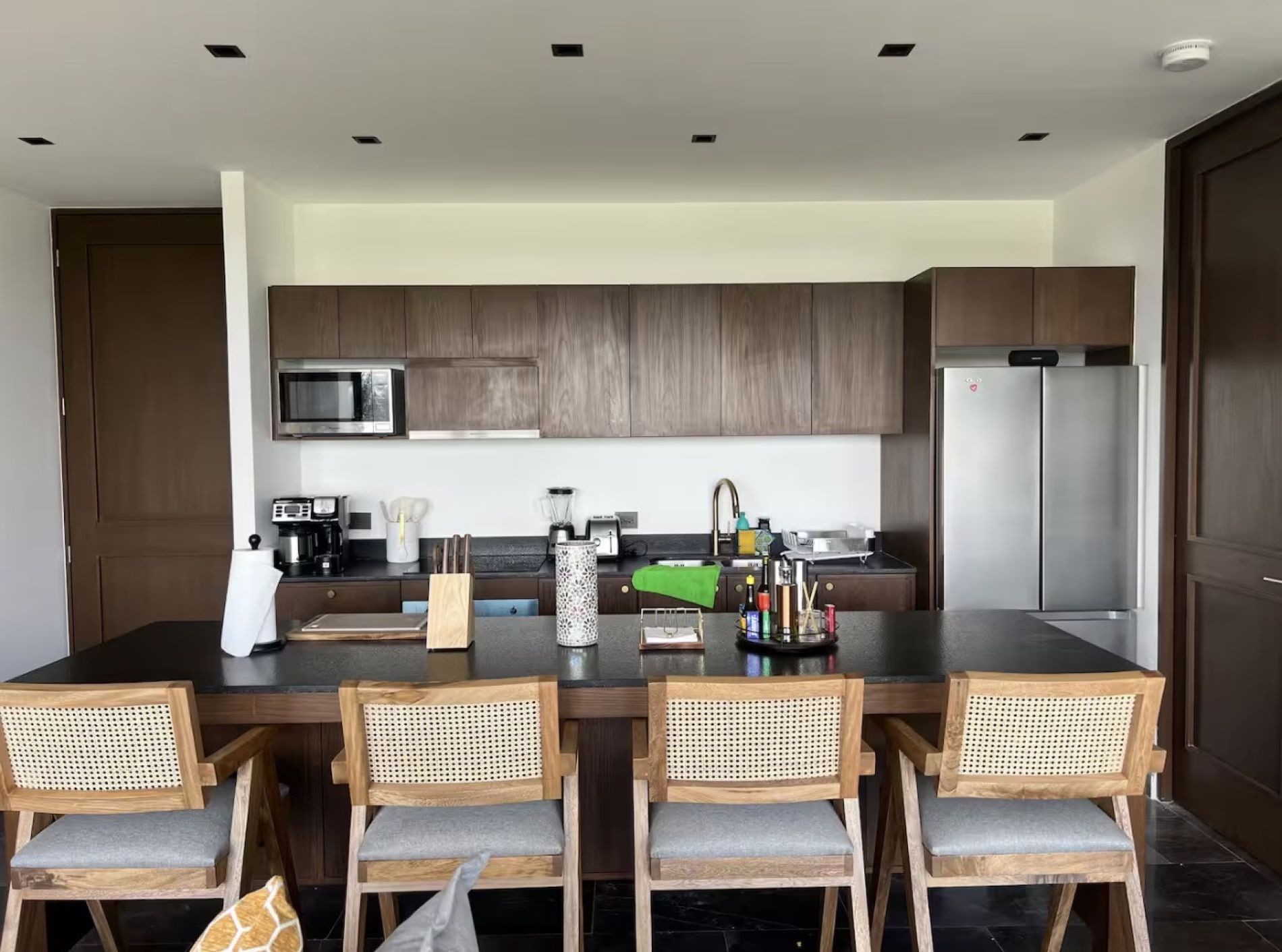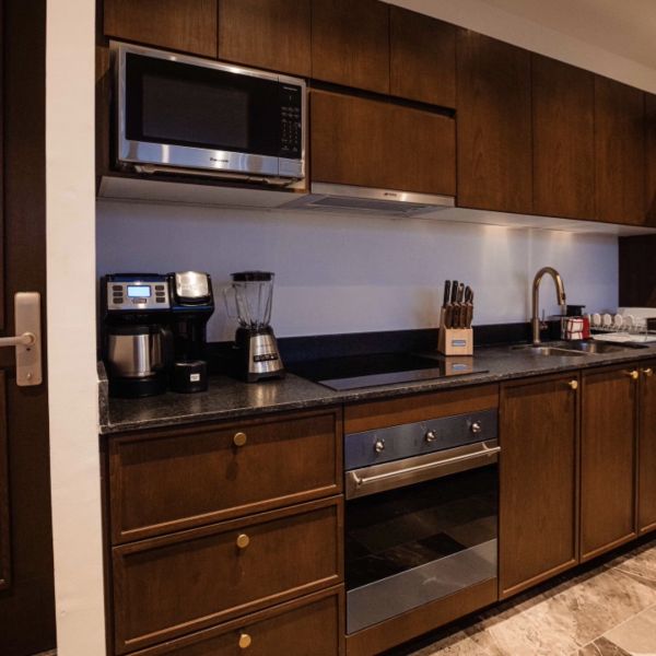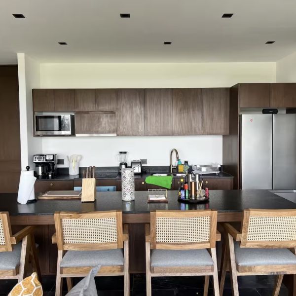 Cocina equipada con refrigerador, microondas, cafetera, parrilla, campana, horno e isla