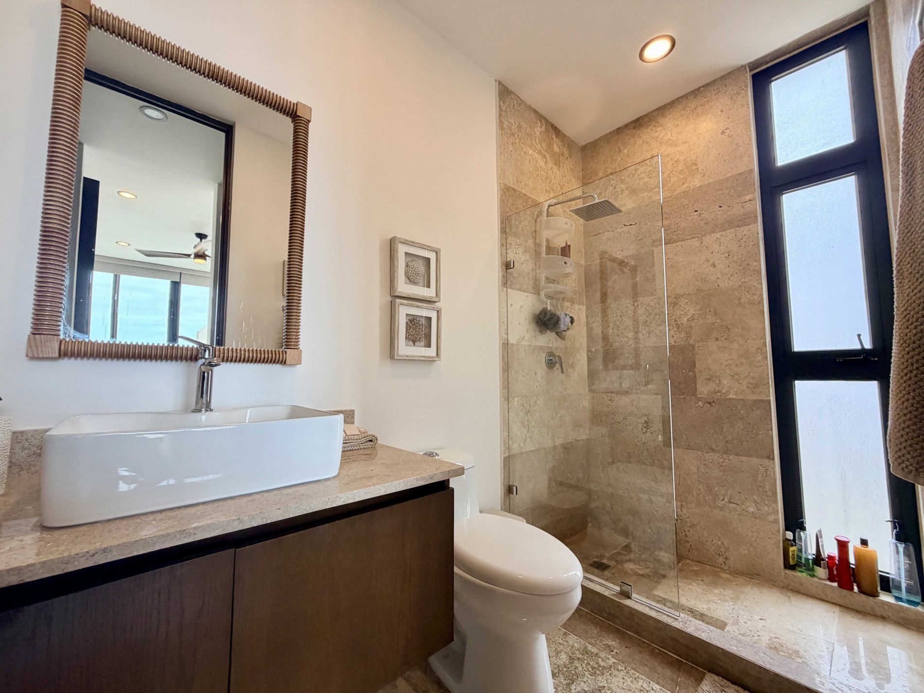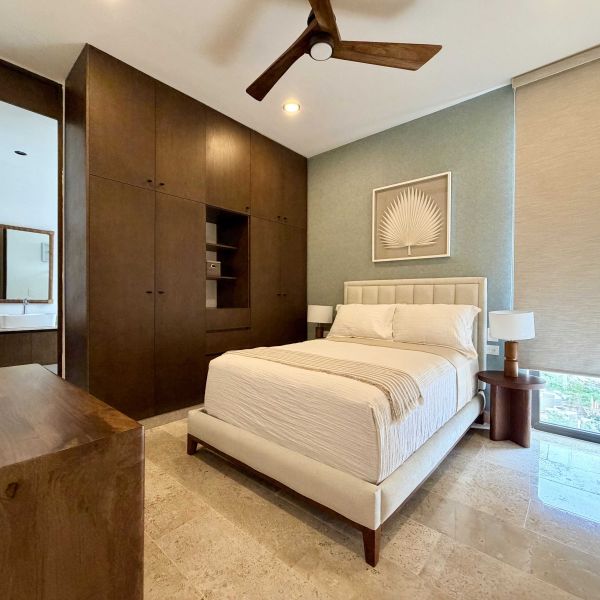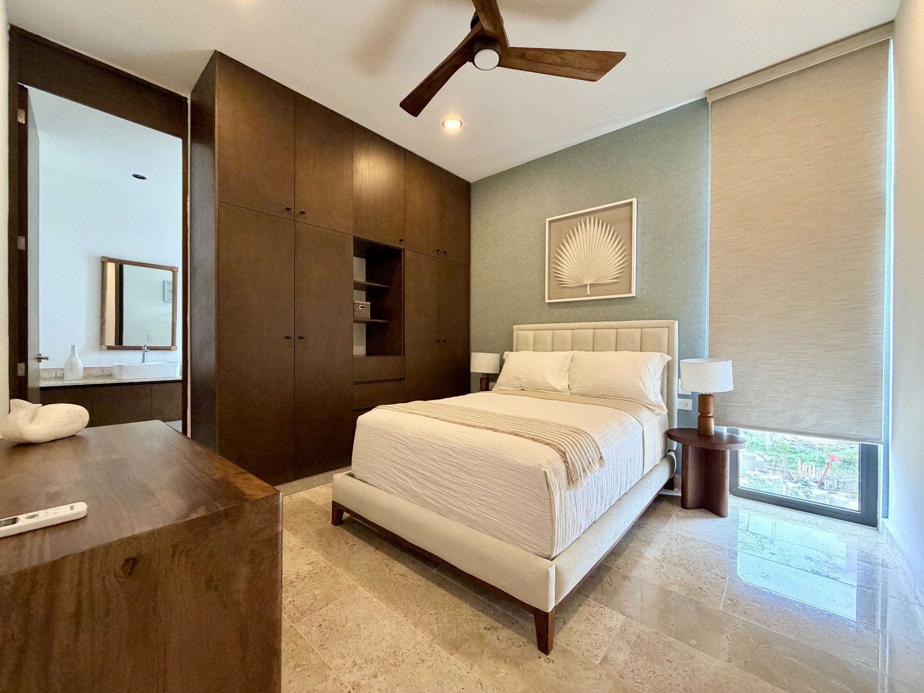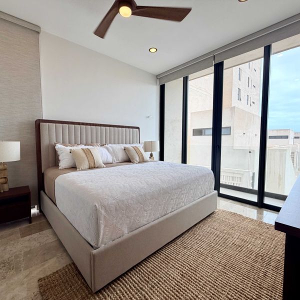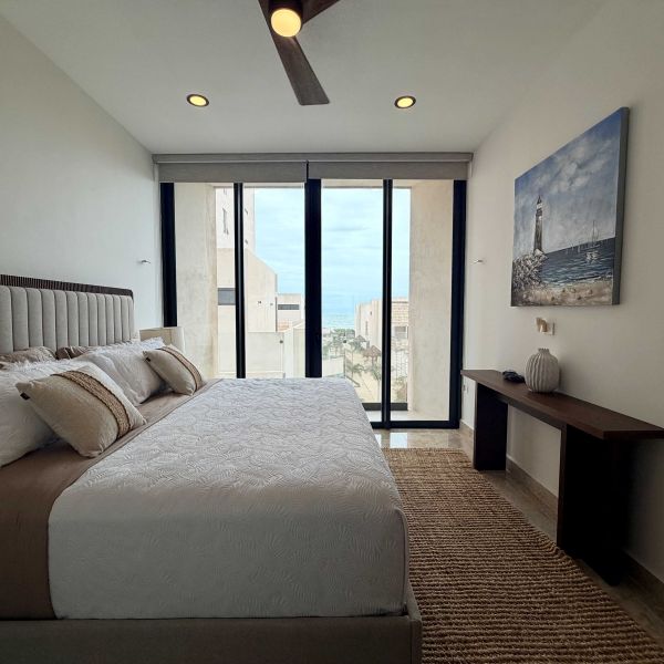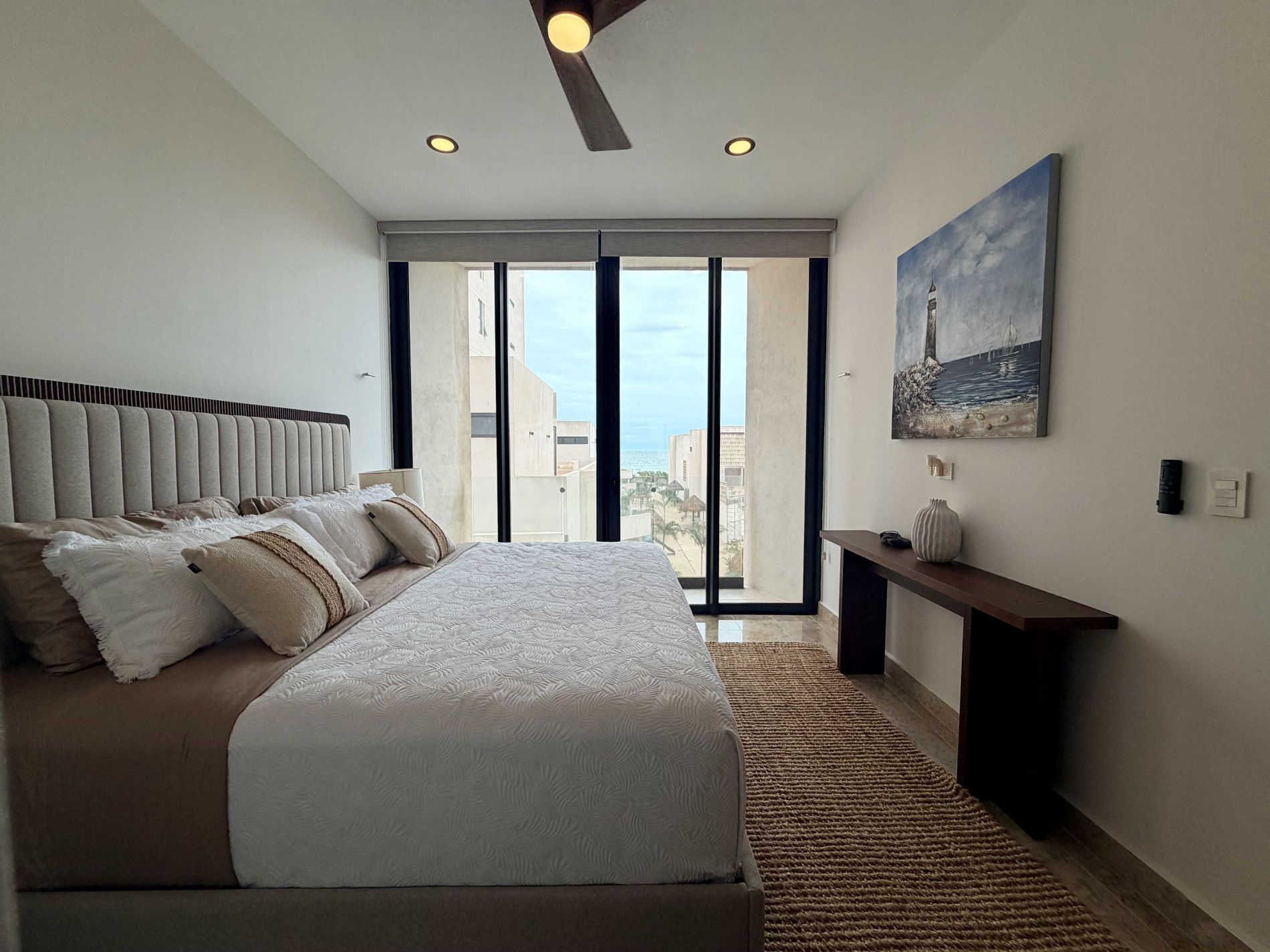 Recamara principal con balcón y vista al mar, clóset vestidor y baño completo