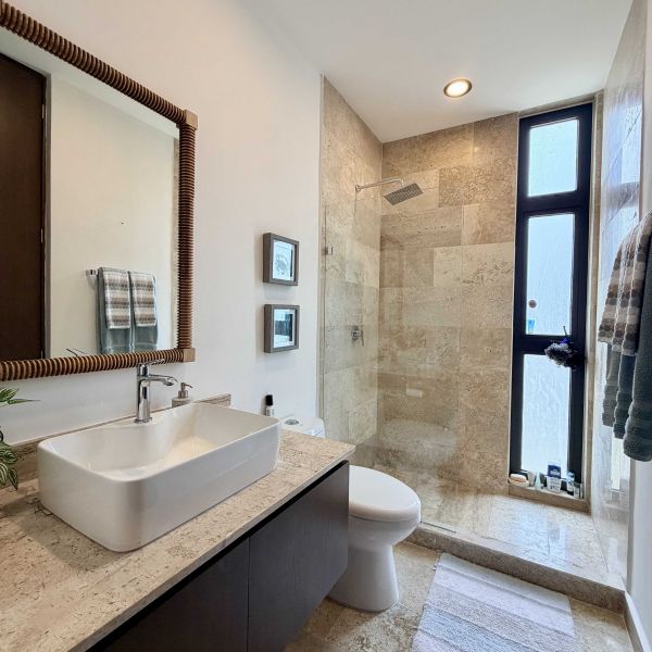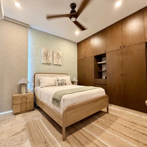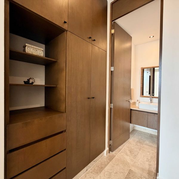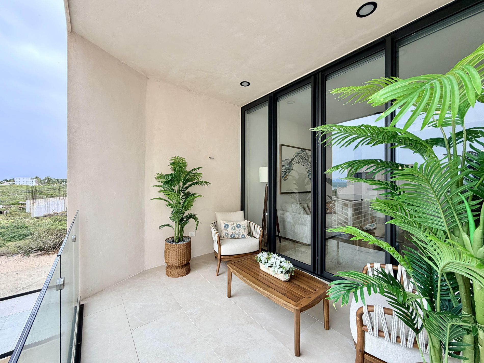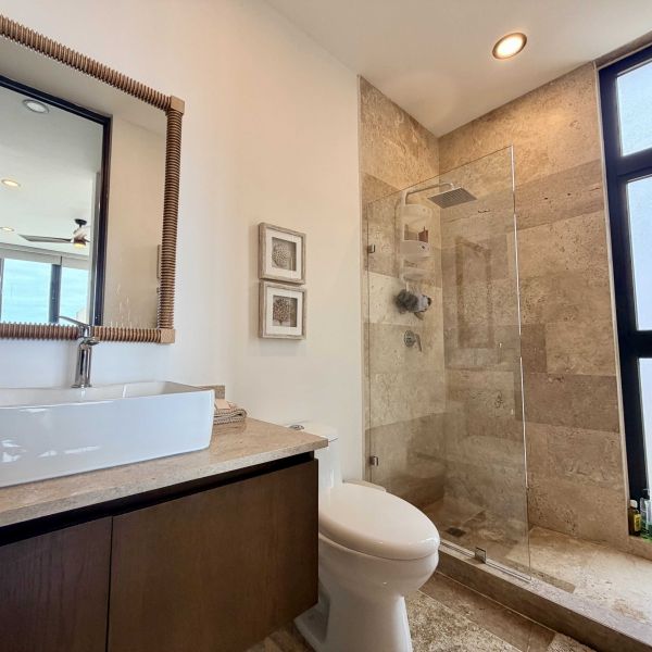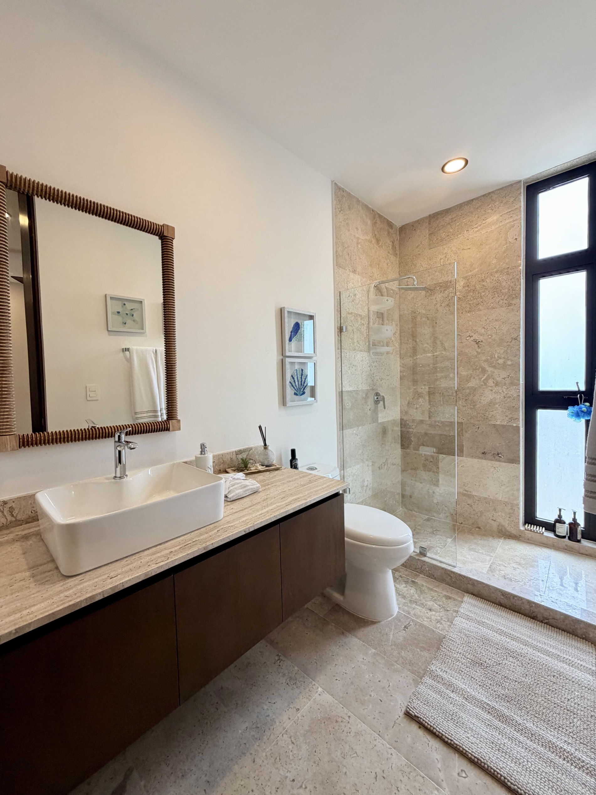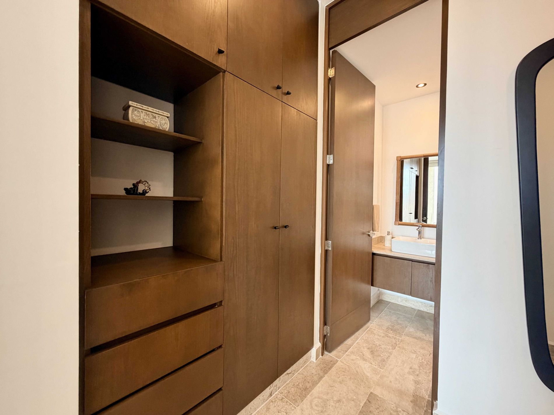 Recamara principal con balcón y vista al mar, clóset vestidor y baño completo