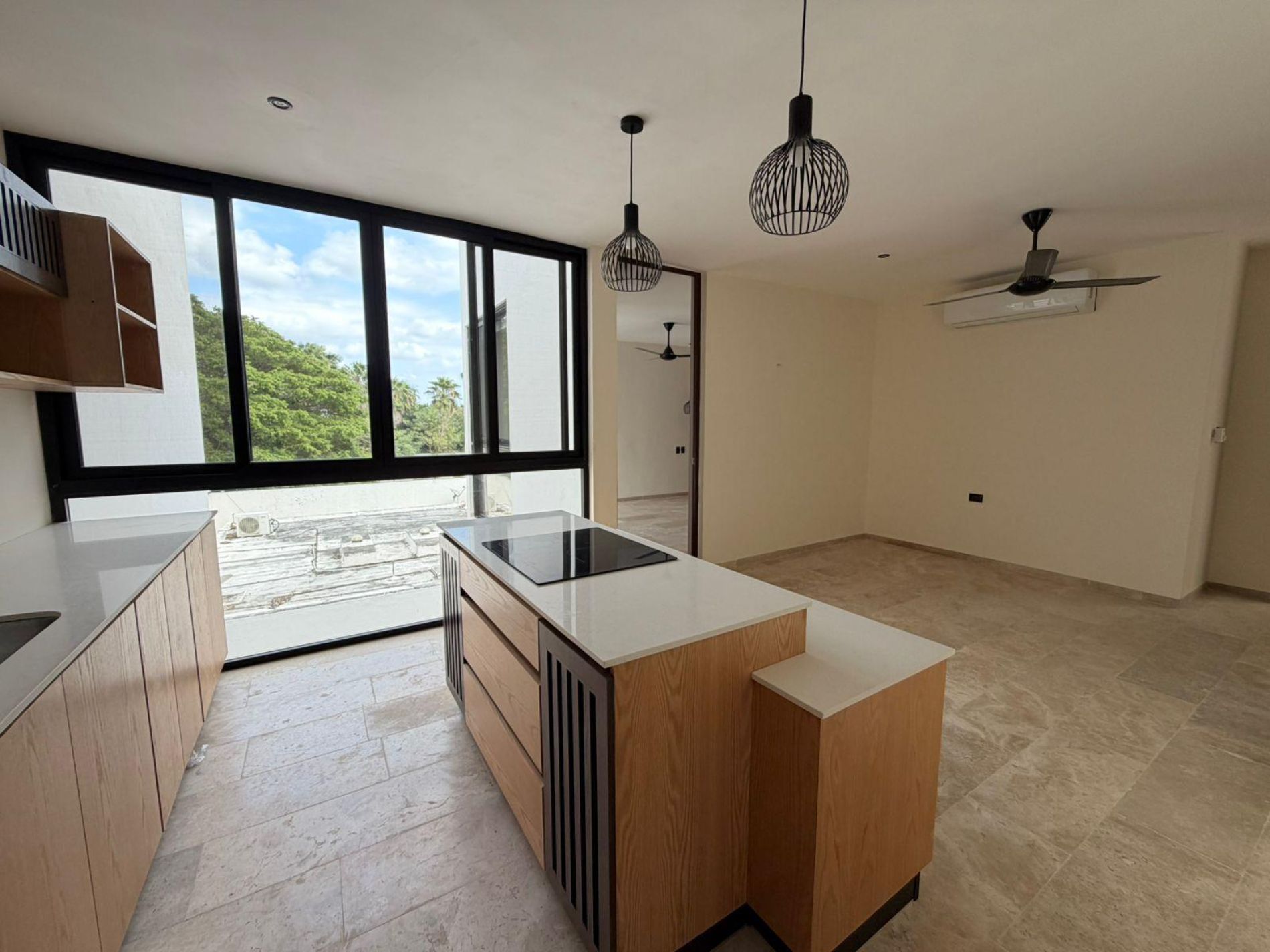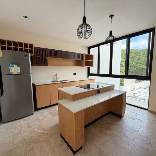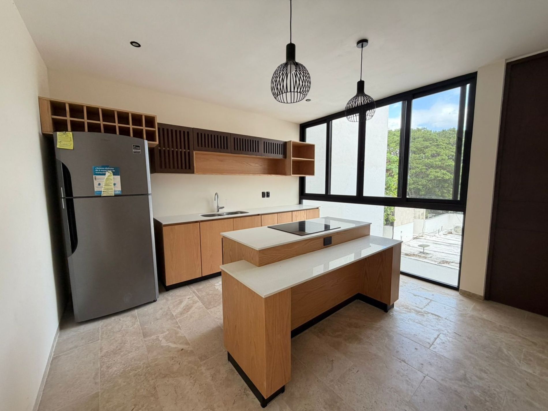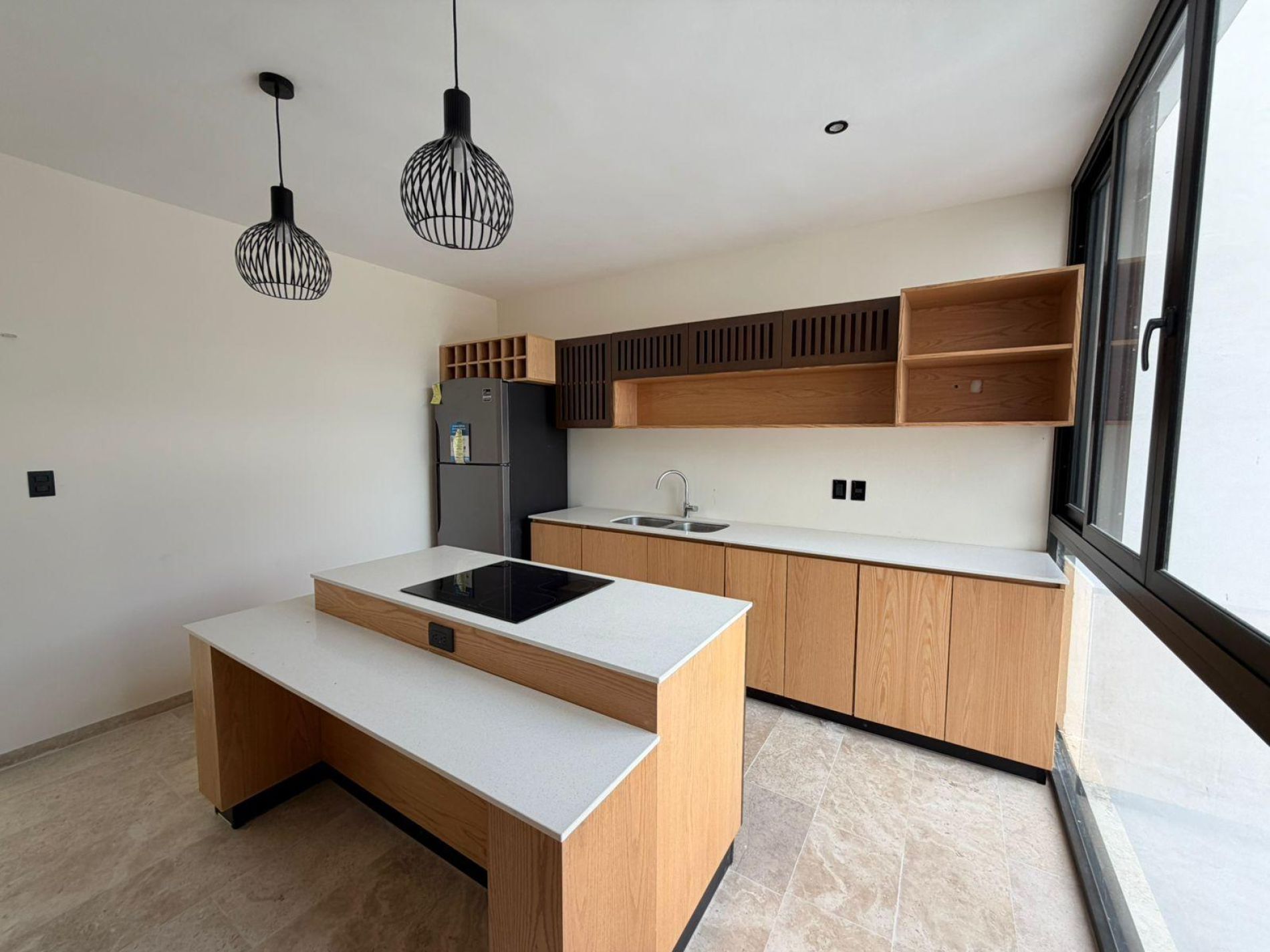 Cocina equipada con isla, refrigerador y parrilla eléctrica.