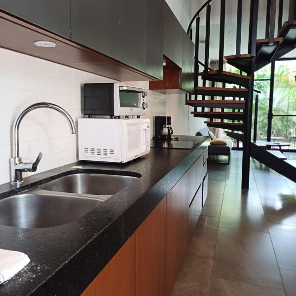Cocina equipada con refrigerador y parrilla eléctrica