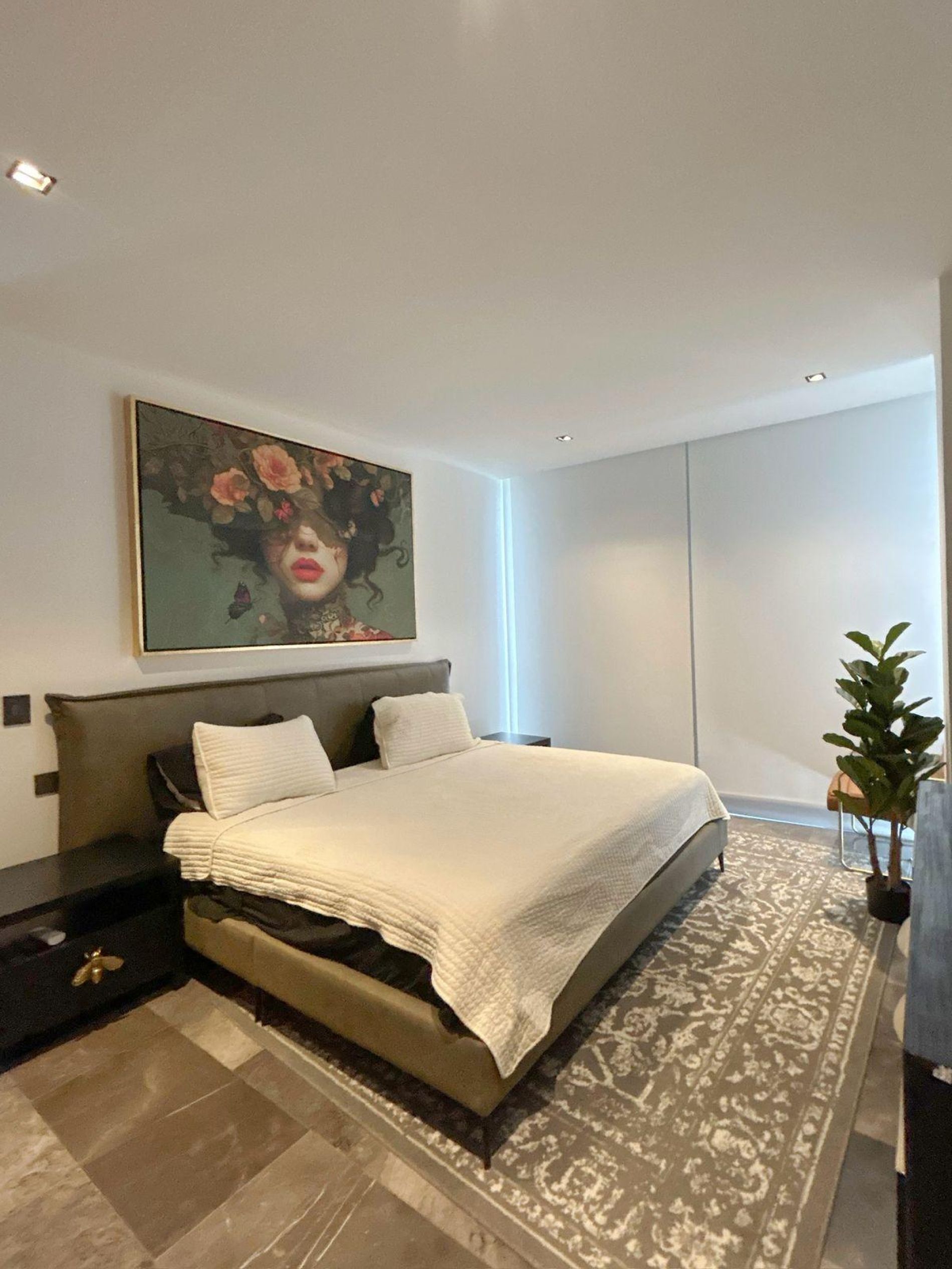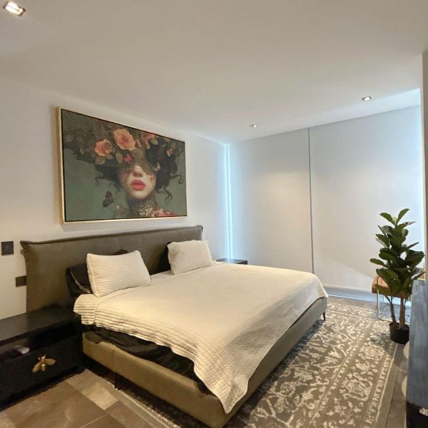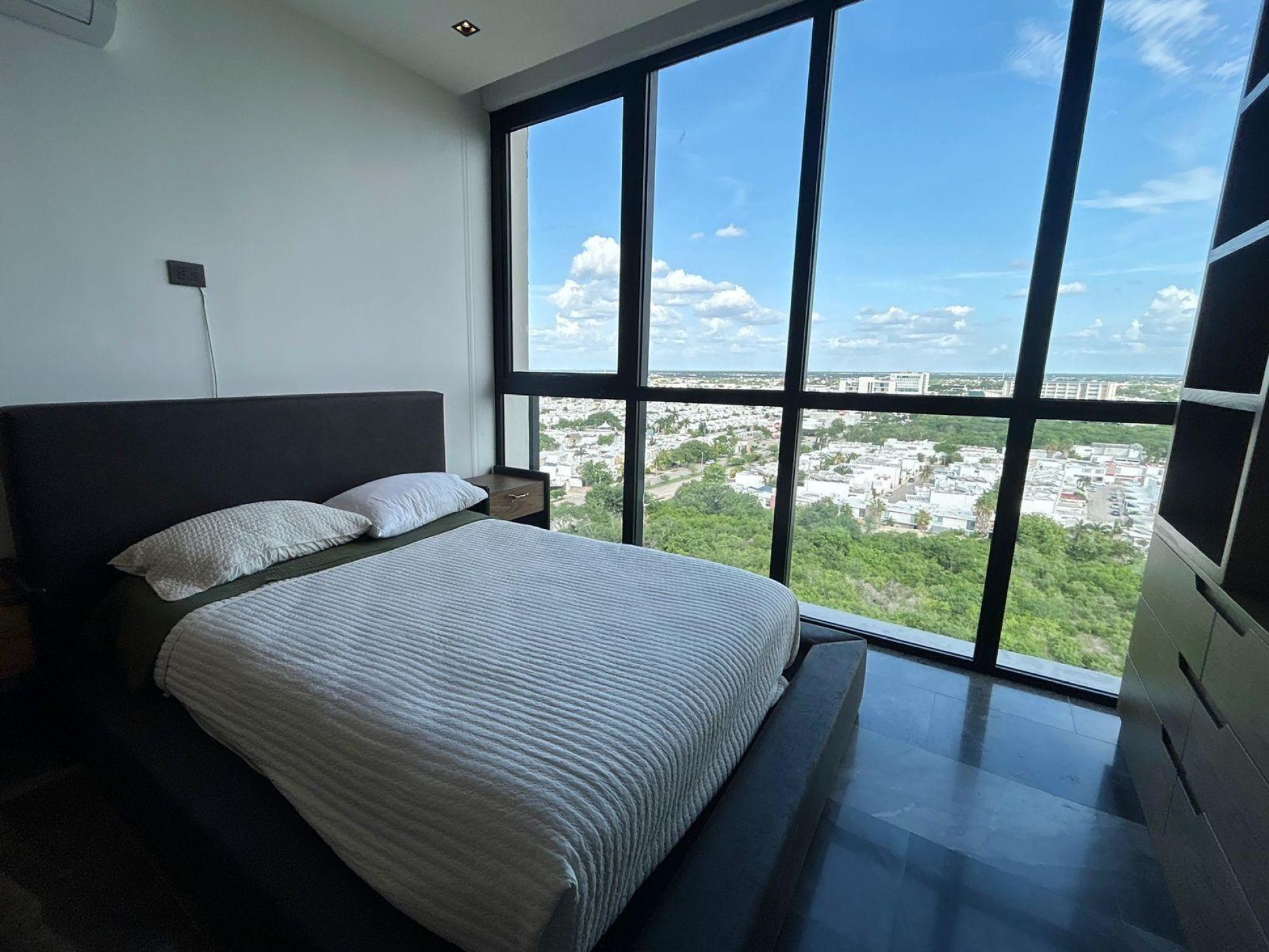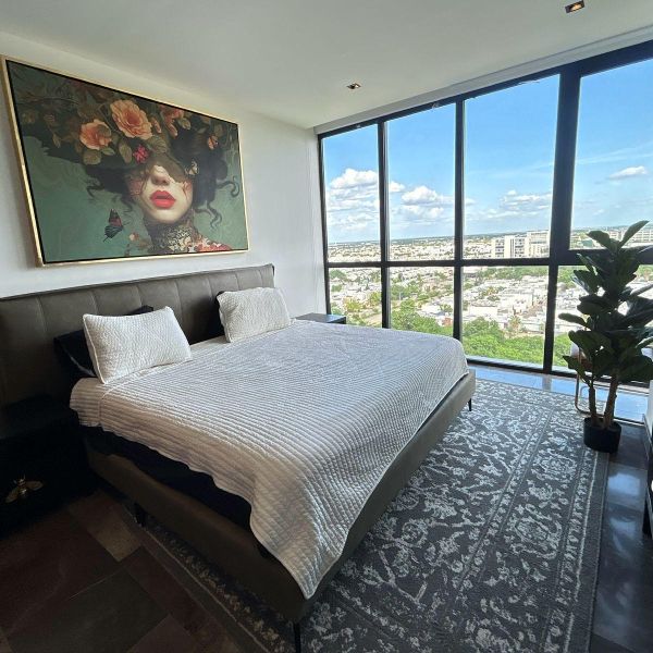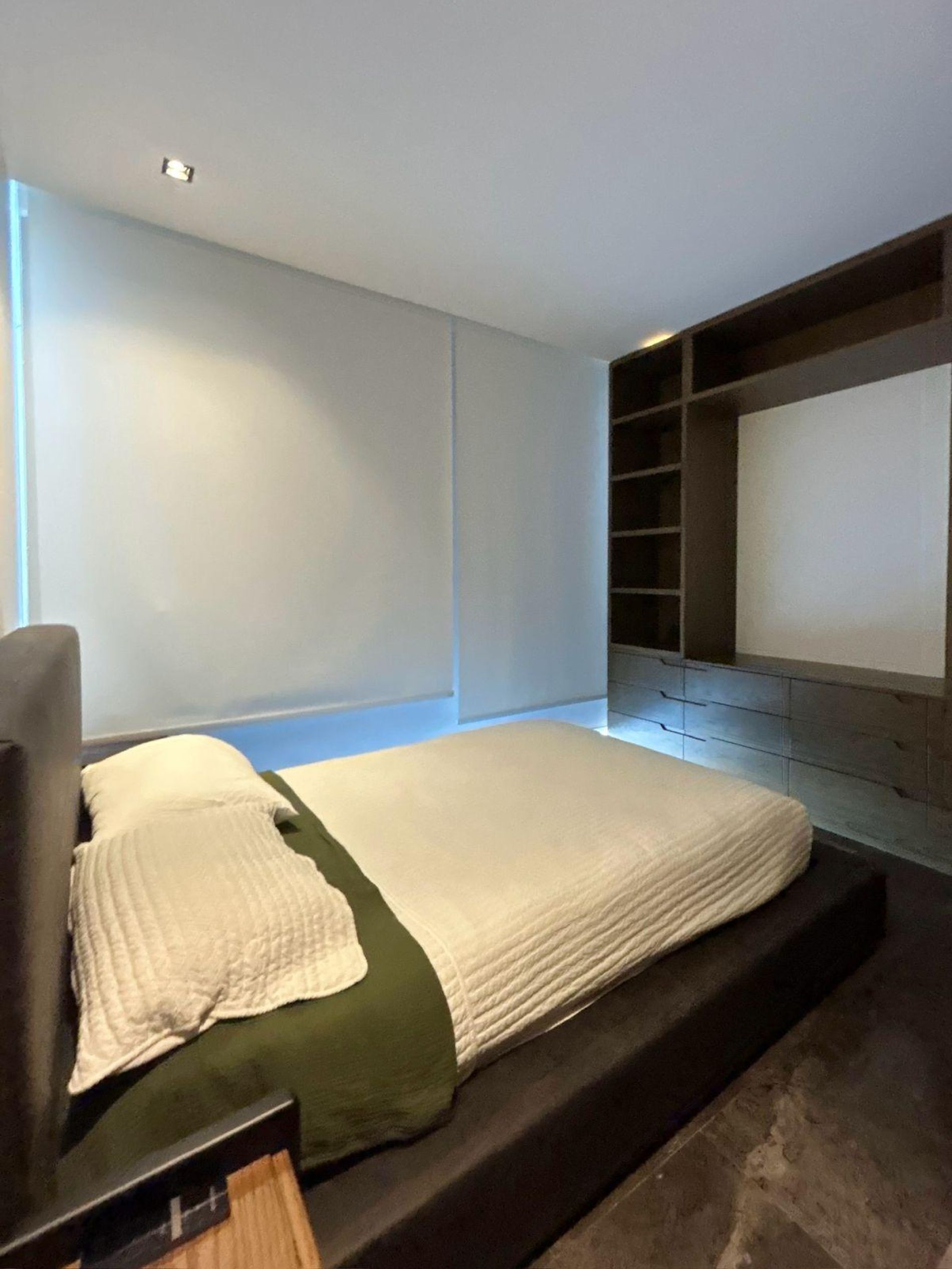 Recámara principal con cama, TV, closet y baño completo