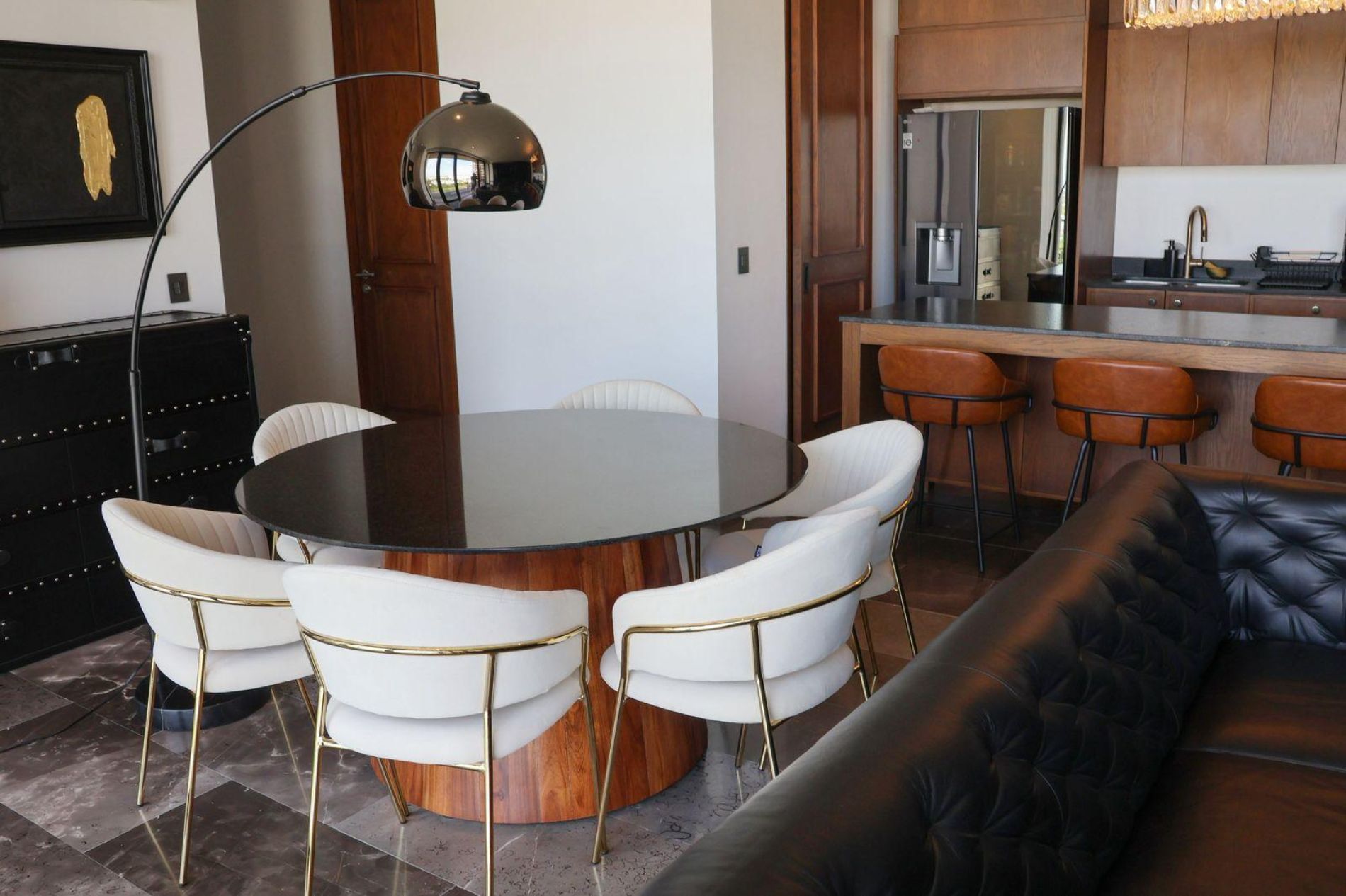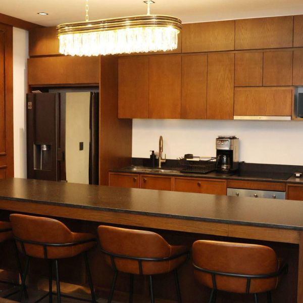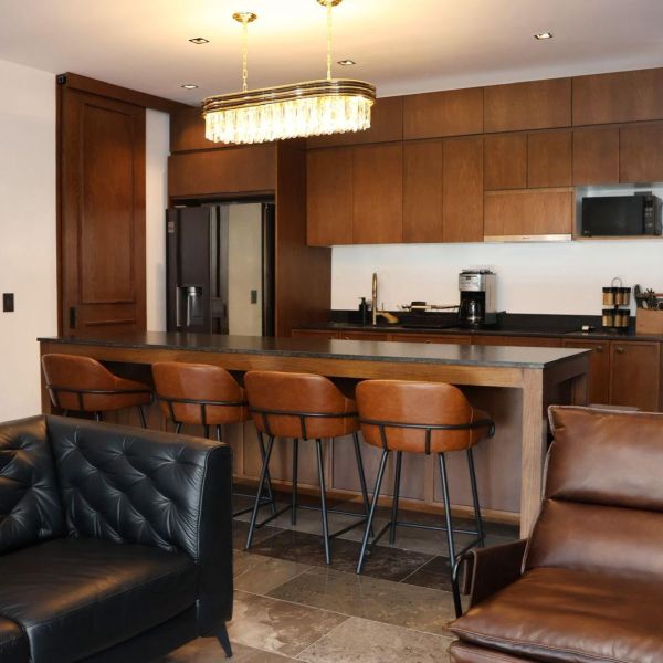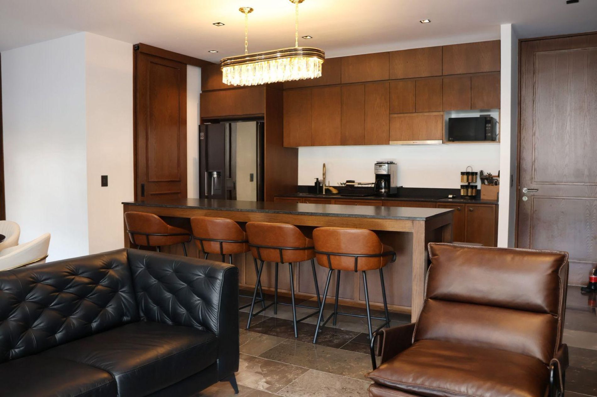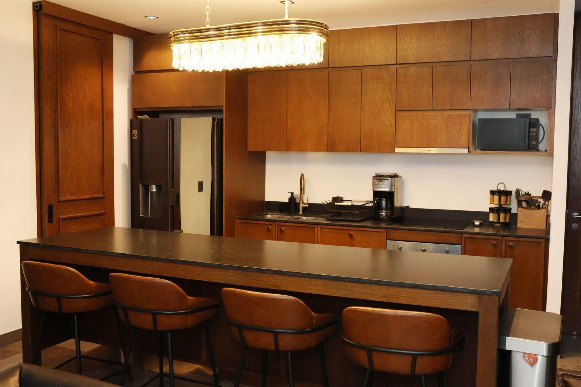 Cocina equipada con refrigerador, microondas, cafetera, parrilla, campana, horno e isla