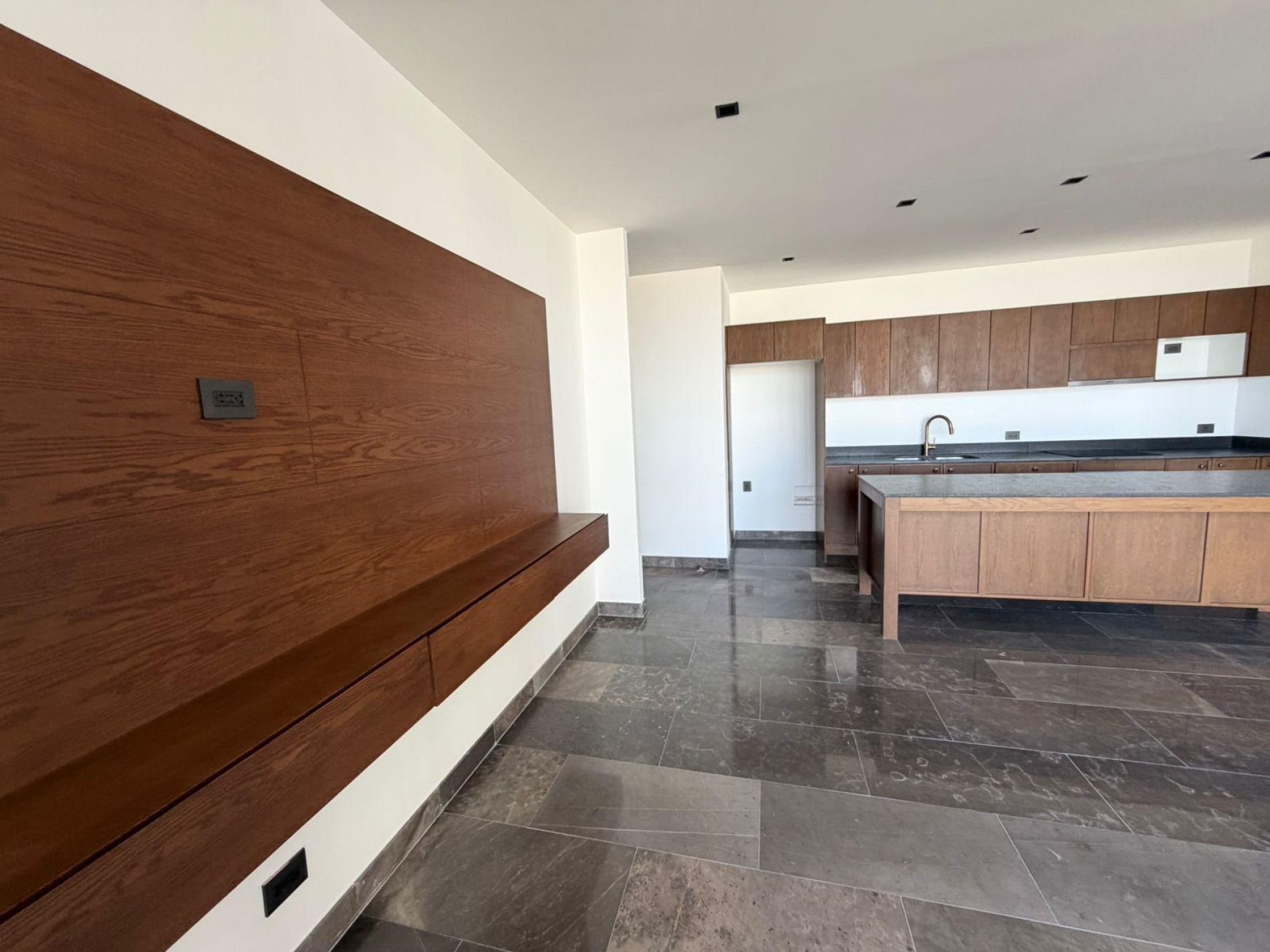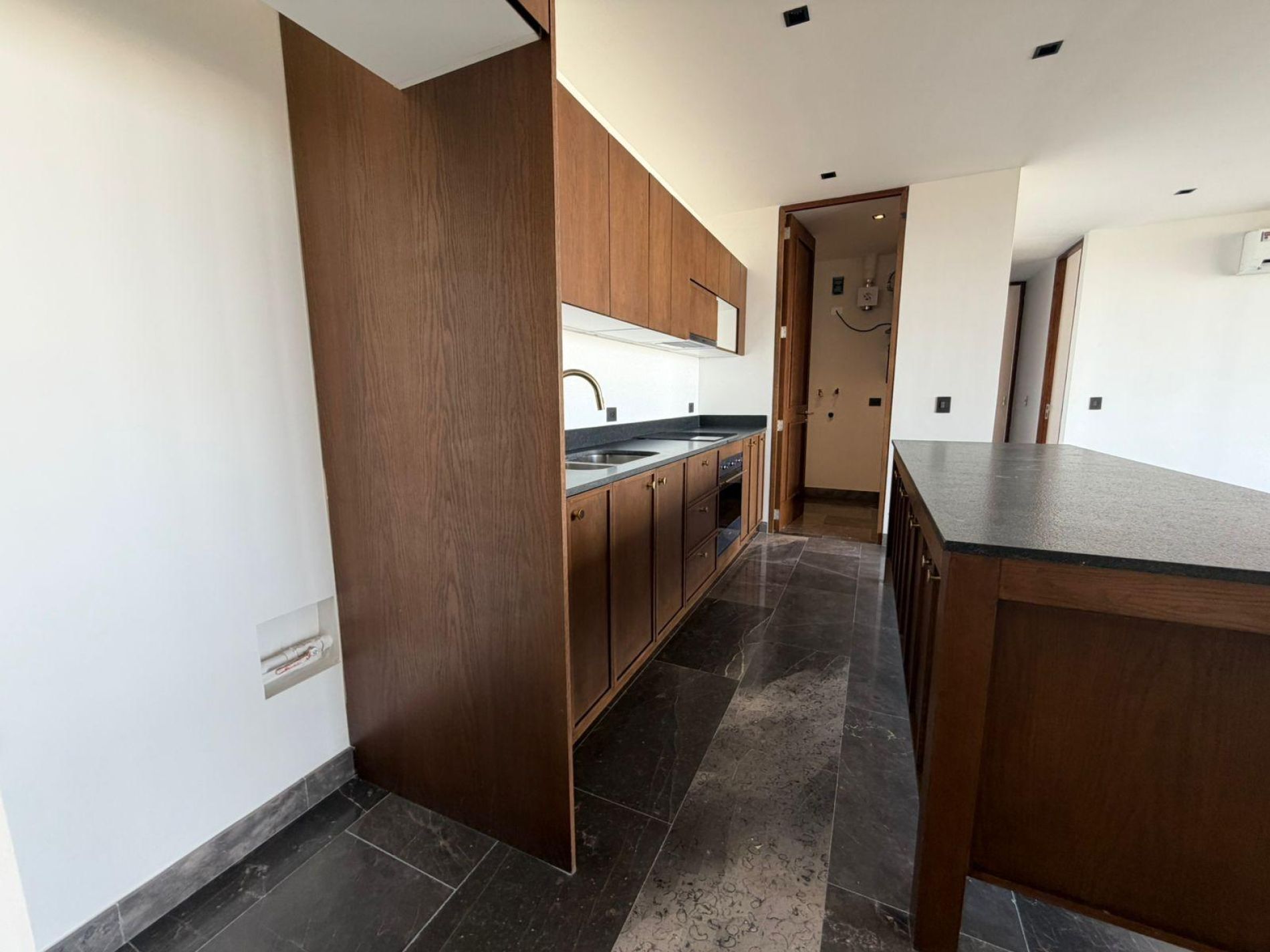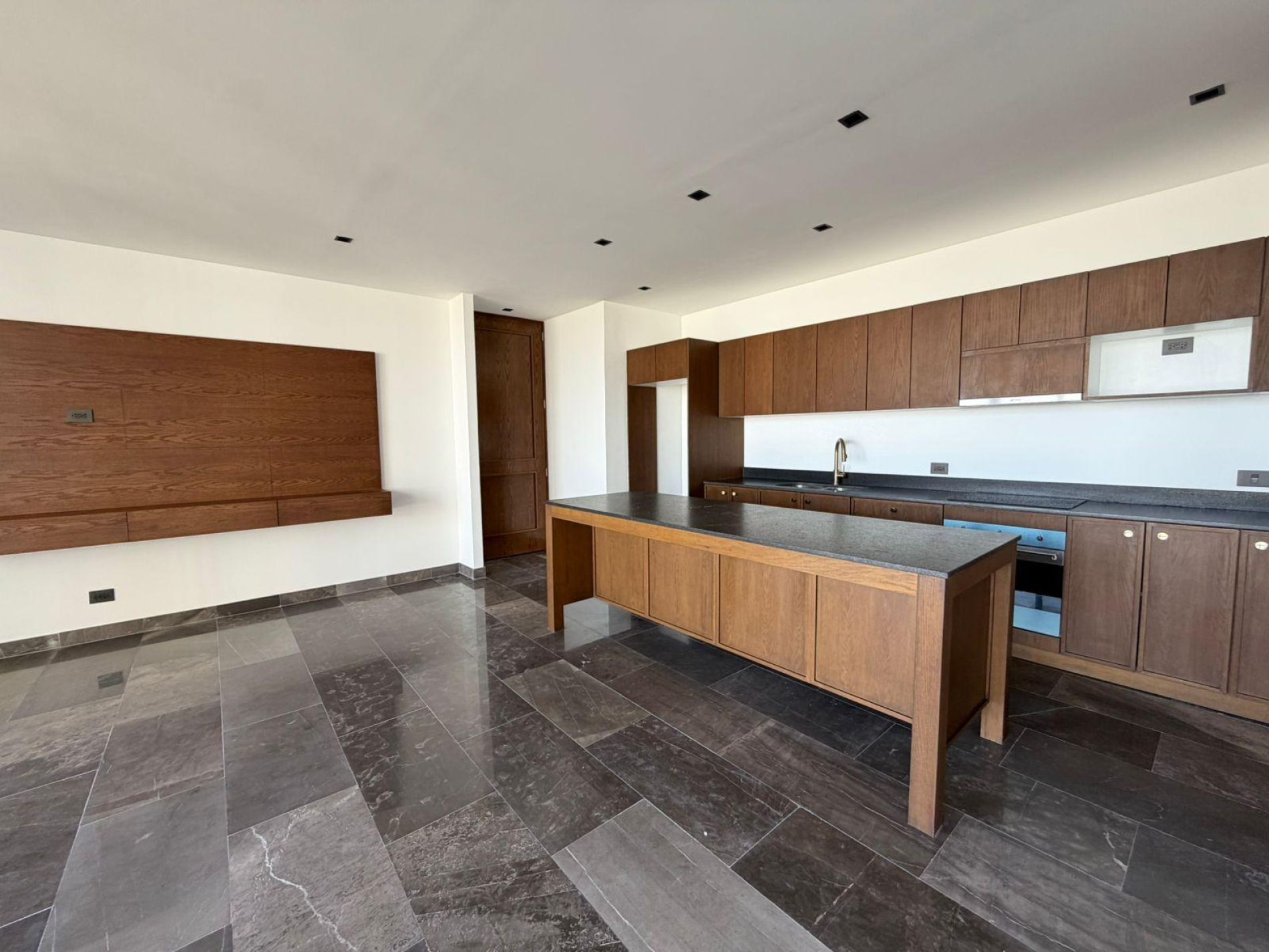 Cocina equipada con con parrilla eléctrica, campana, horno e isla