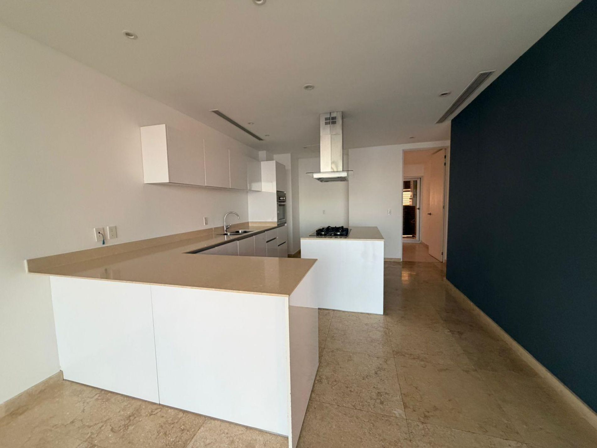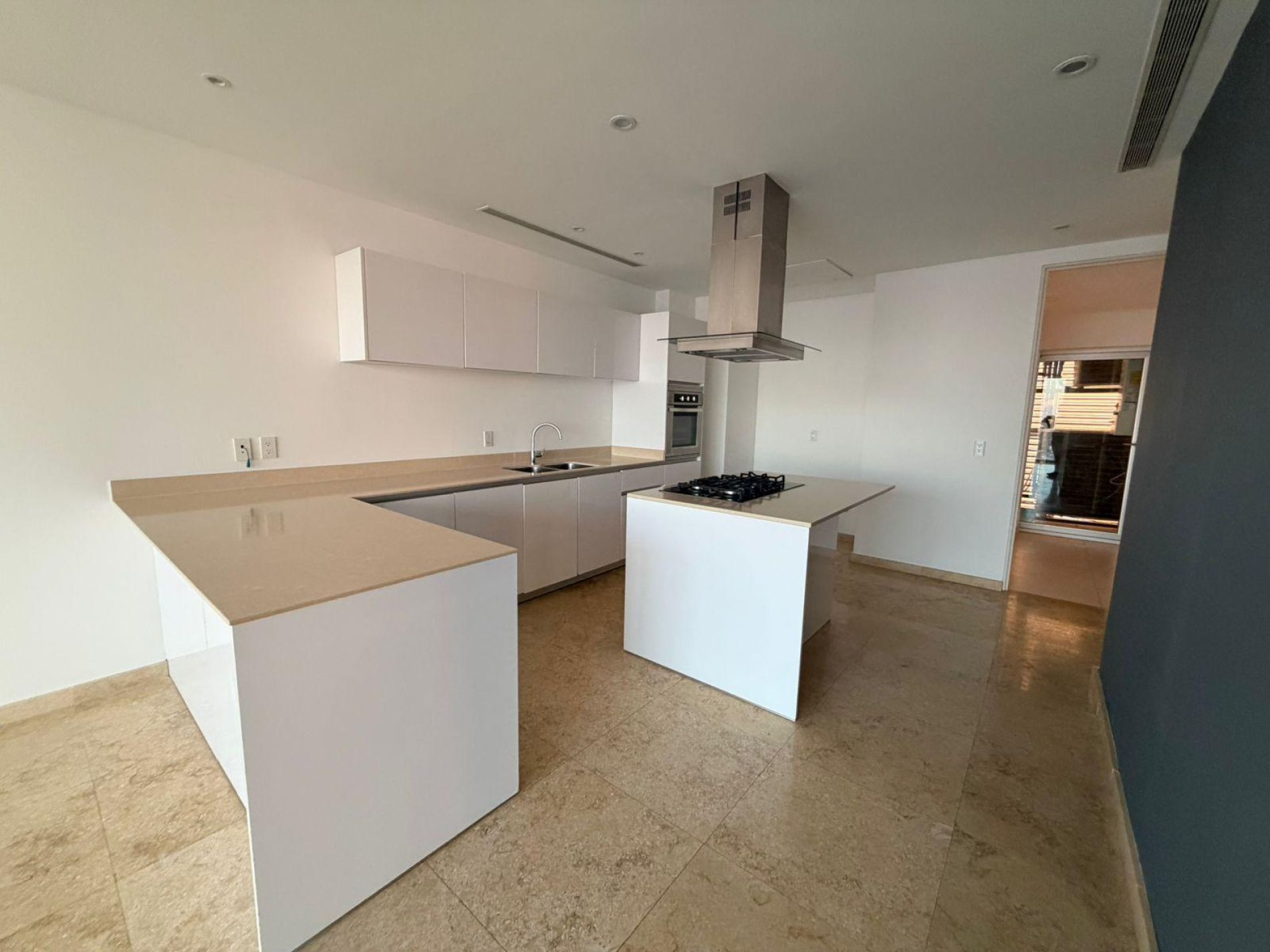 Cocina con isla y parrilla eléctrica.