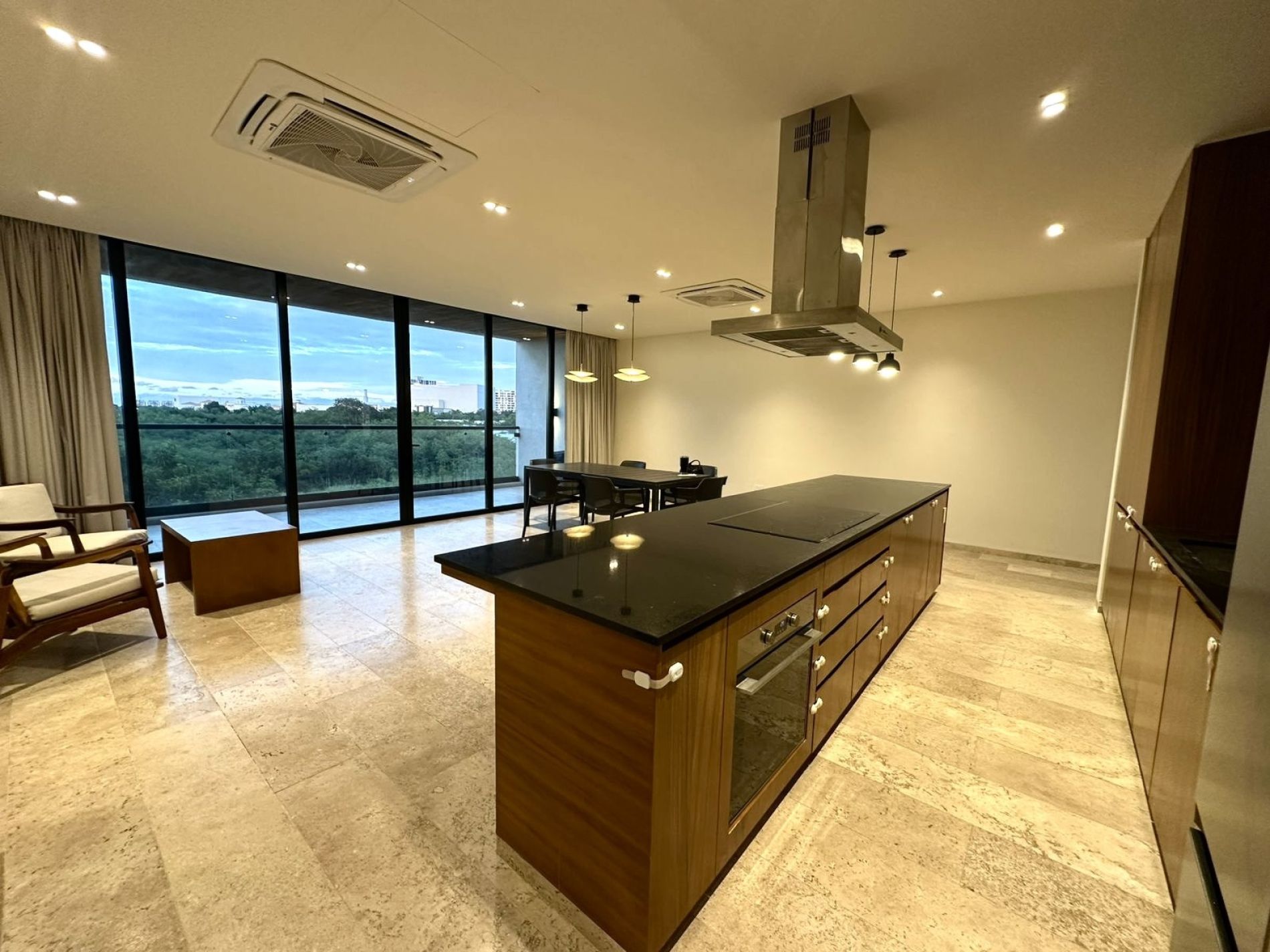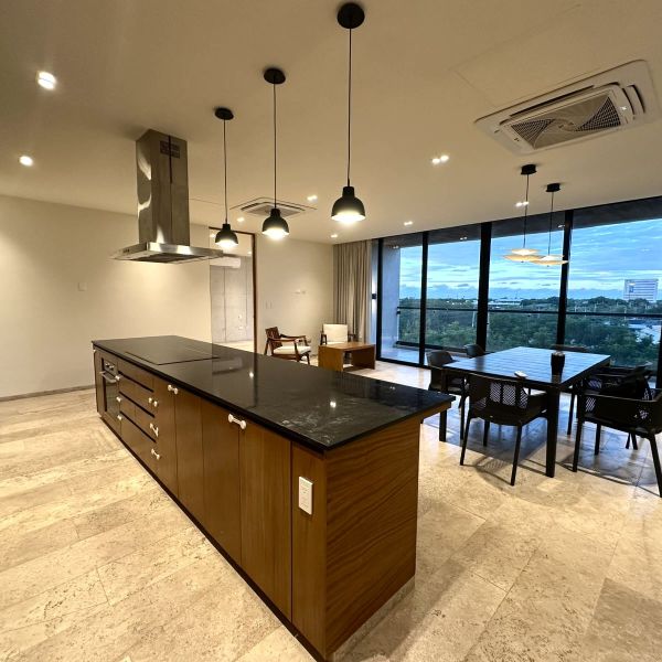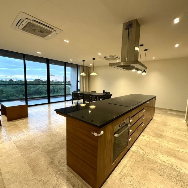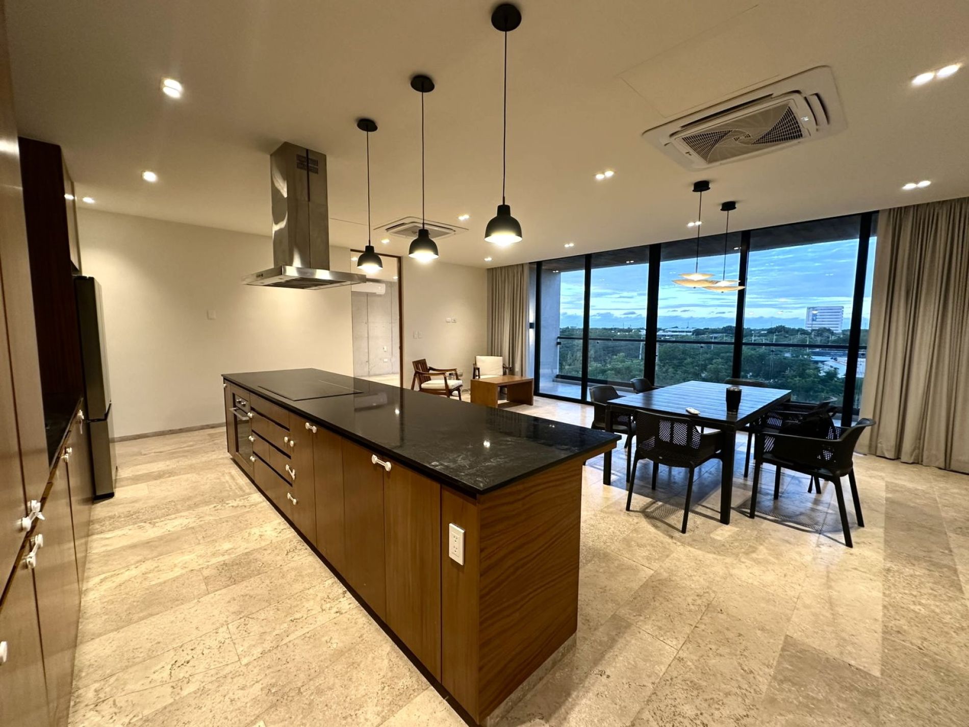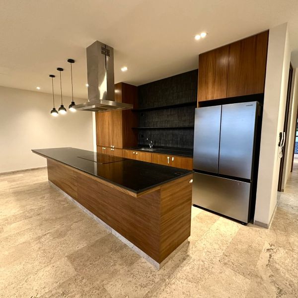 Cocina equipada con refrigerador, isla, parrilla eléctrica, campana, horno eléctrico