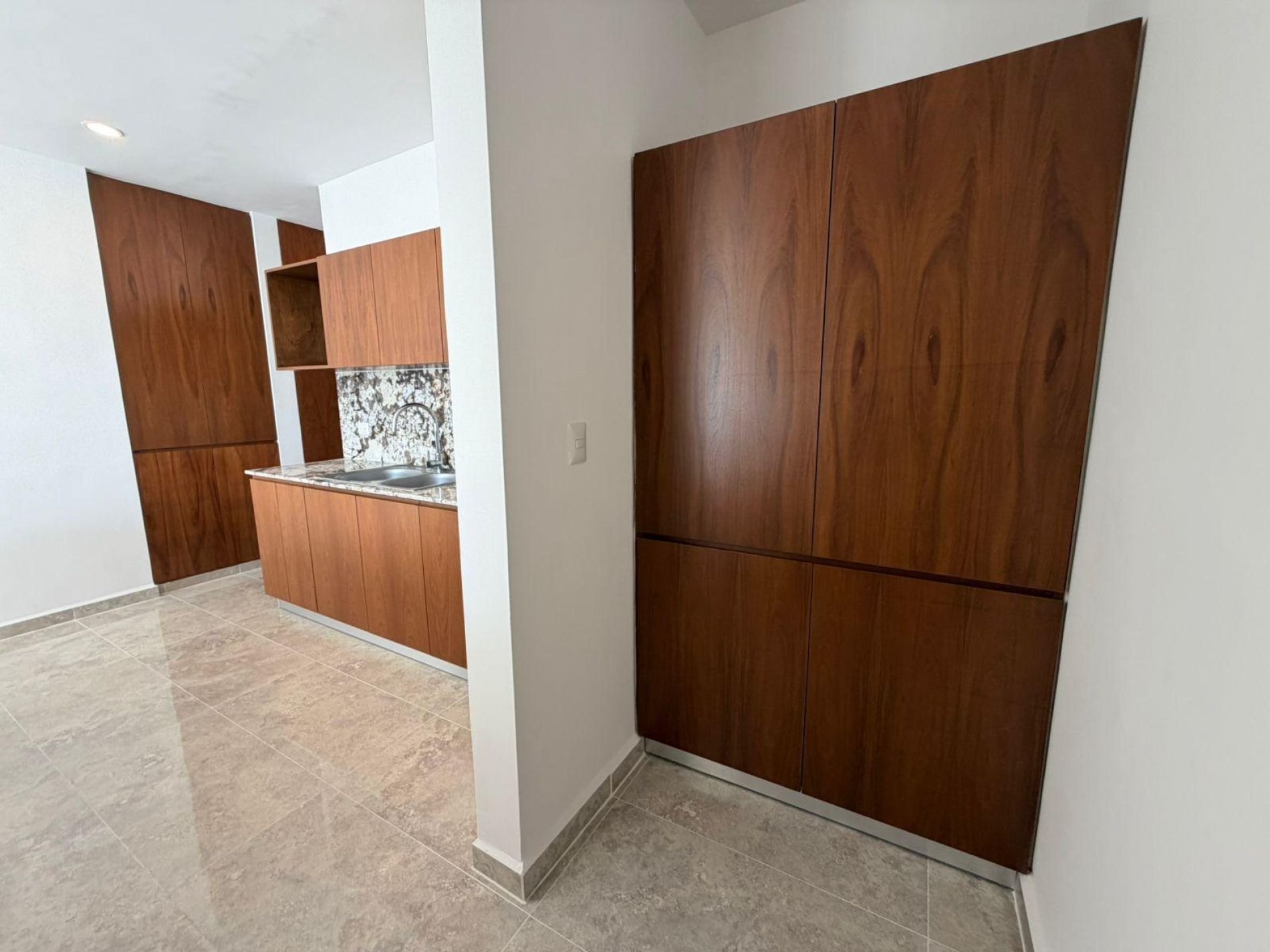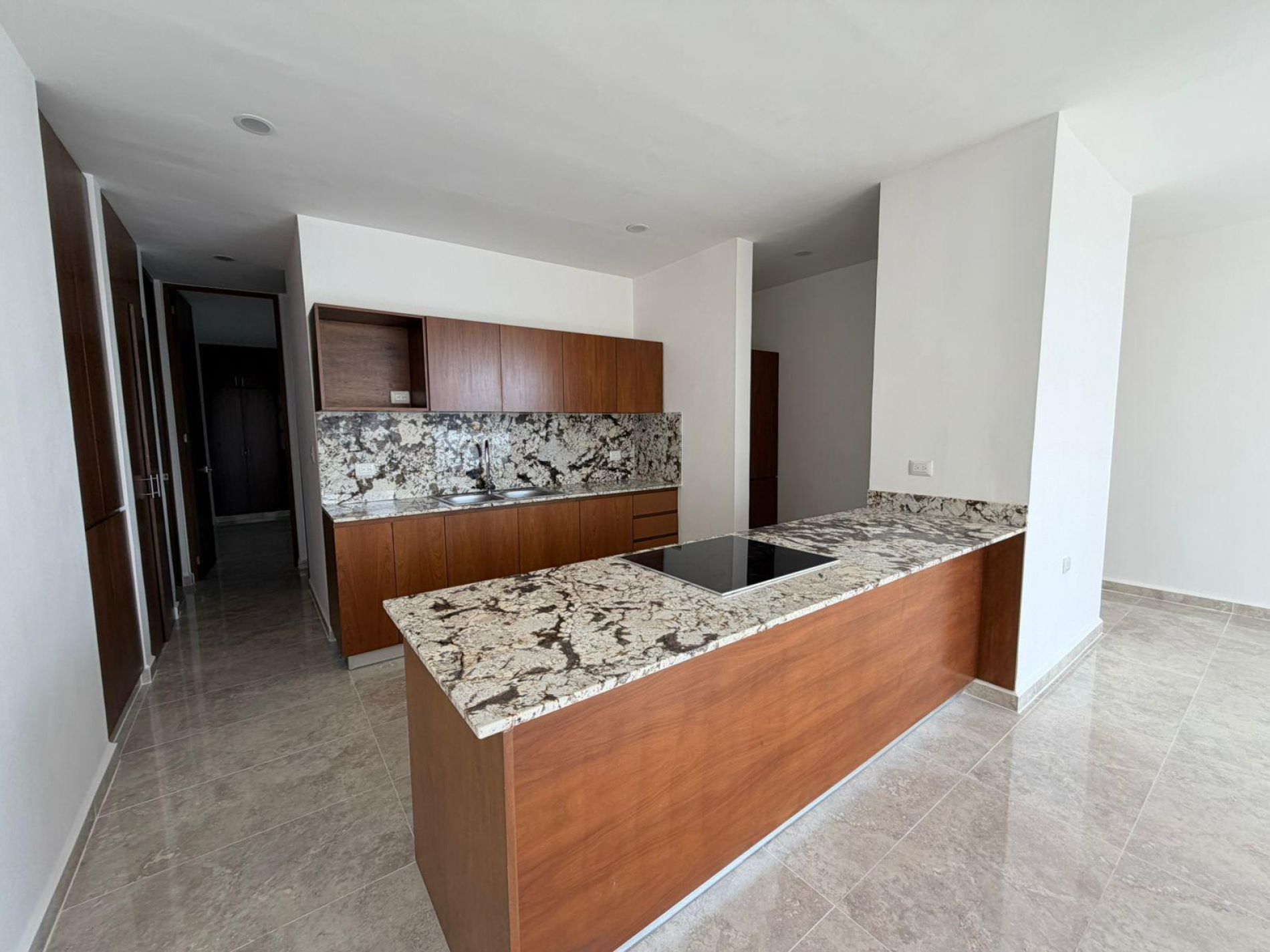 Cocina integral equipada con parrilla eléctrica, barra desayunadora y alacena