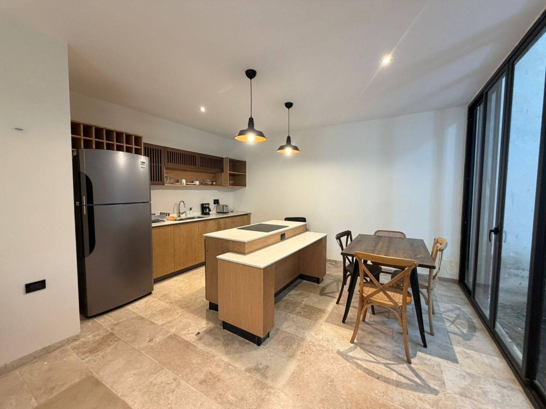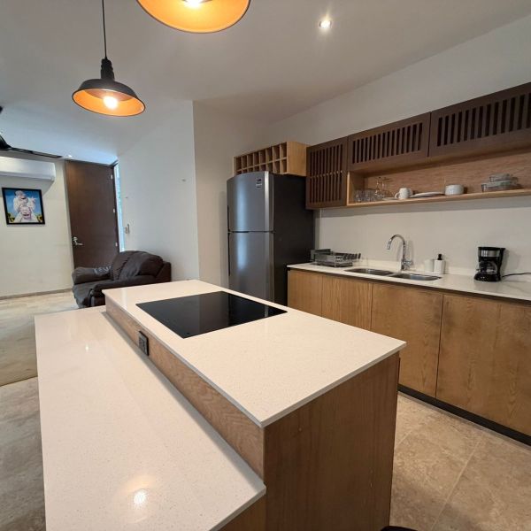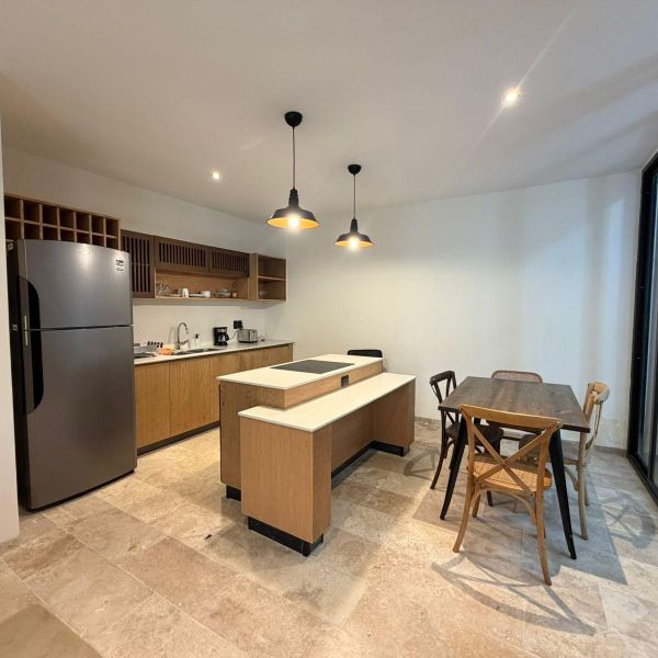 Cocina equipada con isla, refrigerador y parrilla eléctrica.