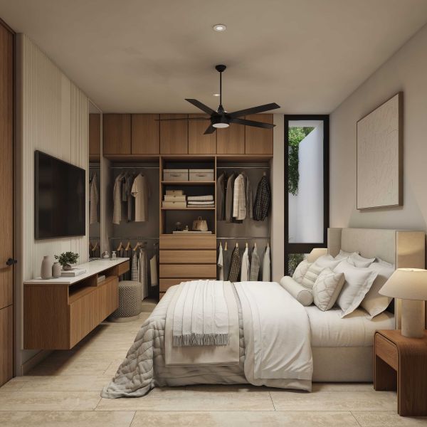 Recámara principal con clóset semi vestido y baño completo
