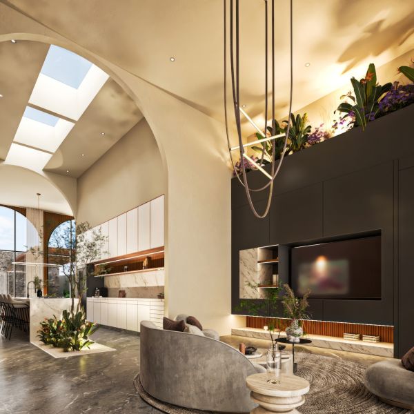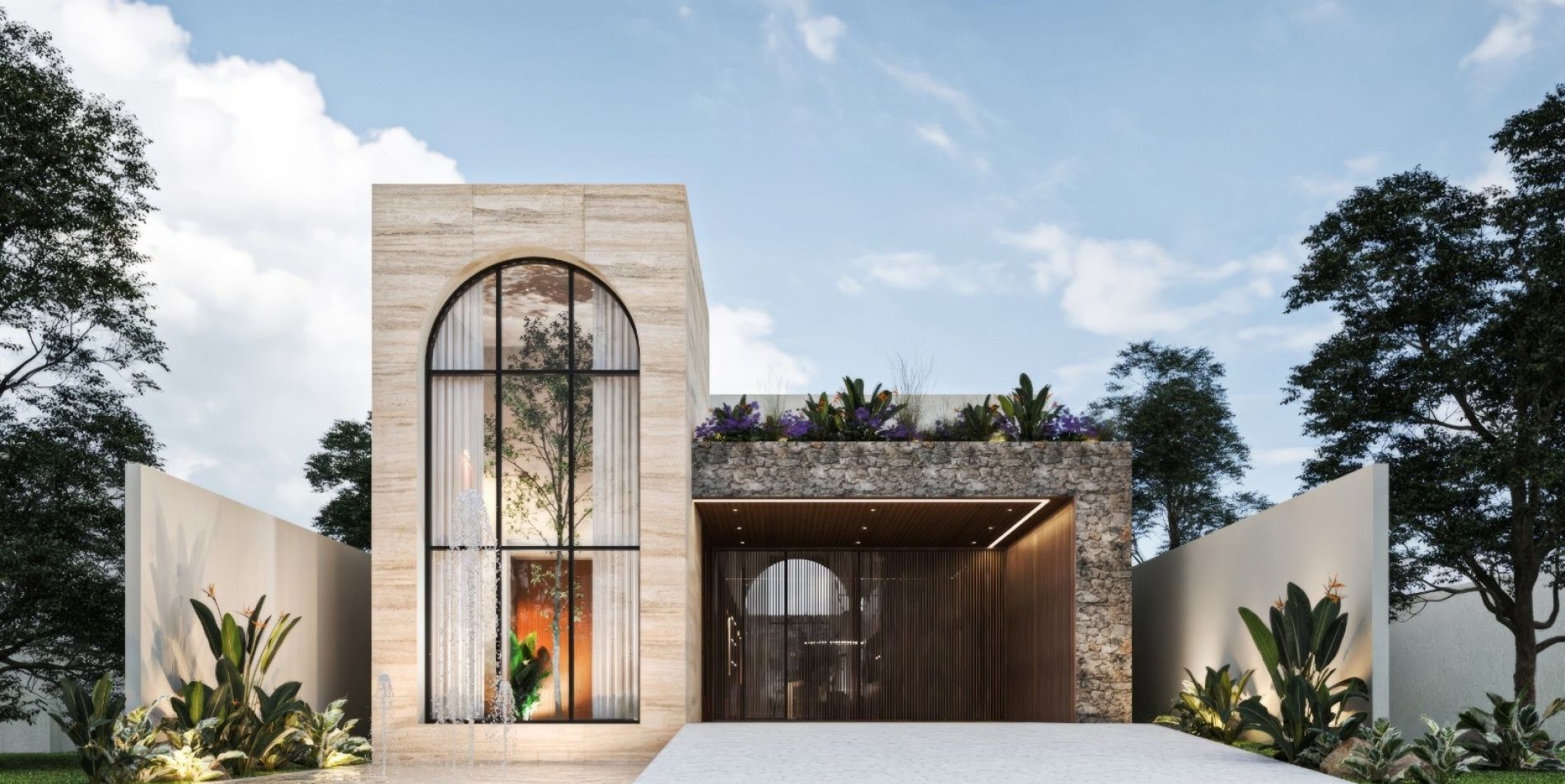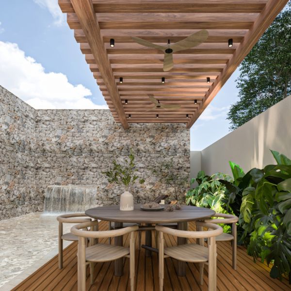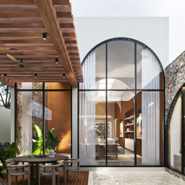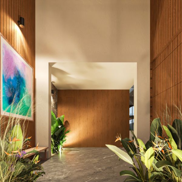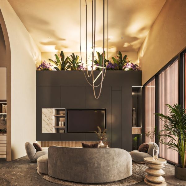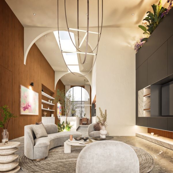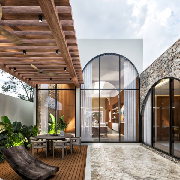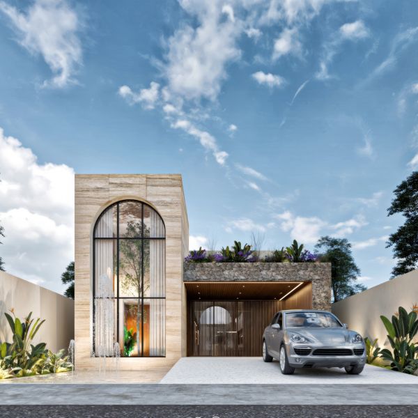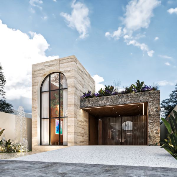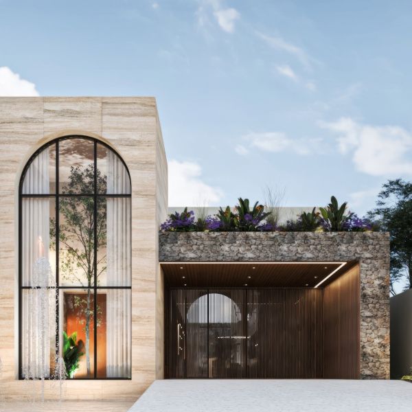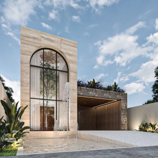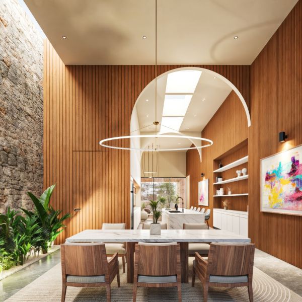 Residencia de lujo con arquitectura contemporánea, dobles alturas y acabados en chukum y piedra natural que crean un estilo sofisticado, complementada con tecnología smart home para mayor confort y seguridad.
