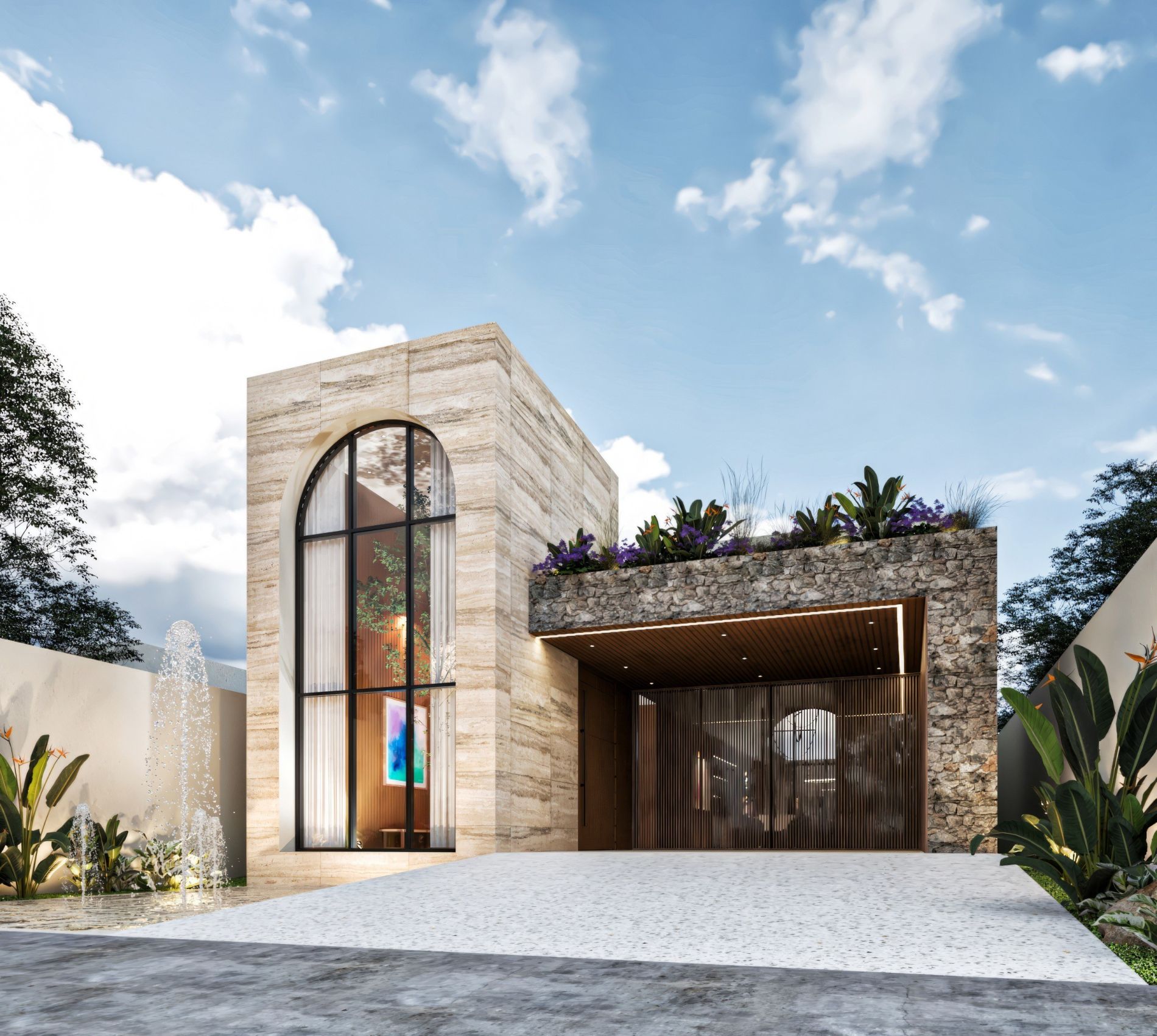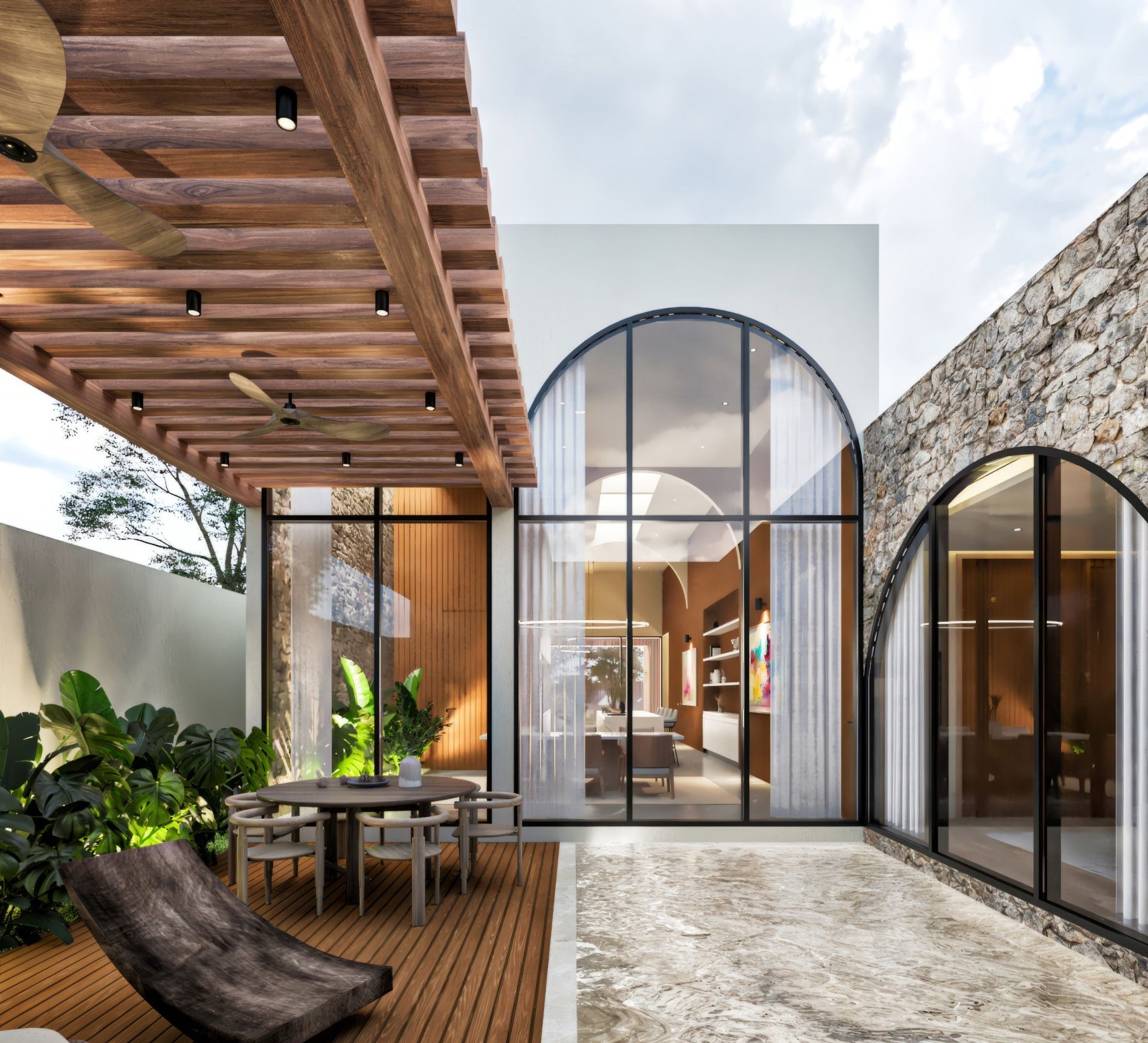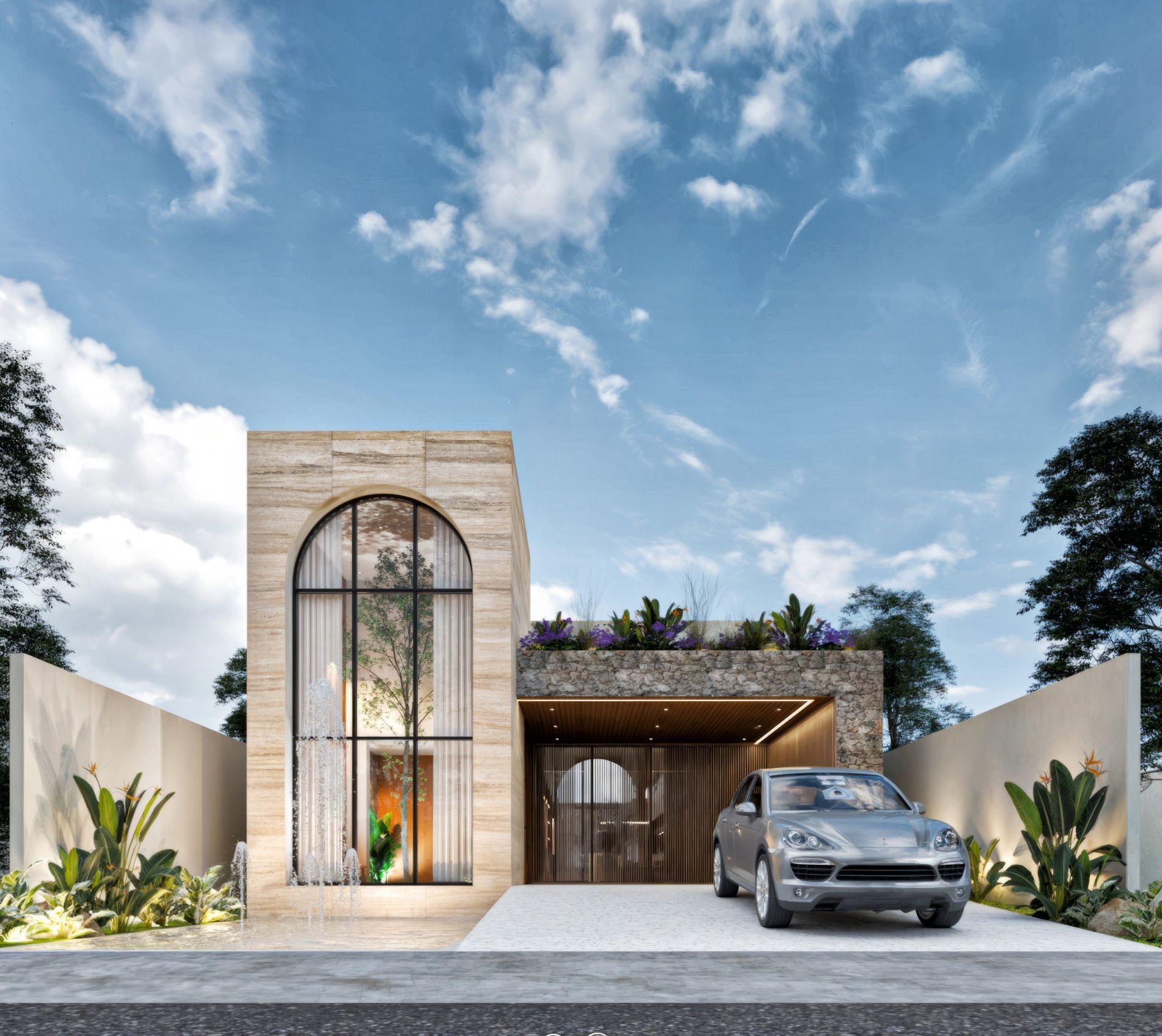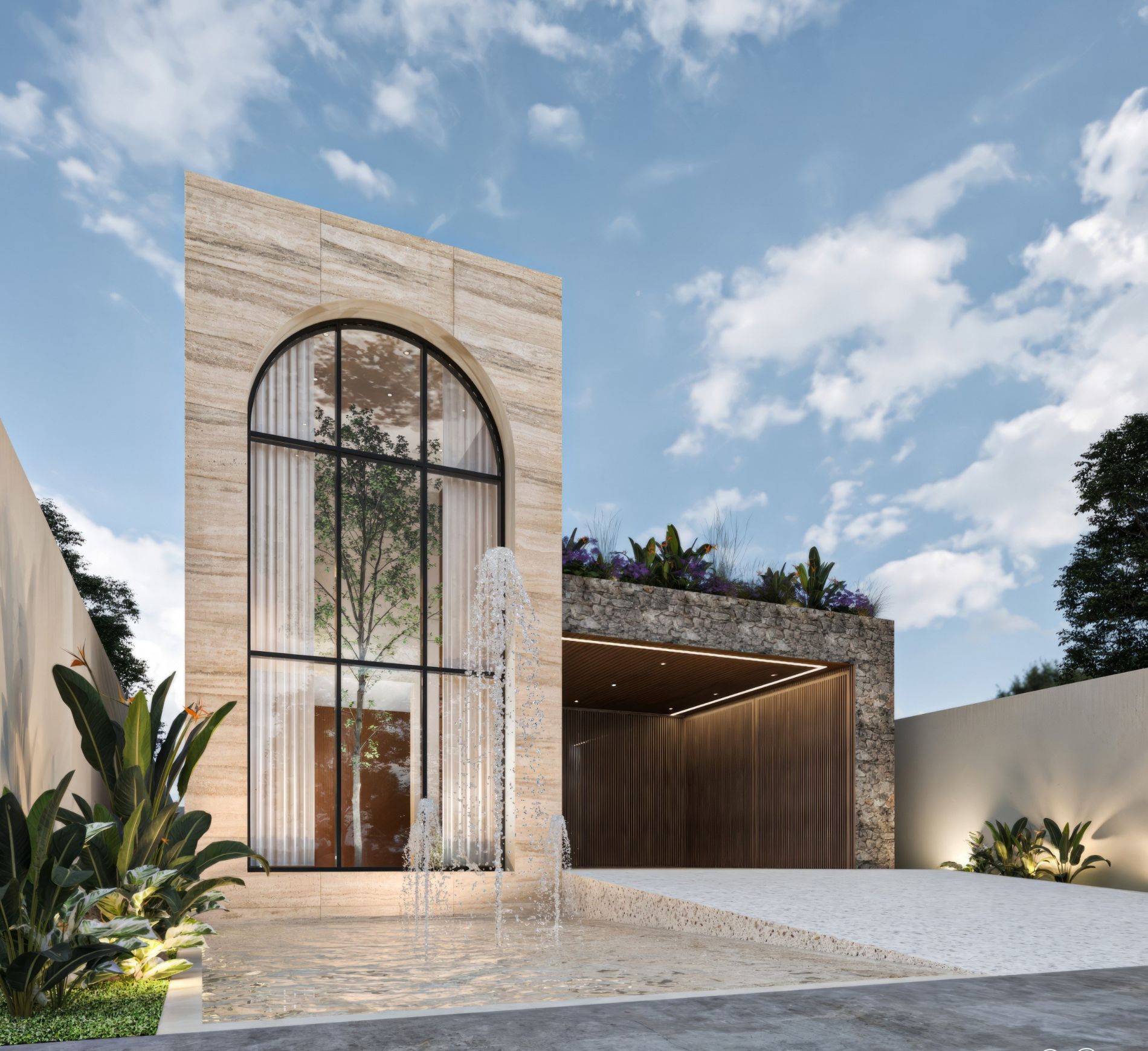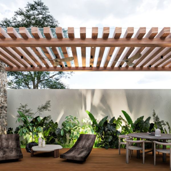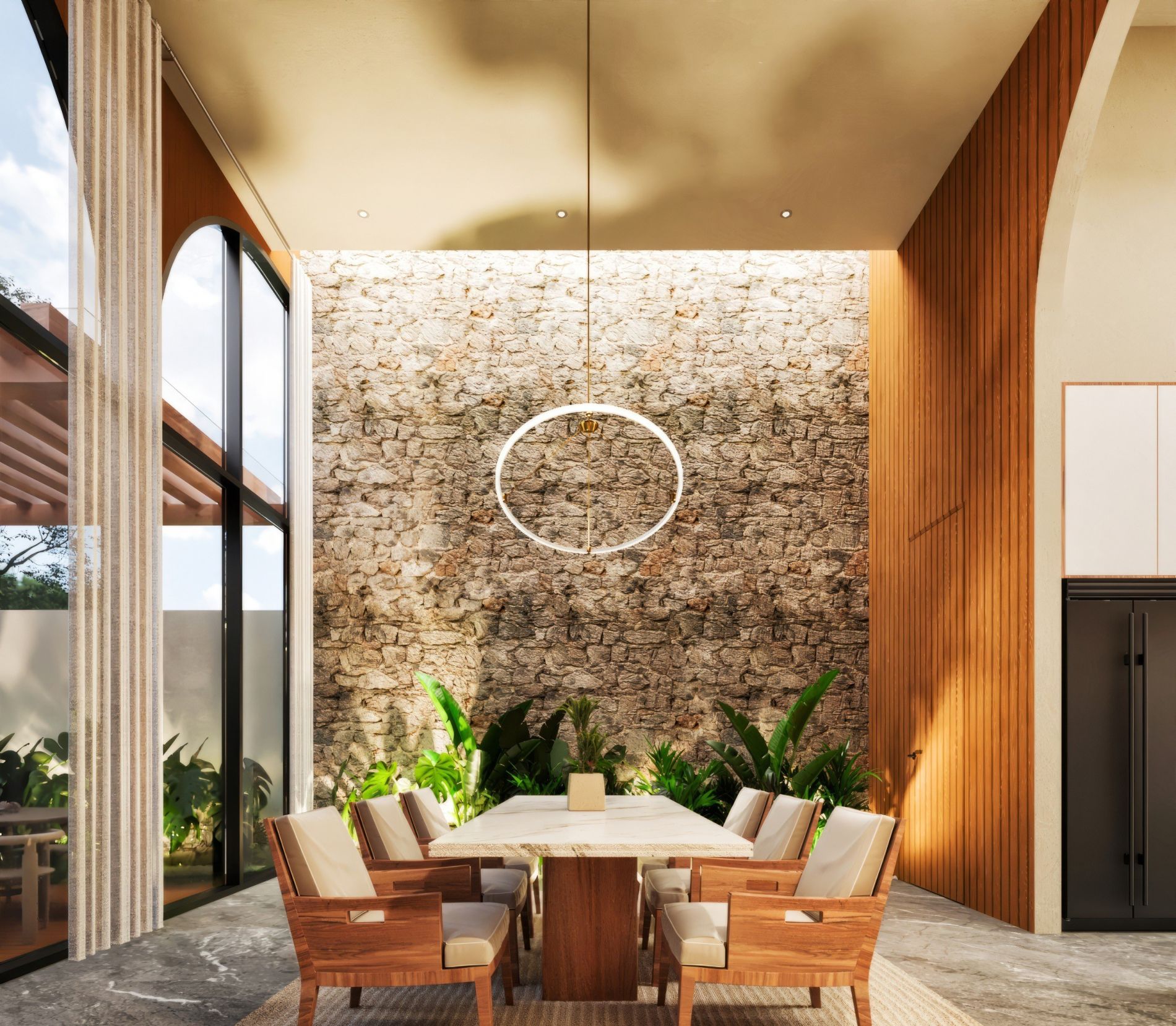 Residencia de lujo con arquitectura contemporánea, dobles alturas y acabados en chukum y piedra natural que crean un estilo sofisticado, complementada con tecnología smart home para mayor confort y seguridad.