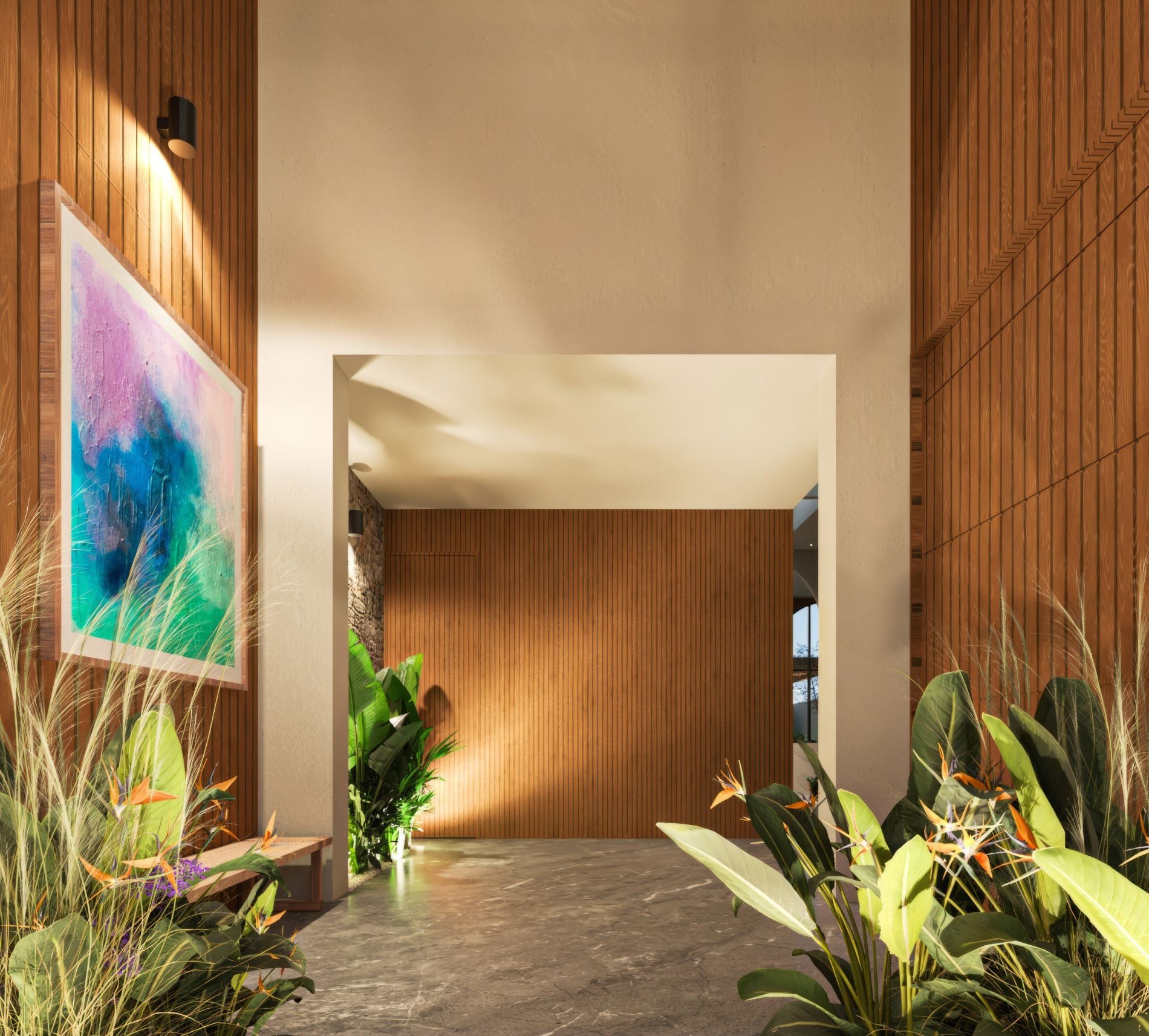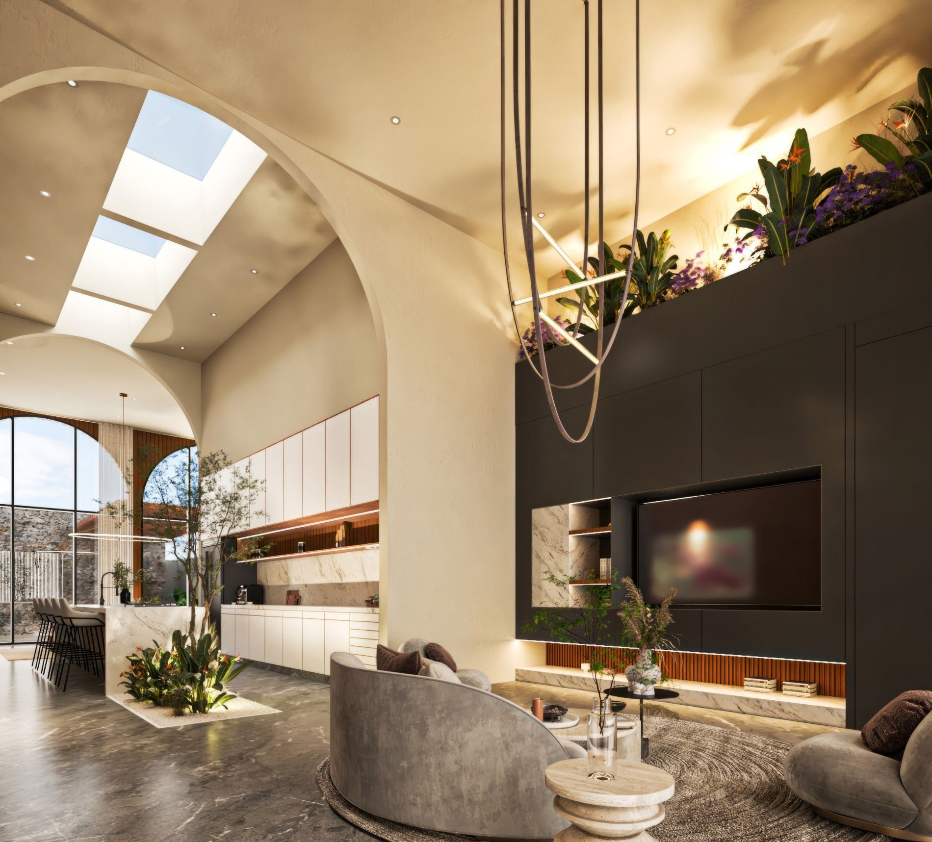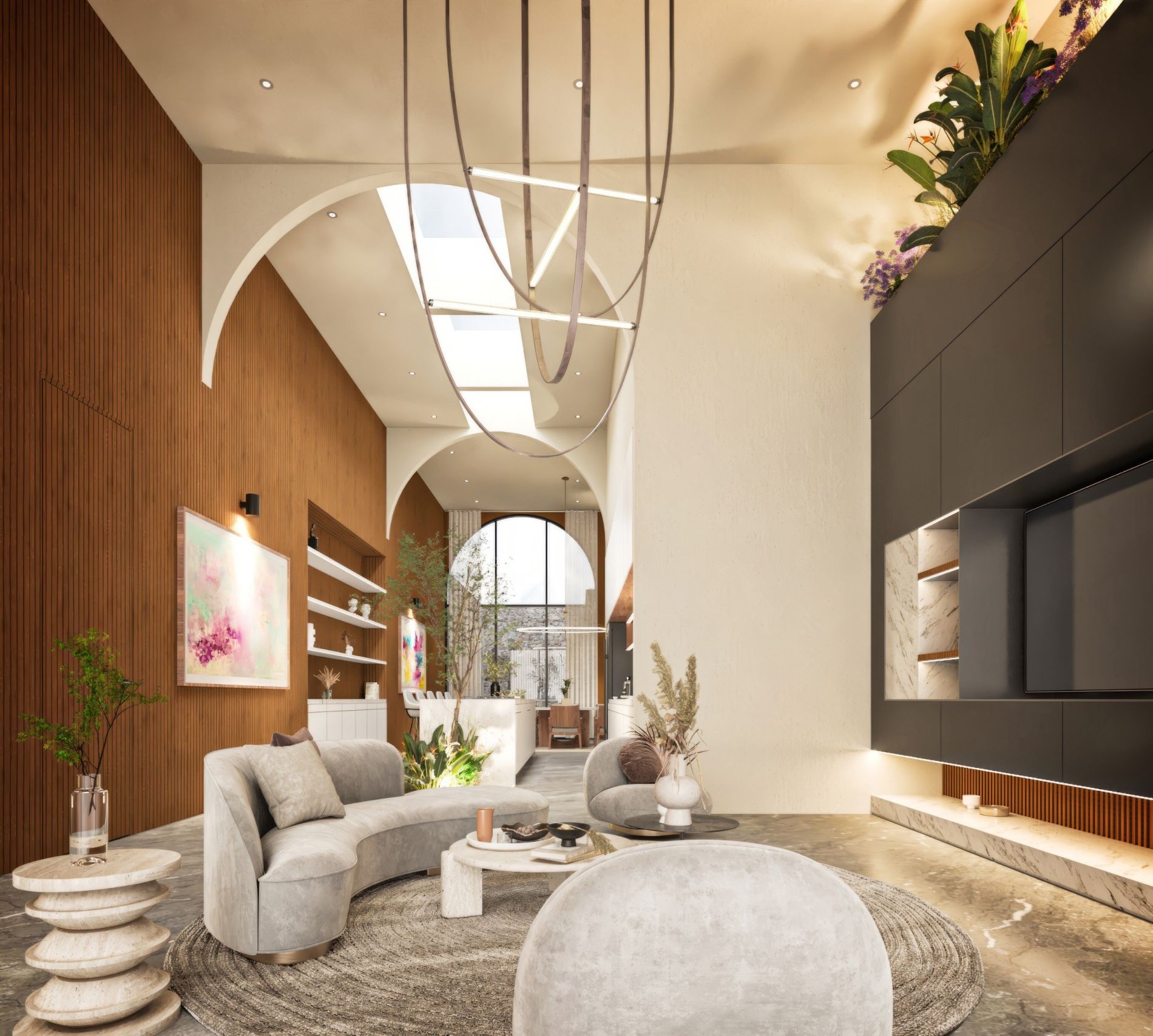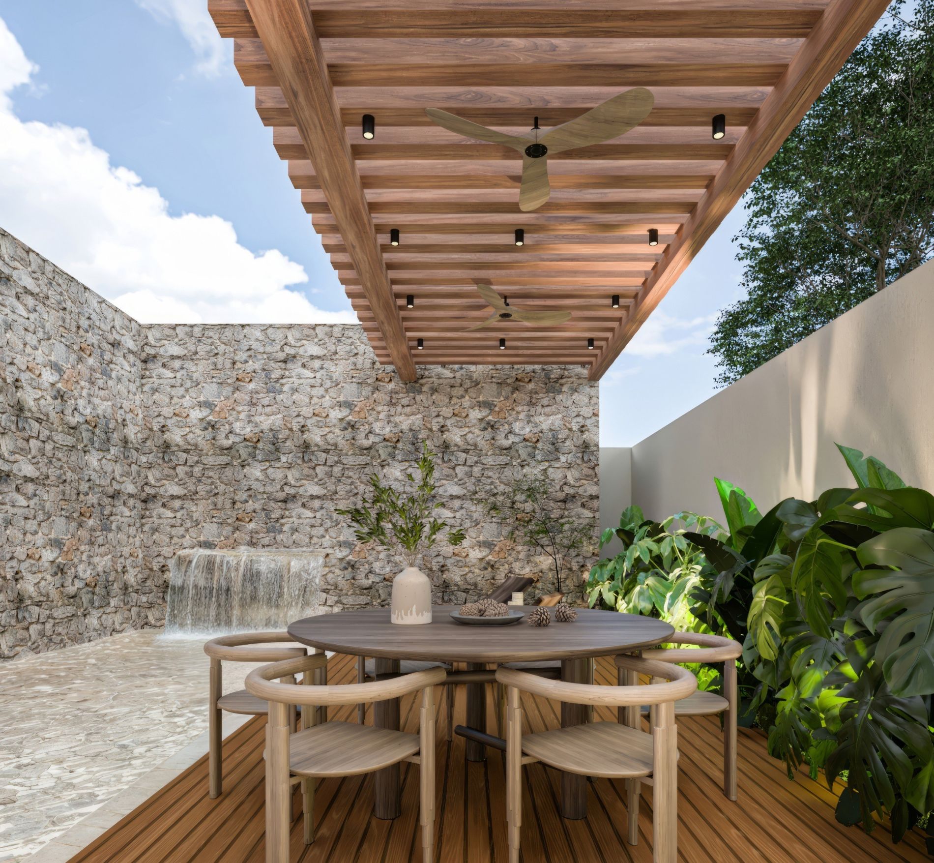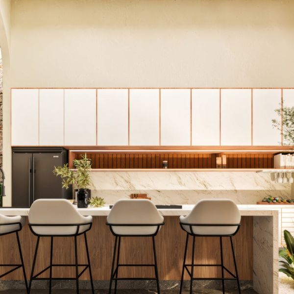 Residencia de lujo con arquitectura contemporánea, dobles alturas y acabados en chukum y piedra natural que crean un estilo sofisticado, complementada con tecnología smart home para mayor confort y seguridad.