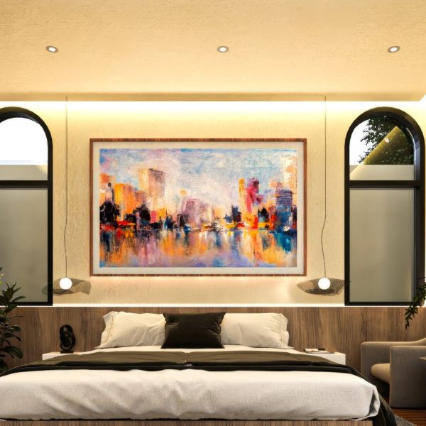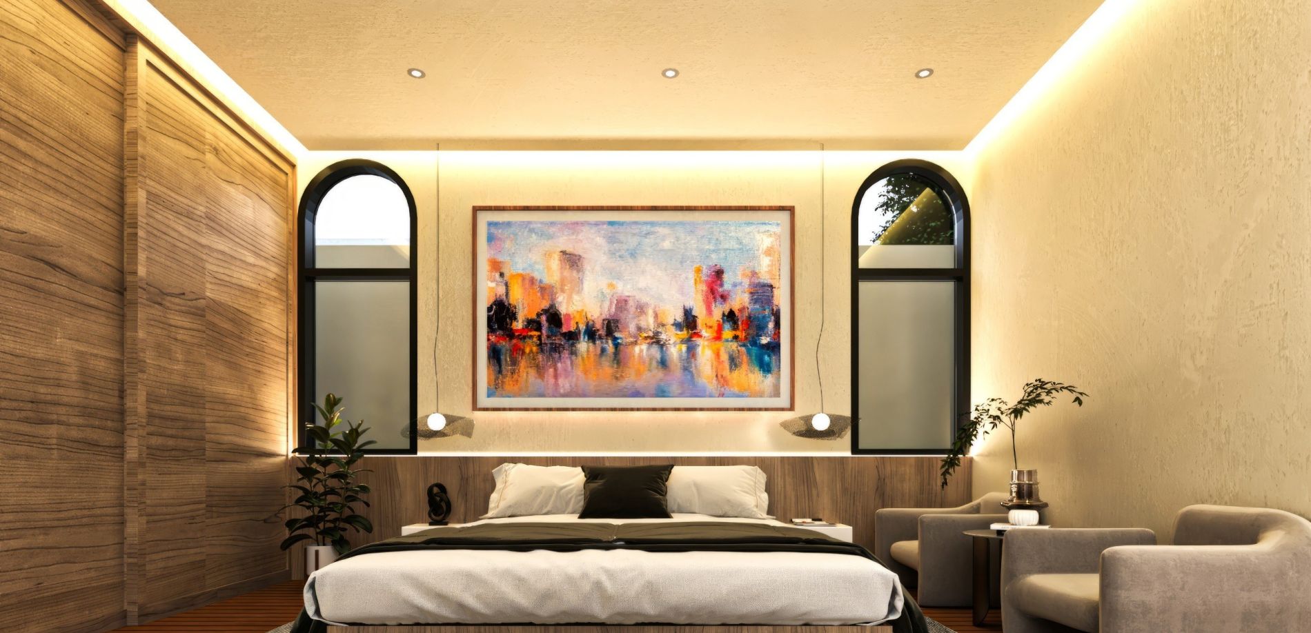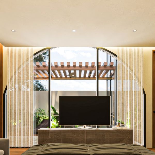 Recámara principal con walking closet, baño completo y ventanal dirigido a la piscina