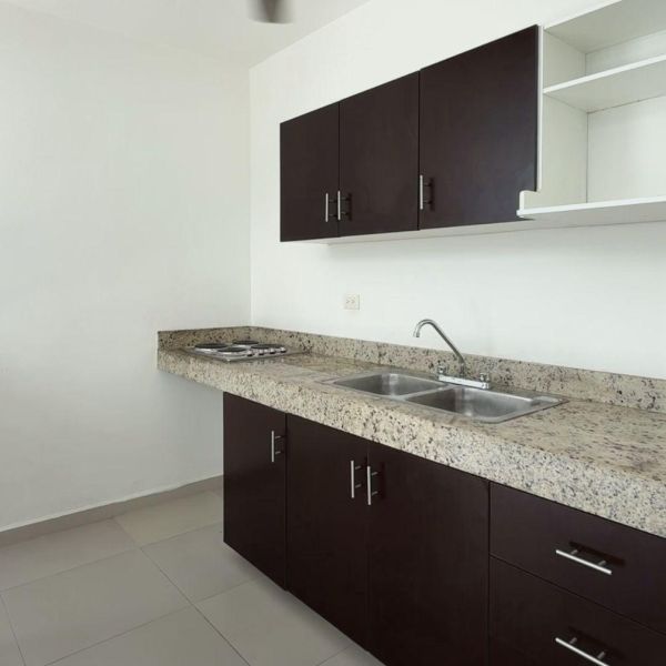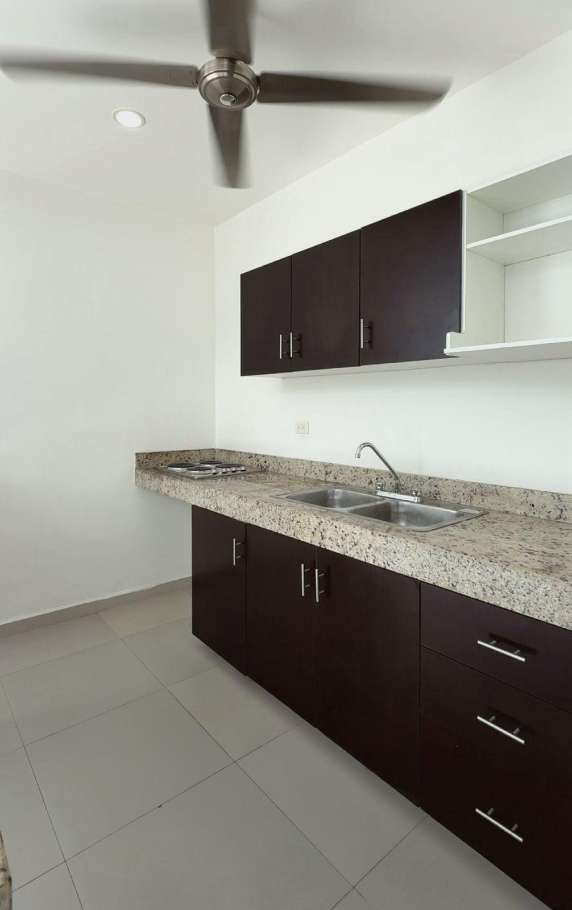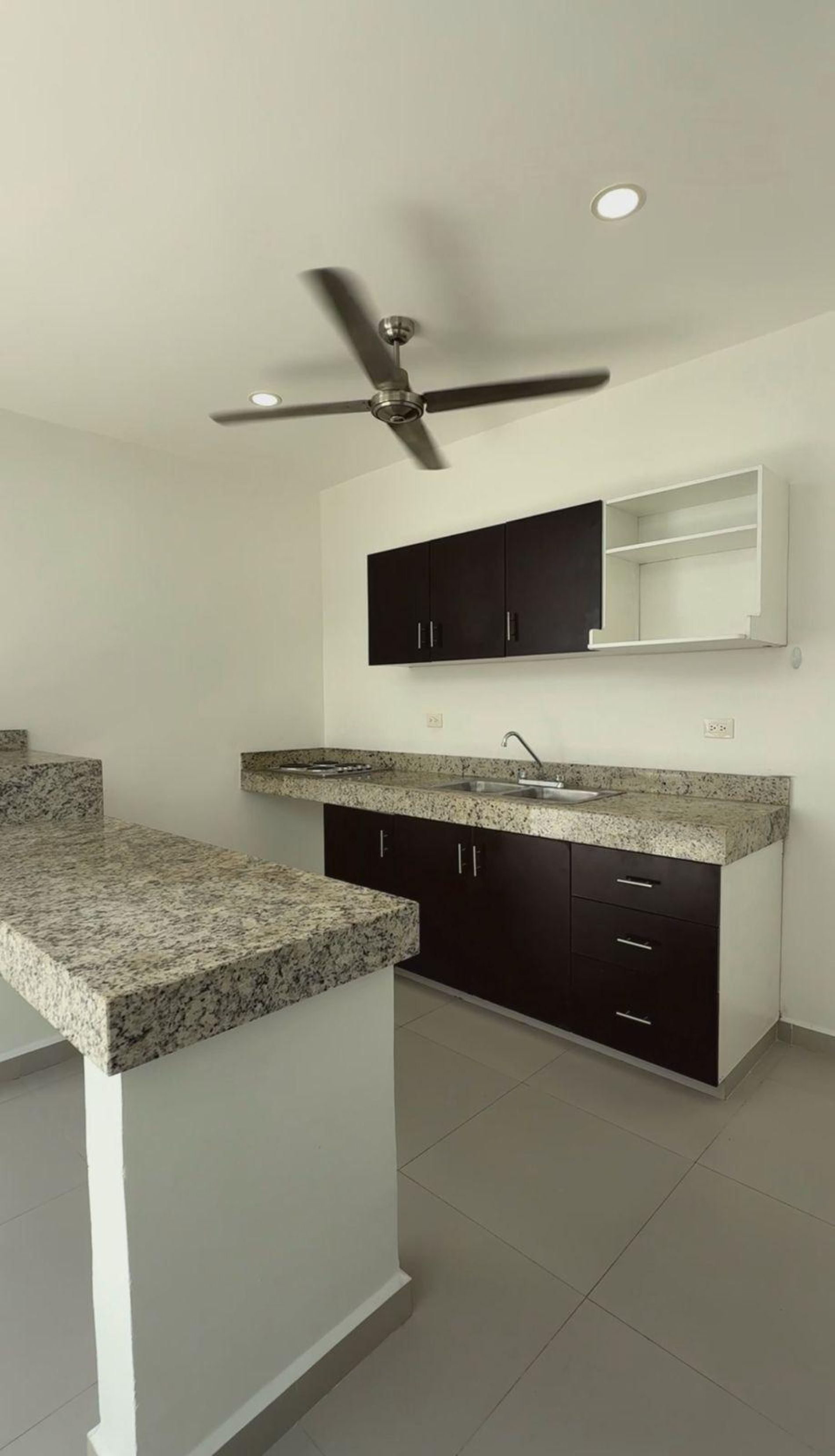 Cocina equipada con parrilla eléctrica de 4 quemadores, barra desayunadora y ventilador