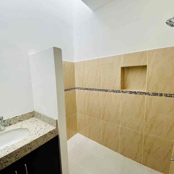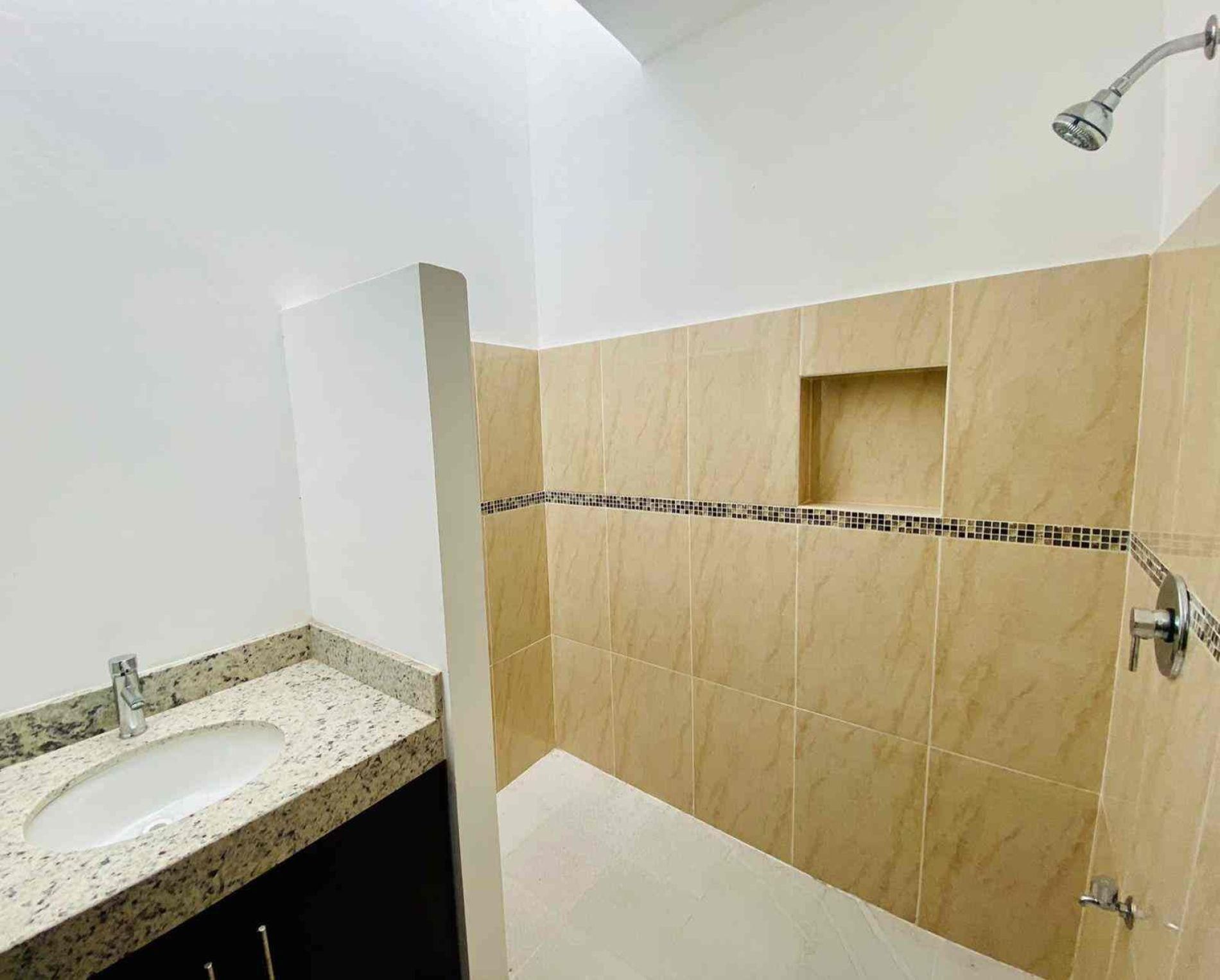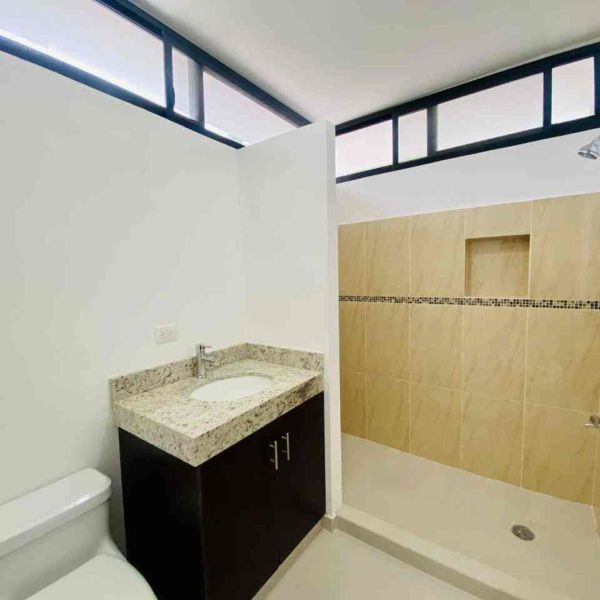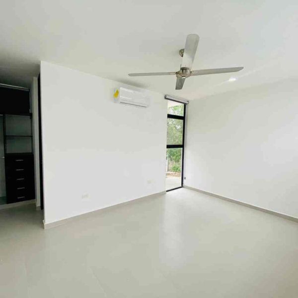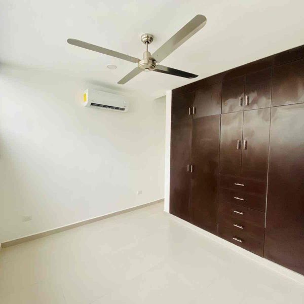Recámara secundaria con clóset, baño completo, ventilador y aire acondicionado.