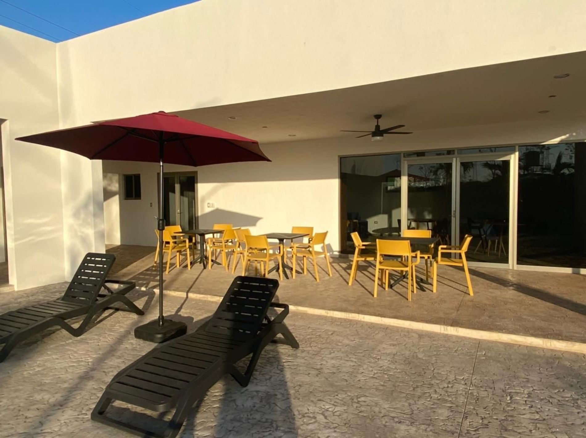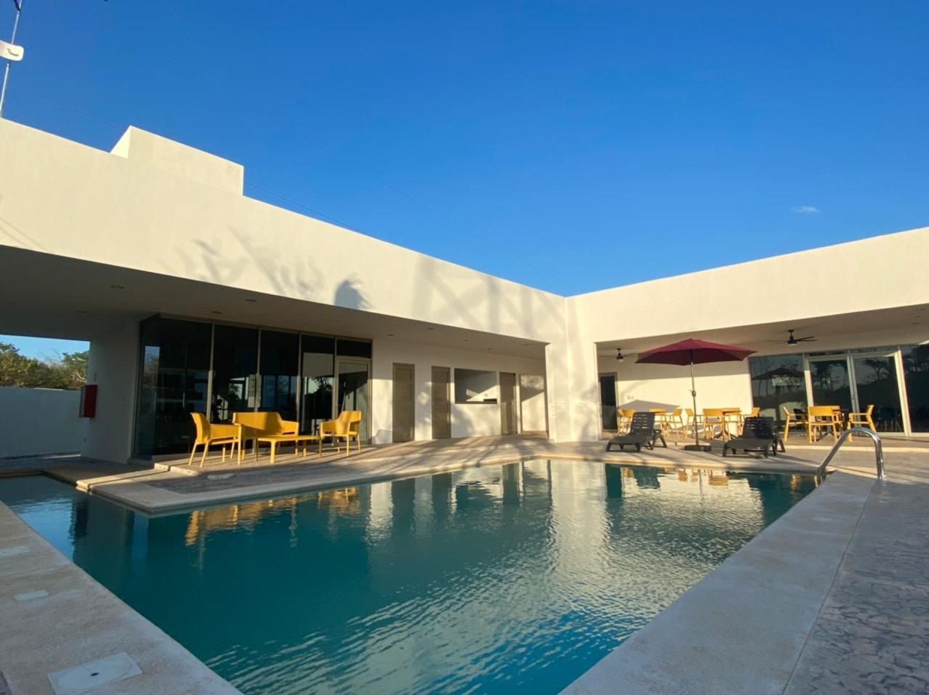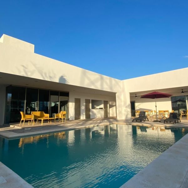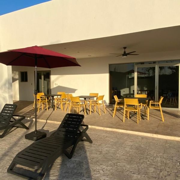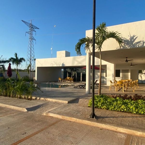 Casa club con alberca con canal de nado, gimnasio, bar, área climatizada, área de entretenimiento, baños, terraza con asoleadero.