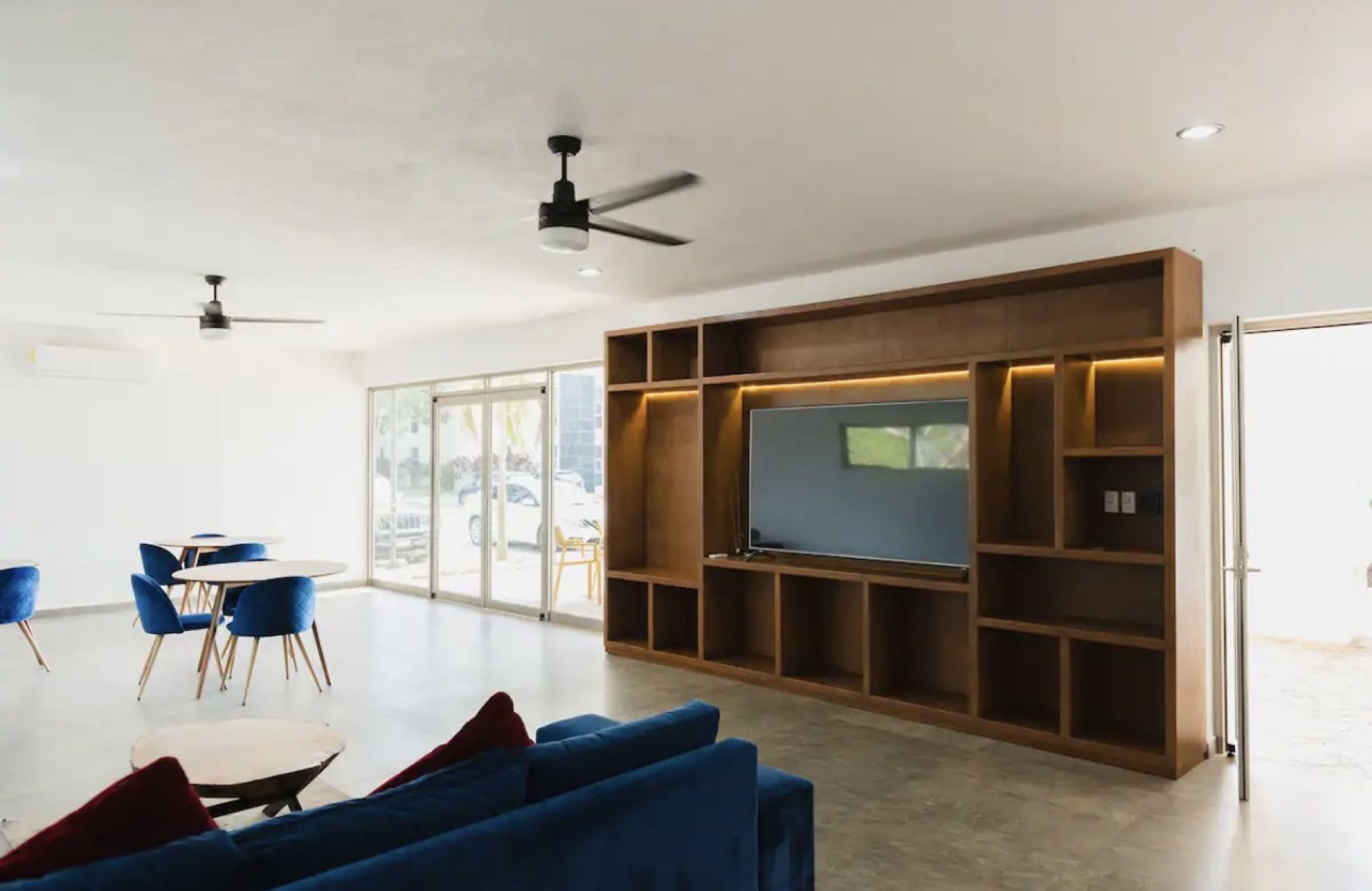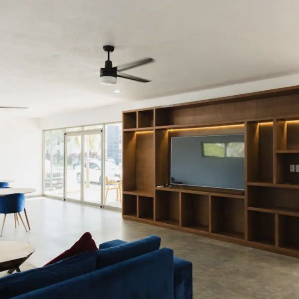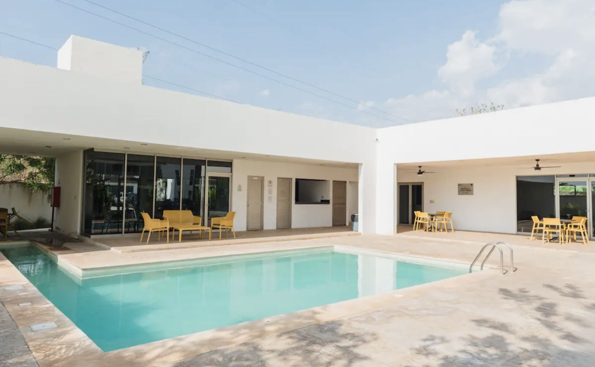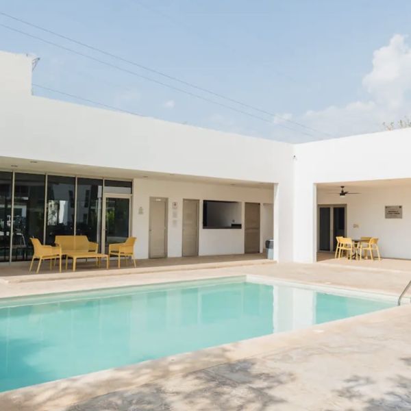 Casa club con: alberca con canal de nado, gimnasio, bar, área climatizada, área de entretenimiento, baños, terraza con asoleadero.