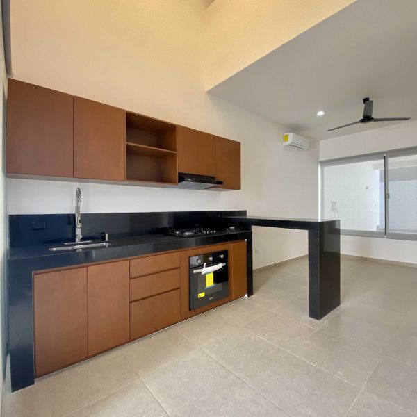 Parrilla de gas (4 quemadores), campana, horno, lámparas colgantes, persianas, 4 aires acondicionados, presurizador, ventiladores, cancelaría en baño, tanque estacionario, boiler de gas.