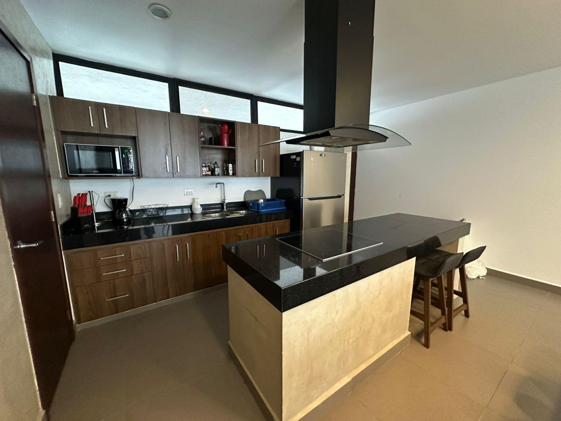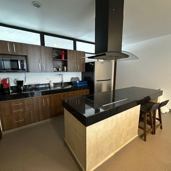 Cocina equipada con parrilla eléctrica, campana, horno eléctrico, microondas, alacena y barra desayunadora