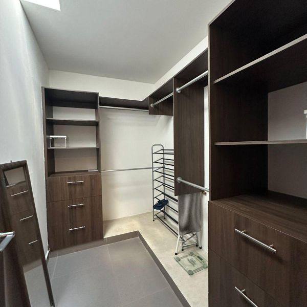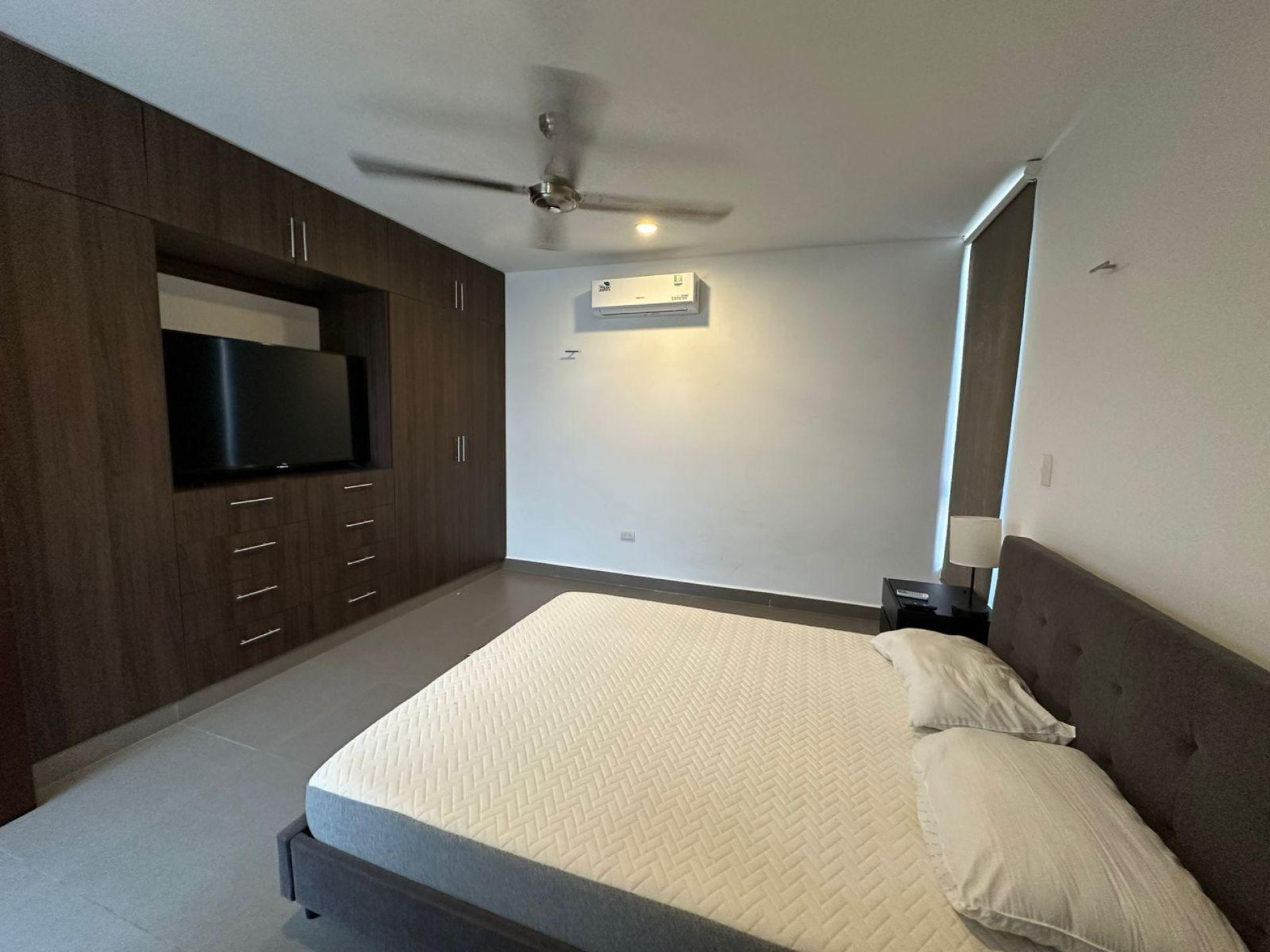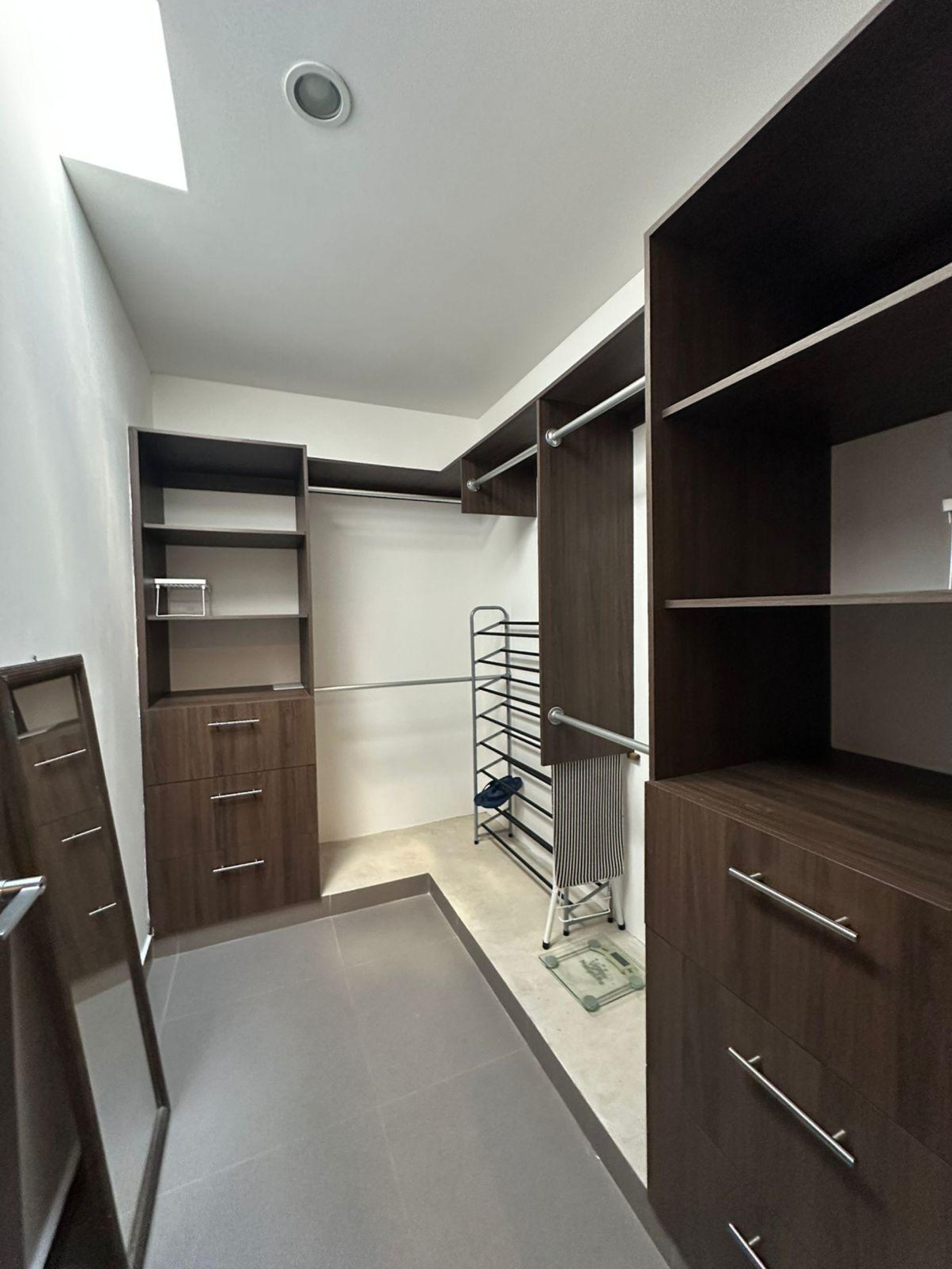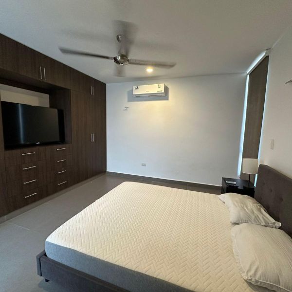 Recámara principal con cama queen size, TV, clóset vestidor y baño completo