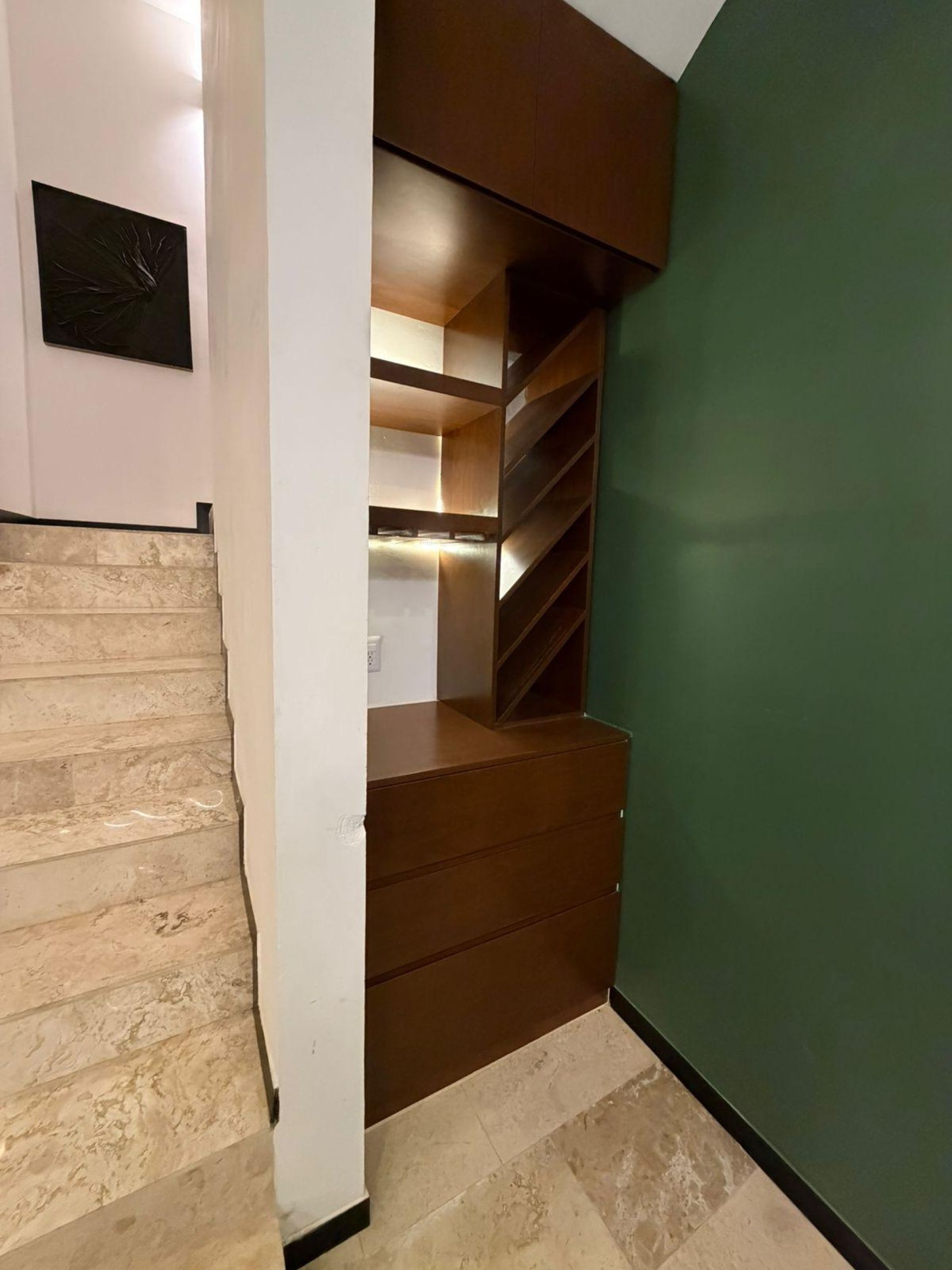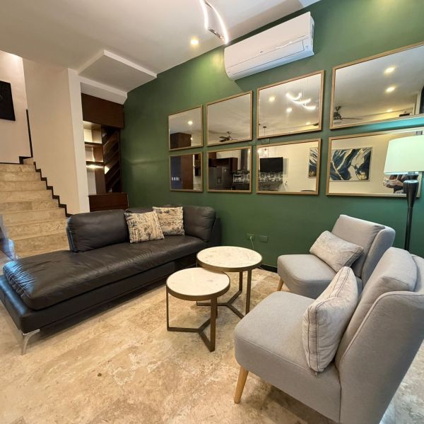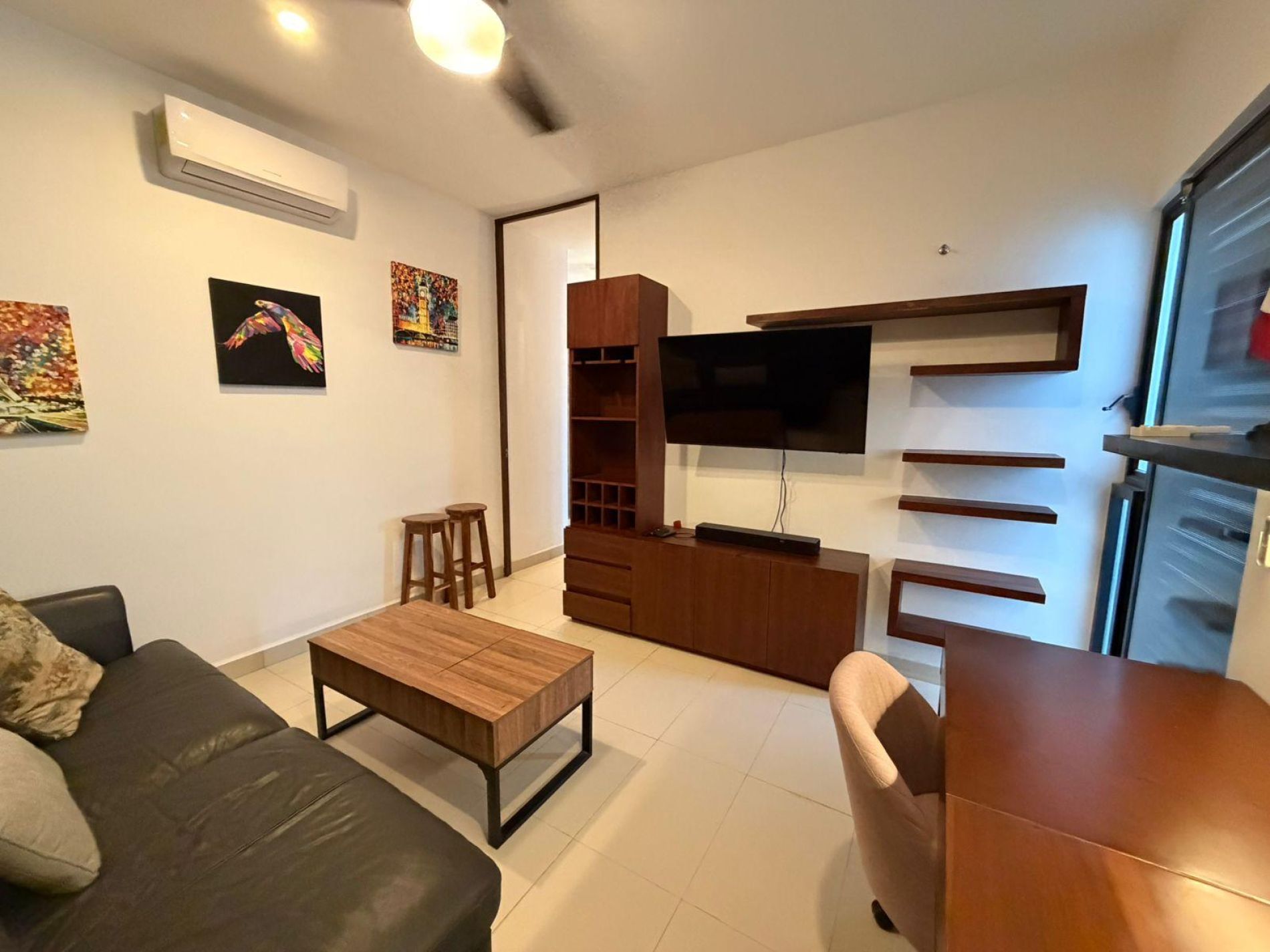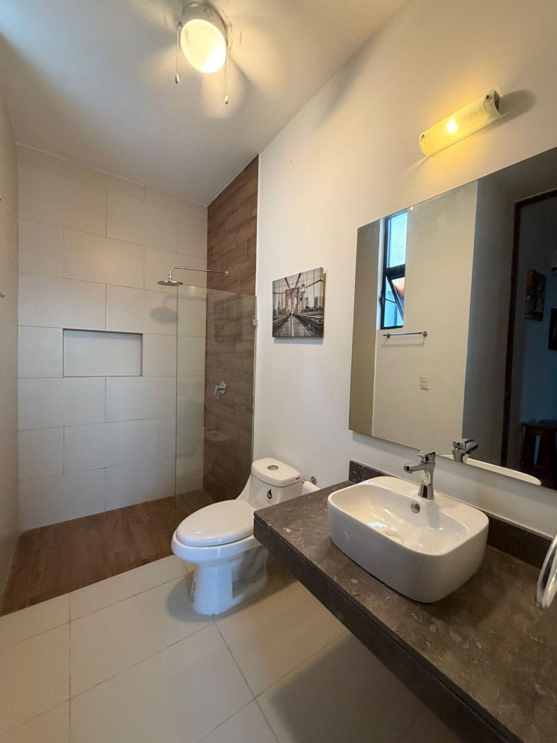 Tercera recámara con baño completo, adaptada como estudio/sala de TV y escritorios