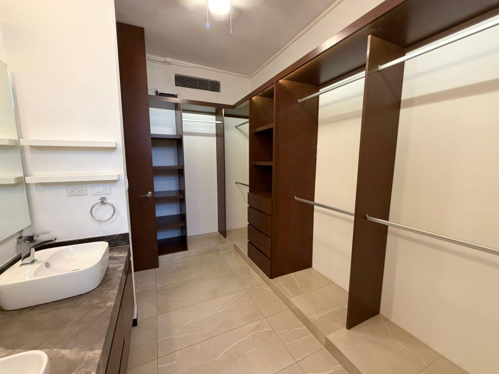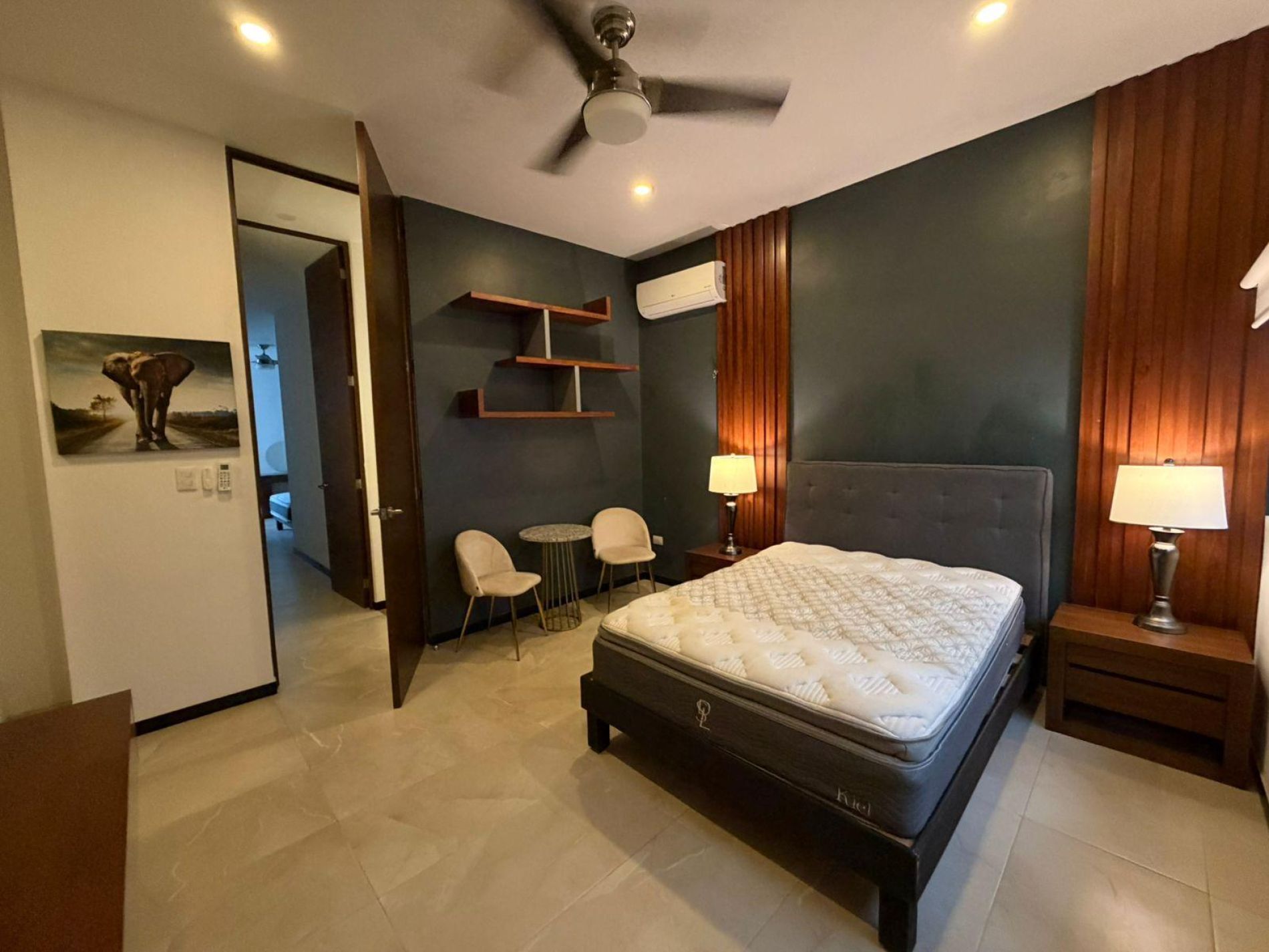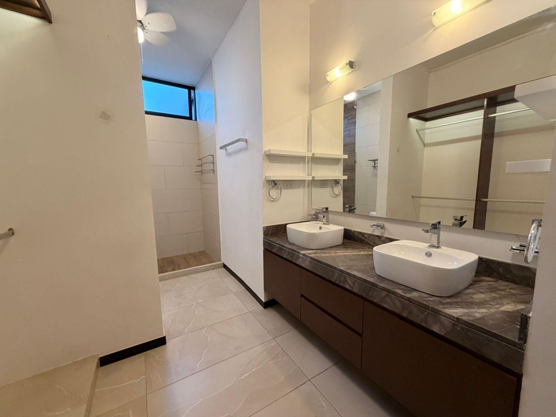 Recámara principal con cama queen size, escritorio baño completo con doble lavabo, clóset vestidor y balcón