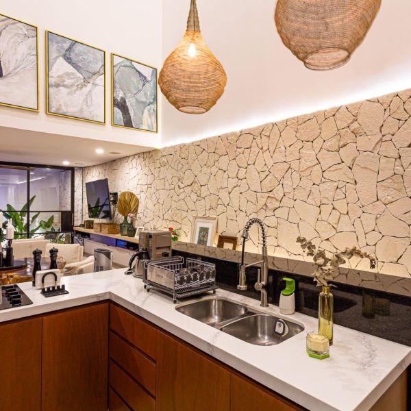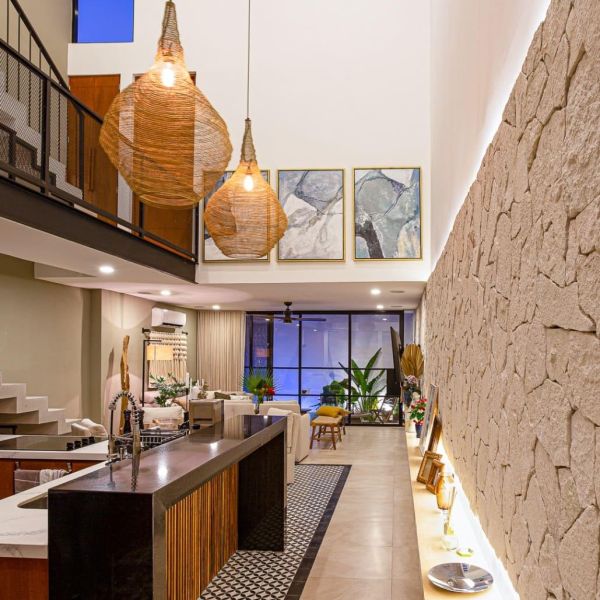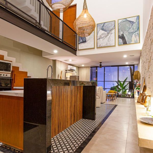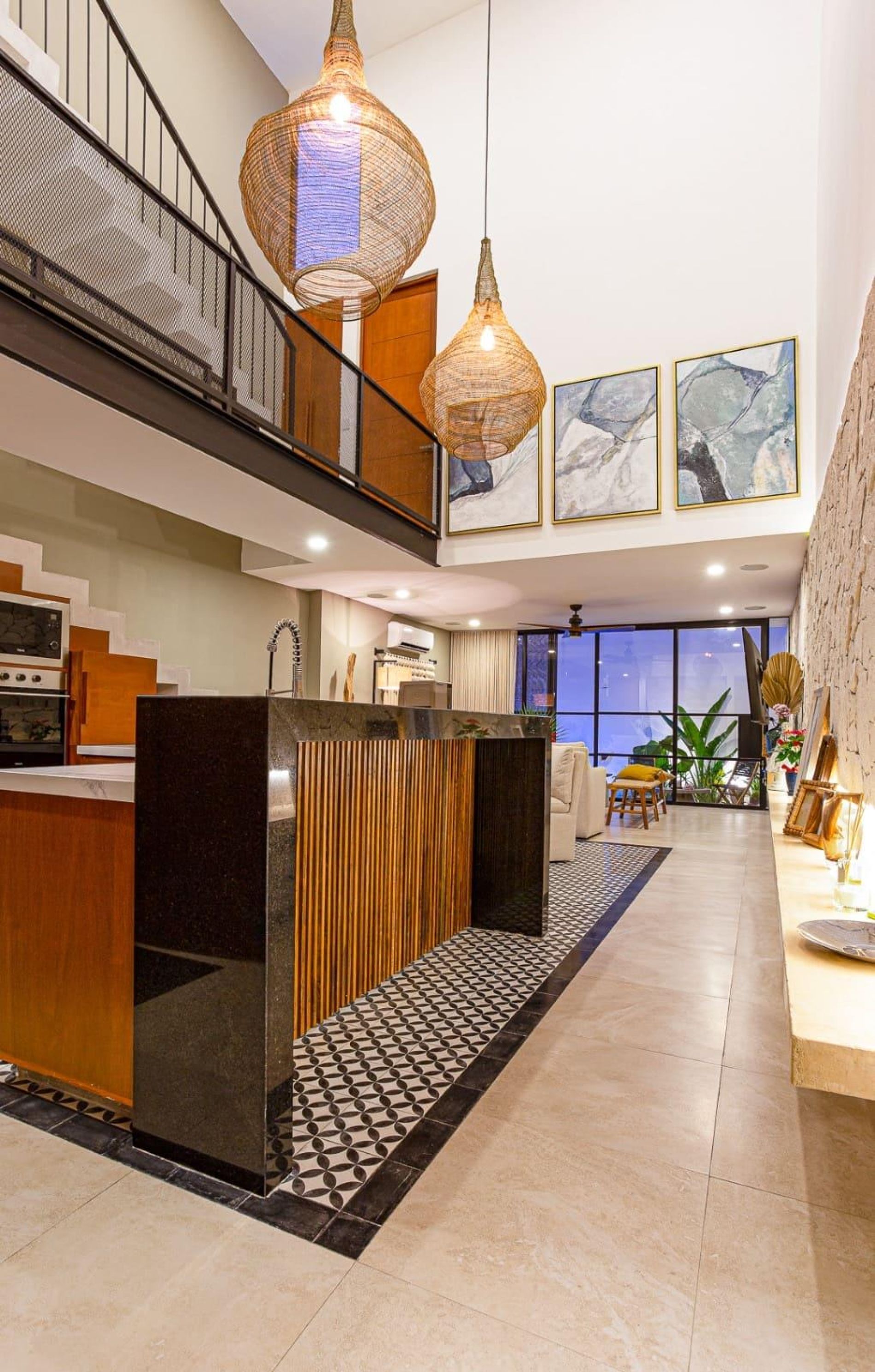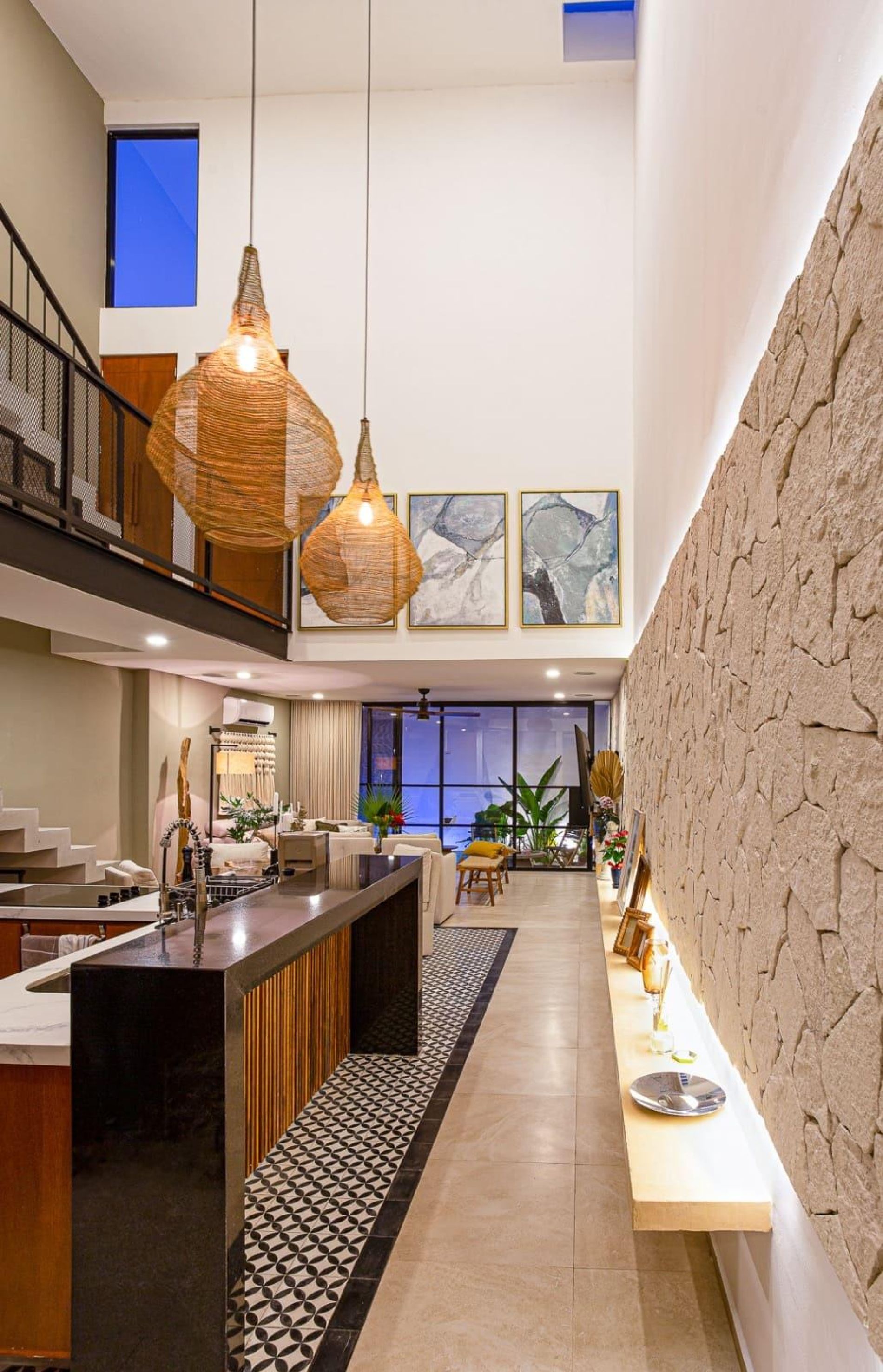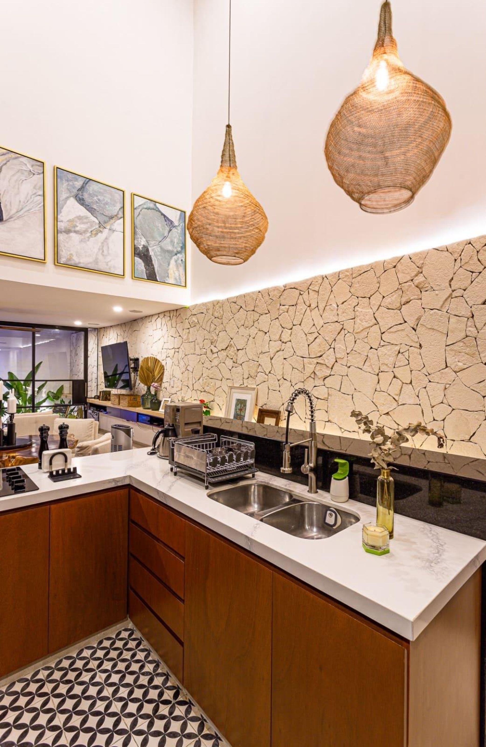 Cocina integral con mueble de alacena empotrado, isla al centro y espacio de comedor a doble altura.