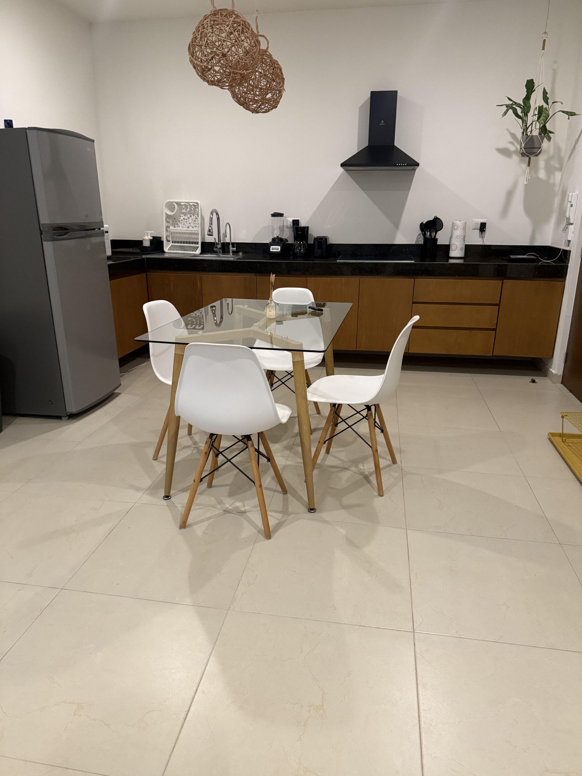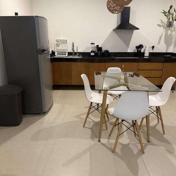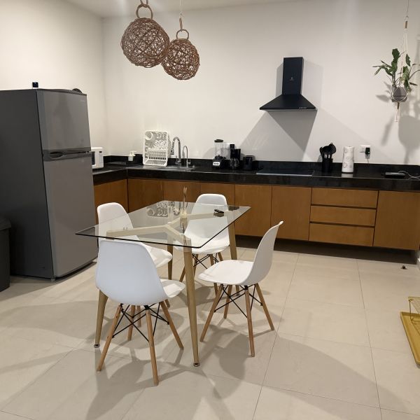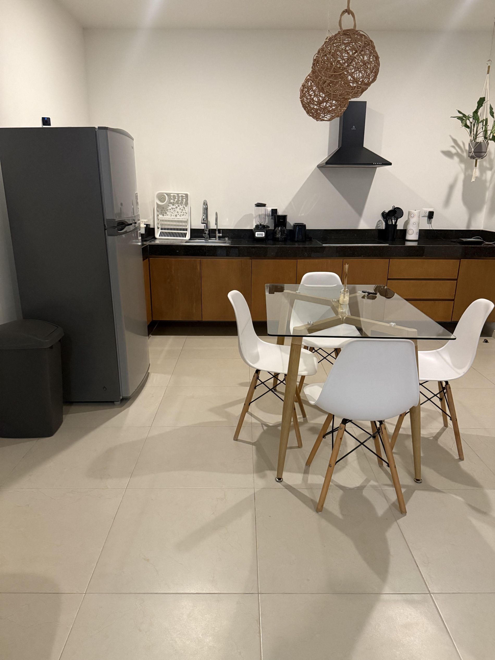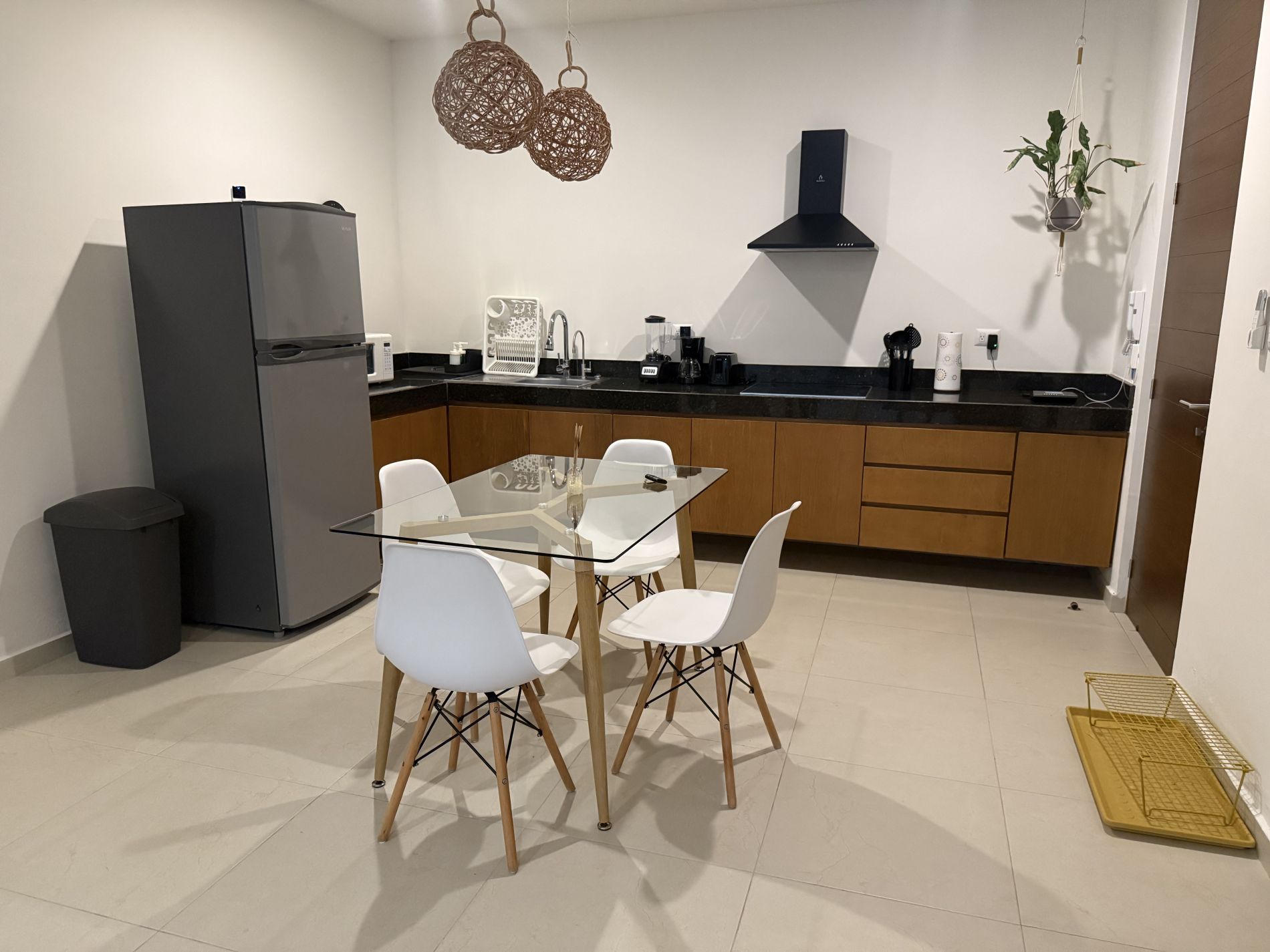 Cocina con refrigerador, microondas, parrilla eléctrica y campana