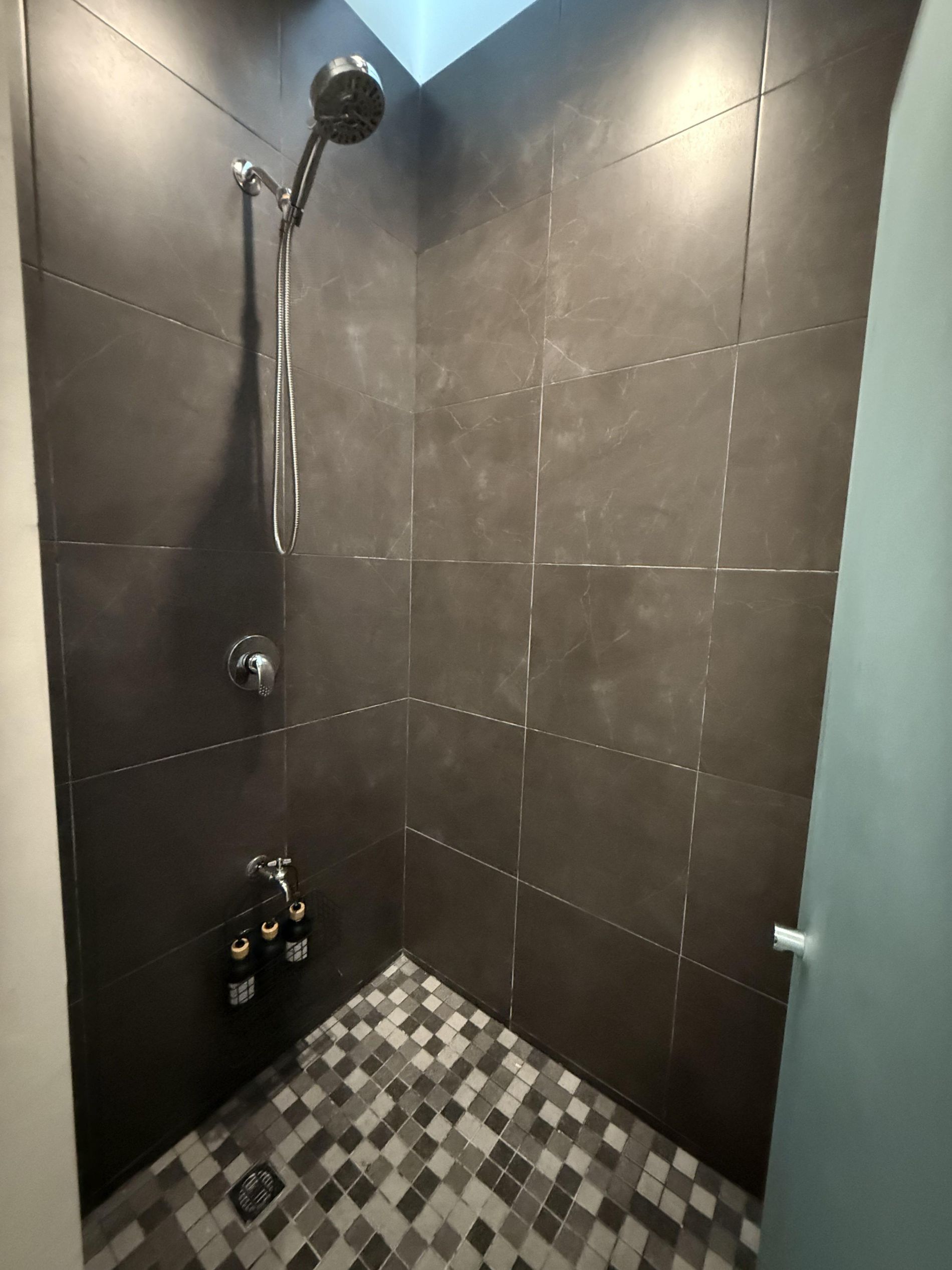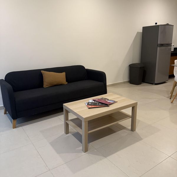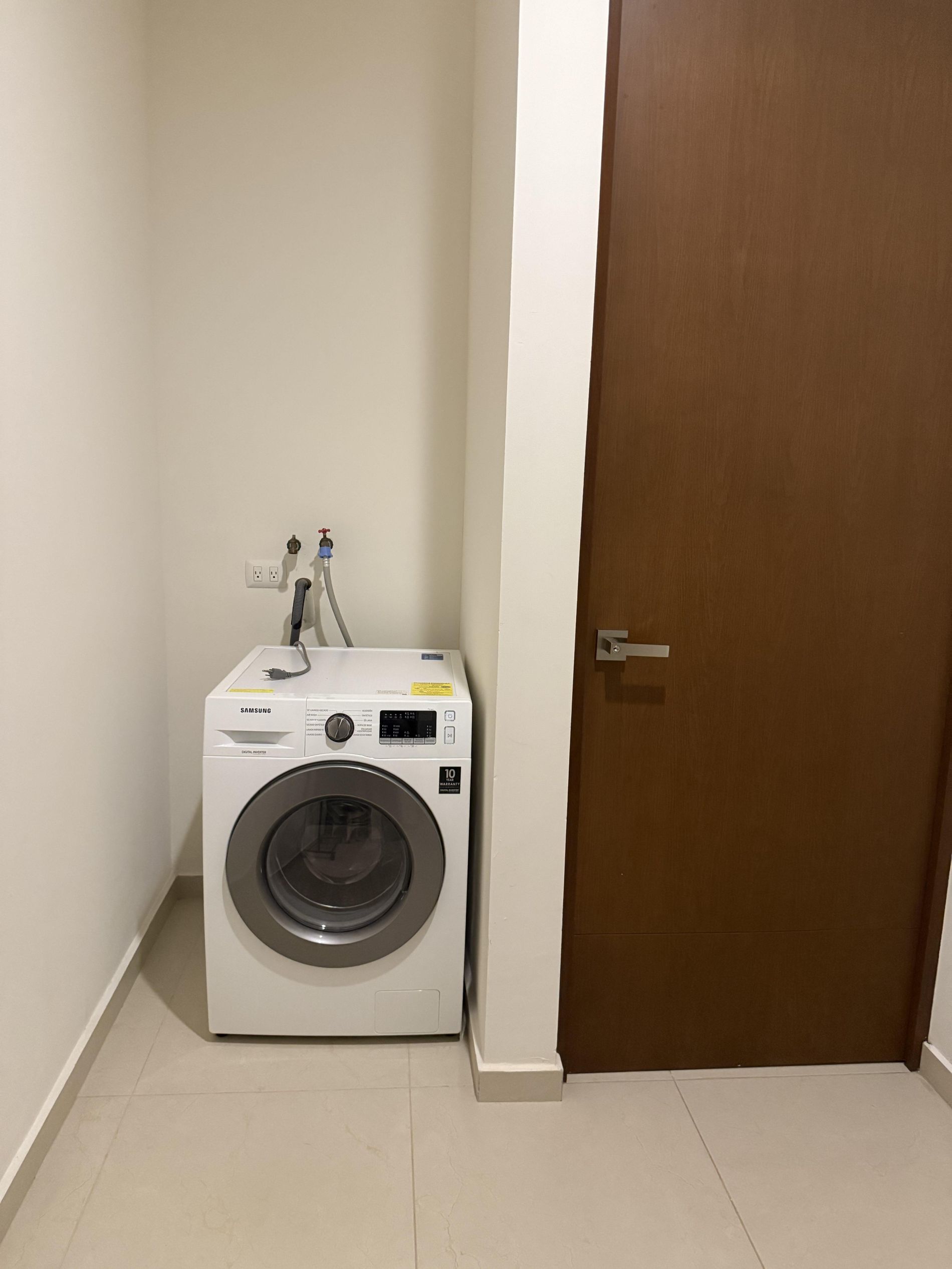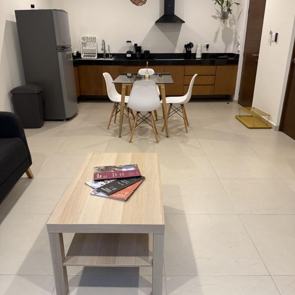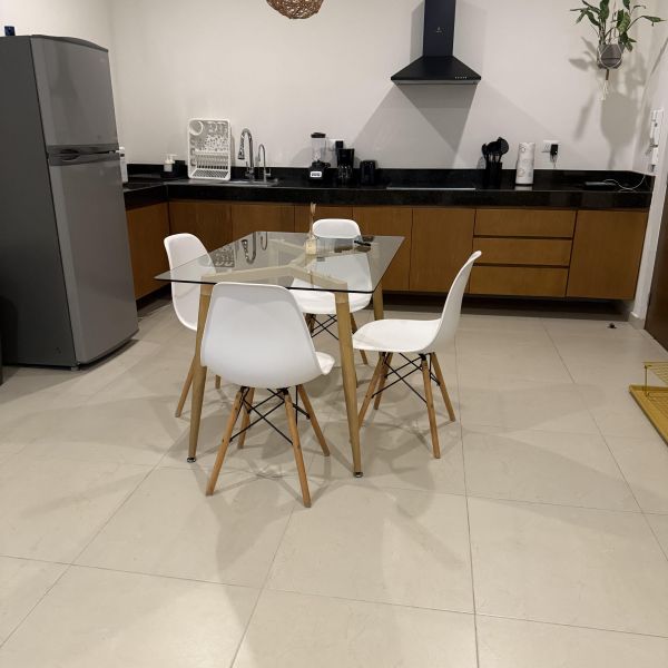 Cocina con refrigerador, microondas, parrilla eléctrica y campana