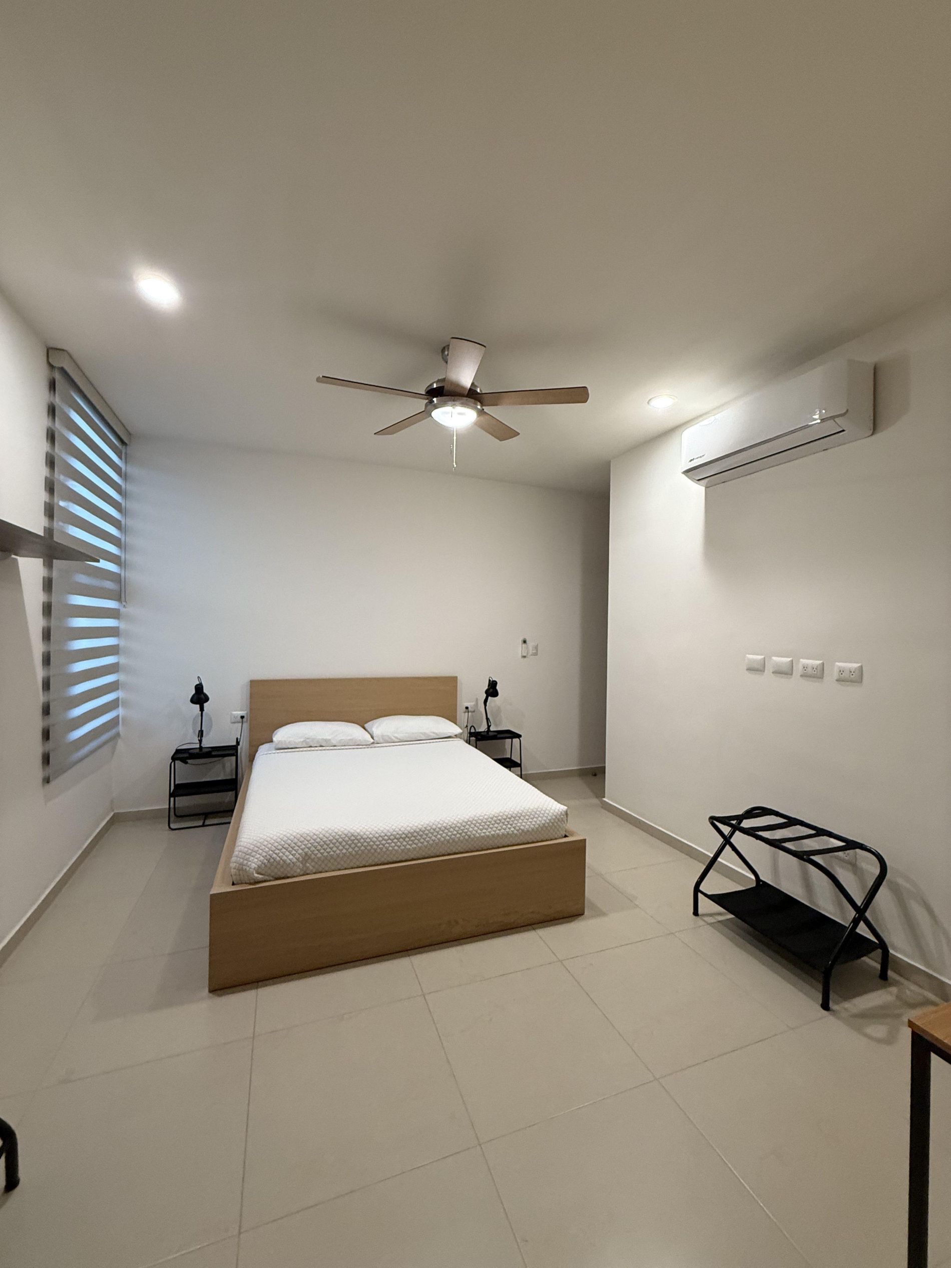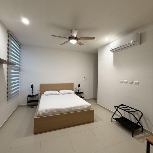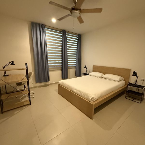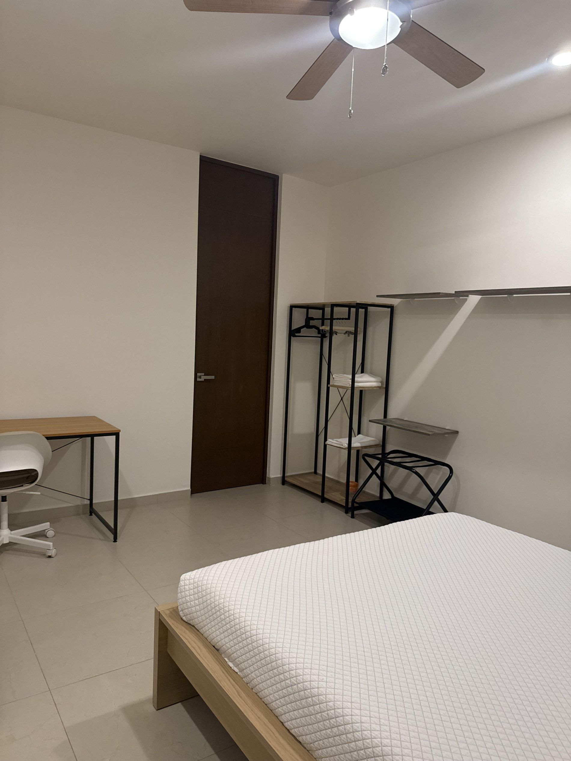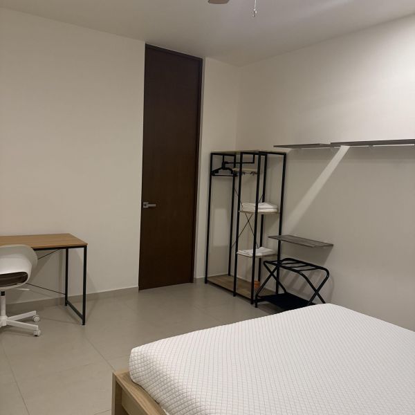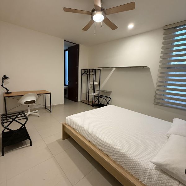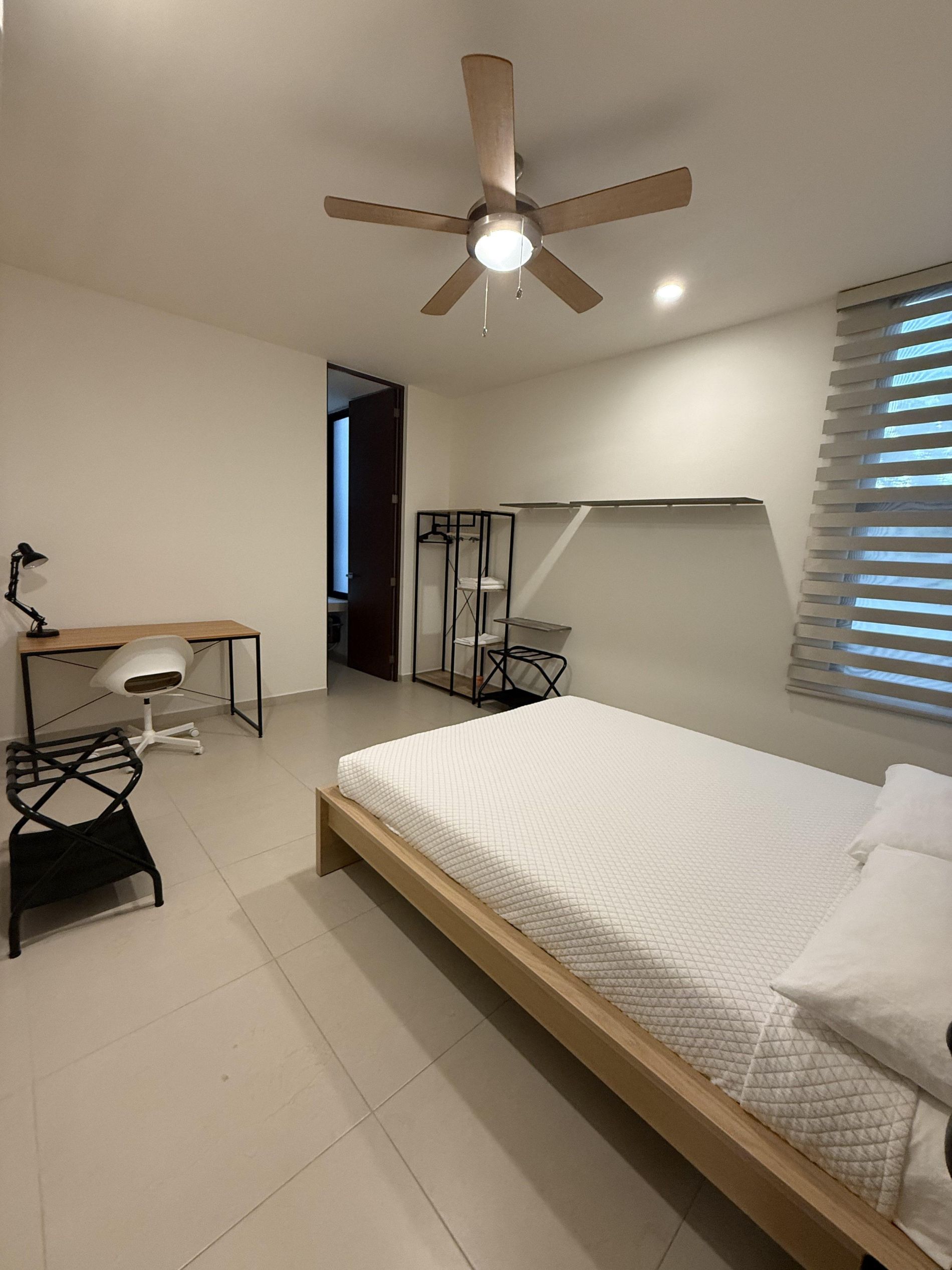 Recámara secundaria con cama matrimonial, escritorio y baño completo.